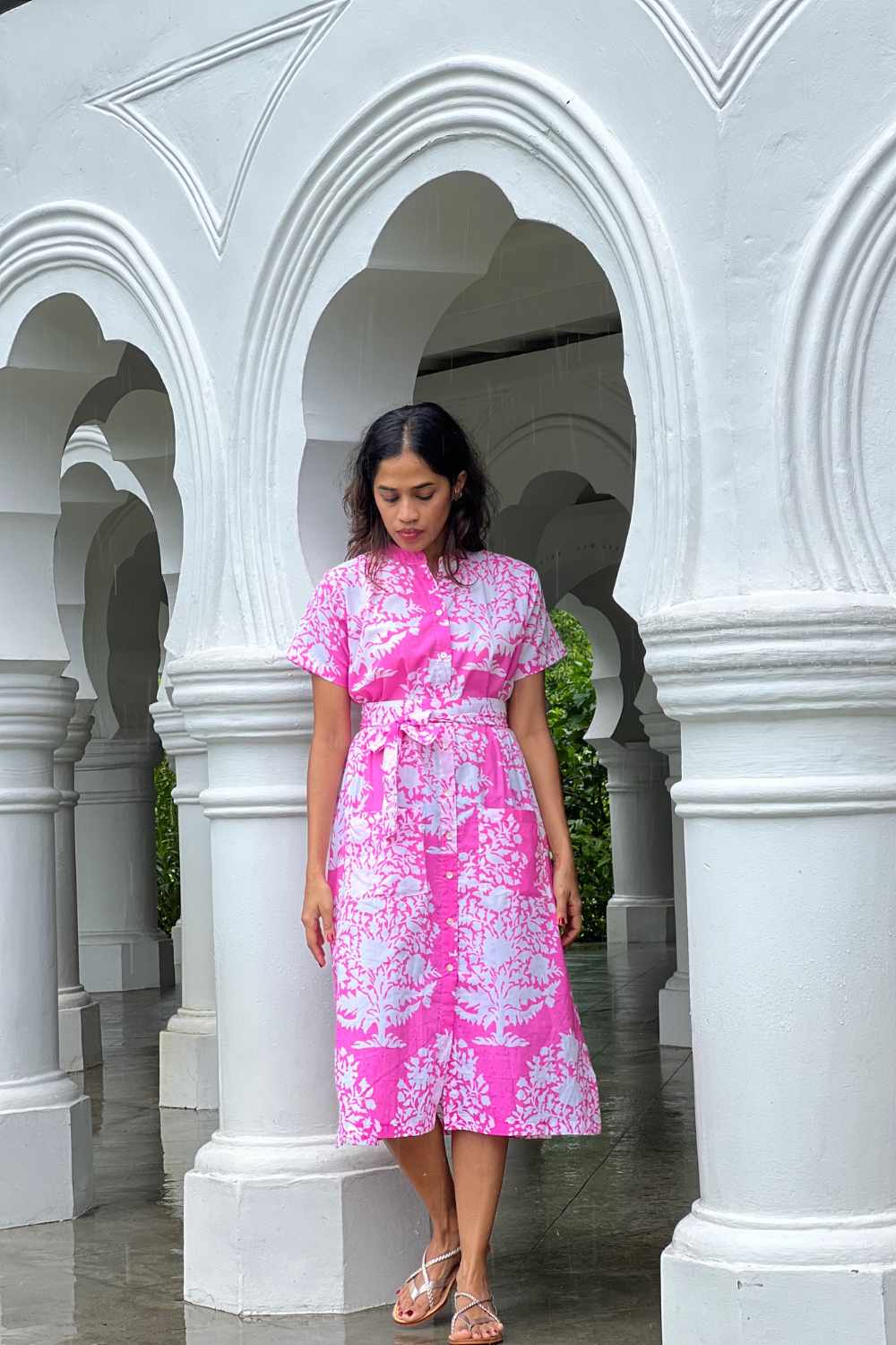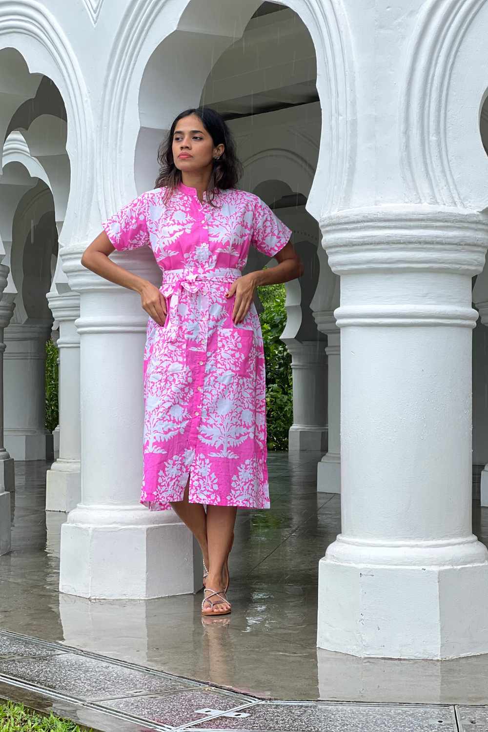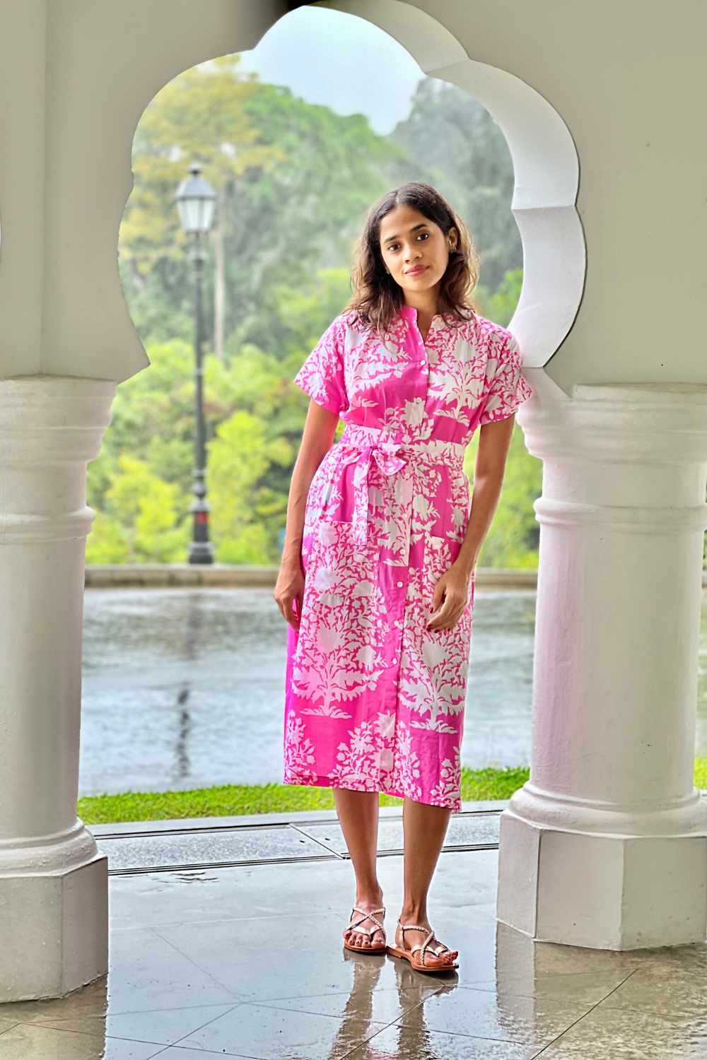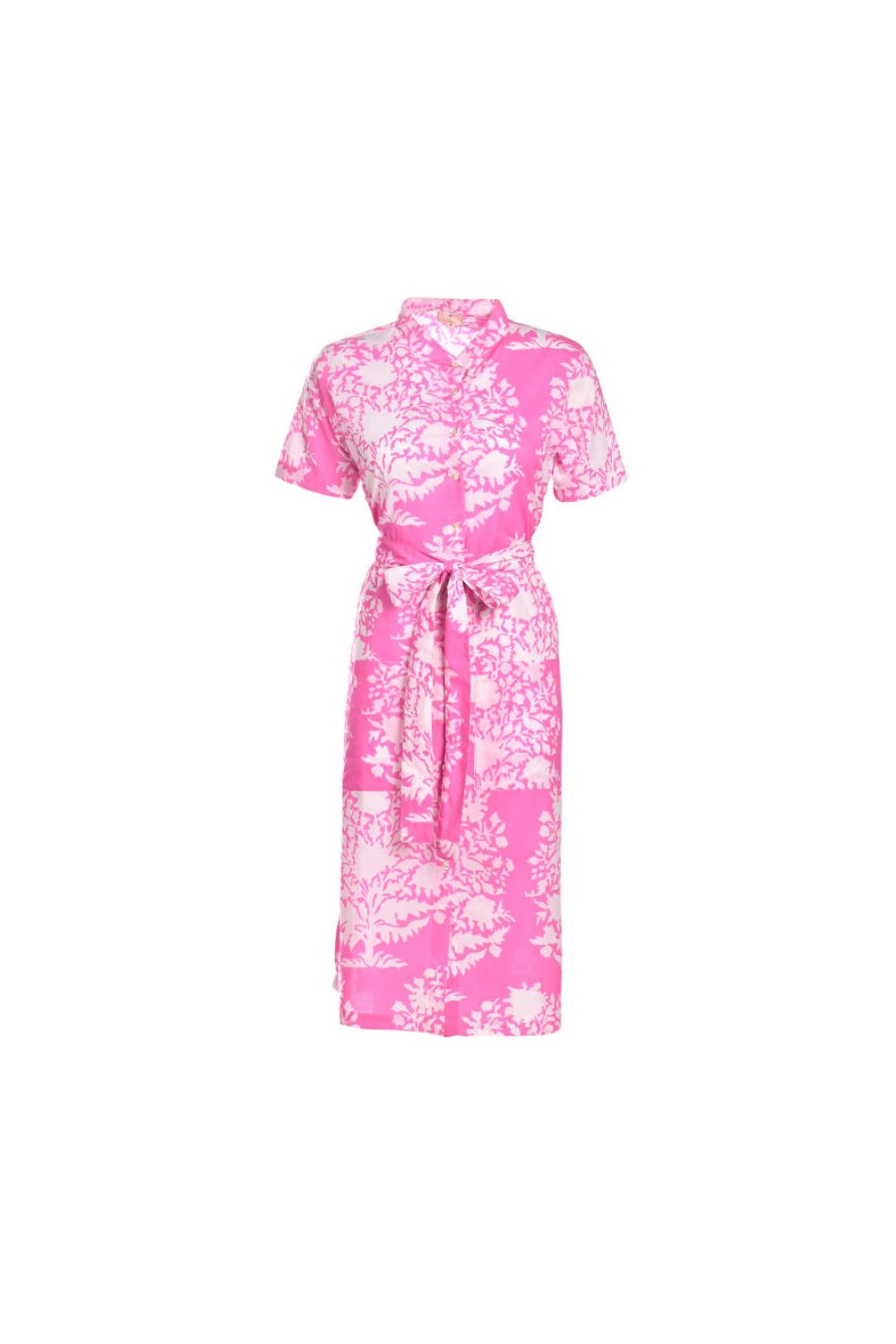 Our casual and easy to wear printed shirt-dress in soft cotton mulmul is an easy wardrobe choice. Mother-of-pearl buttons, along with the belt add a stylish touch.This dress is lined.