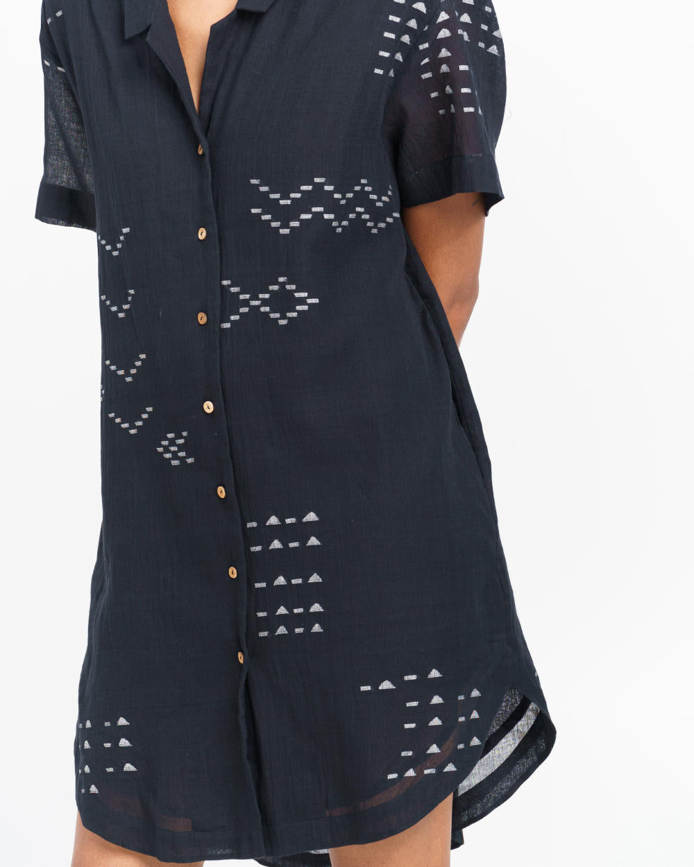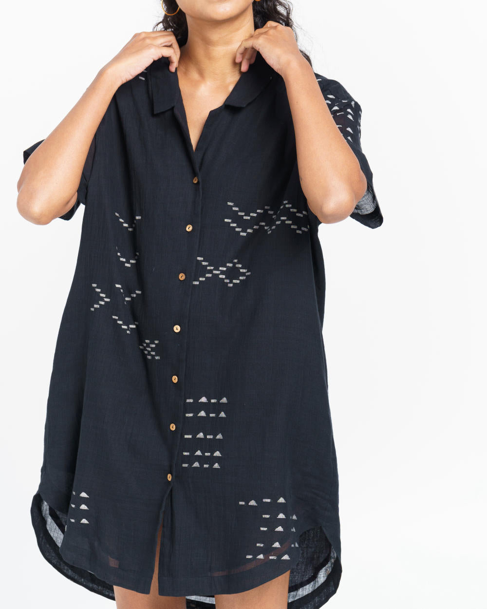 Designed for a boxy fit, this shirt dress is cut from softest cotton fabric handwoven by the skilled weavers of East India. It features a relaxed collar neck with a button-down placket, short sleeves and asymmetric hemline. Style it for all day comfort, casual roundabouts or fuss-free travelling.