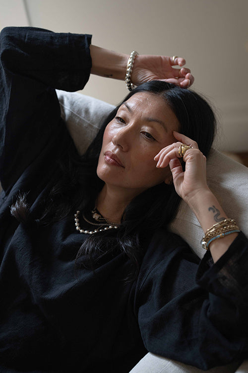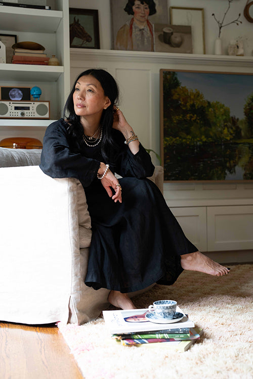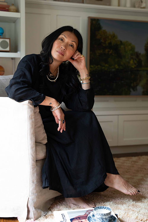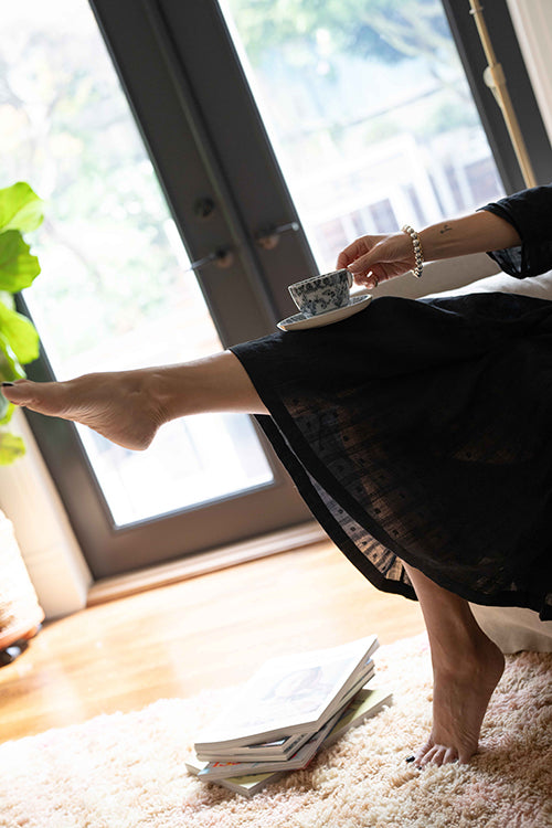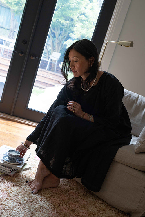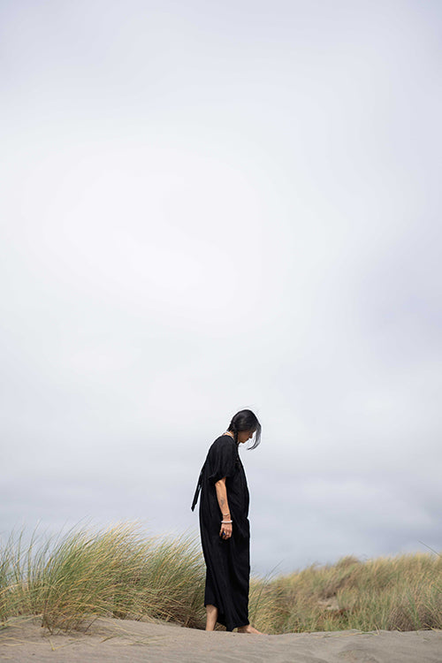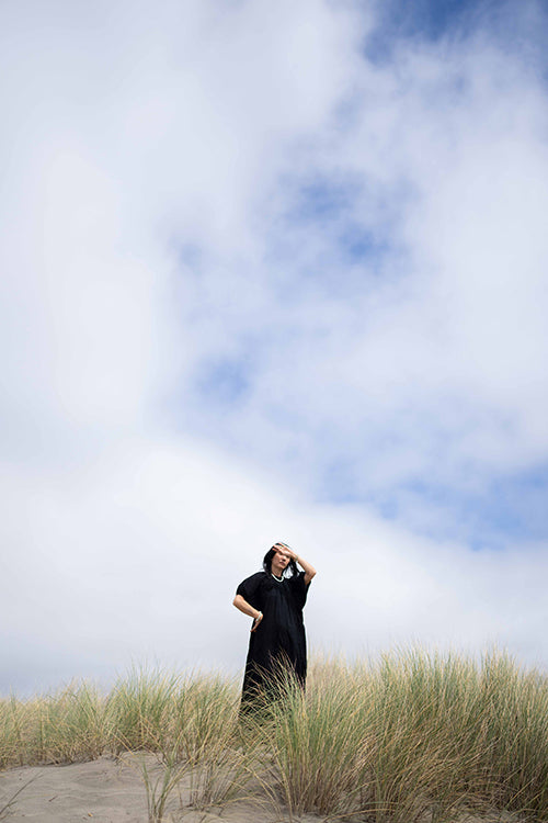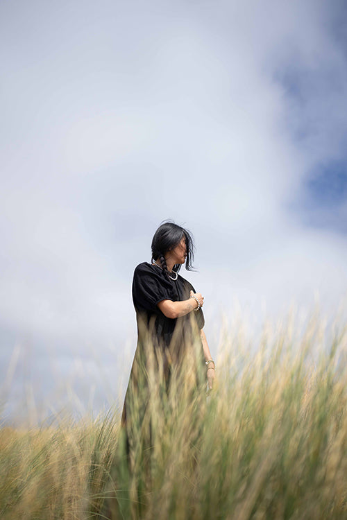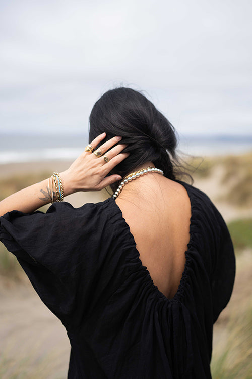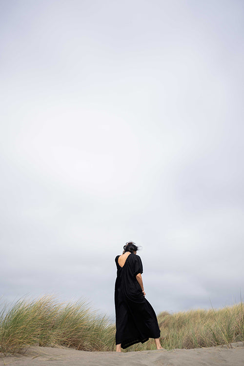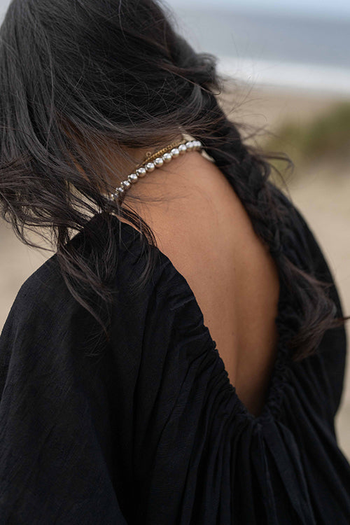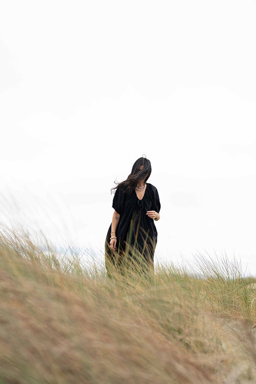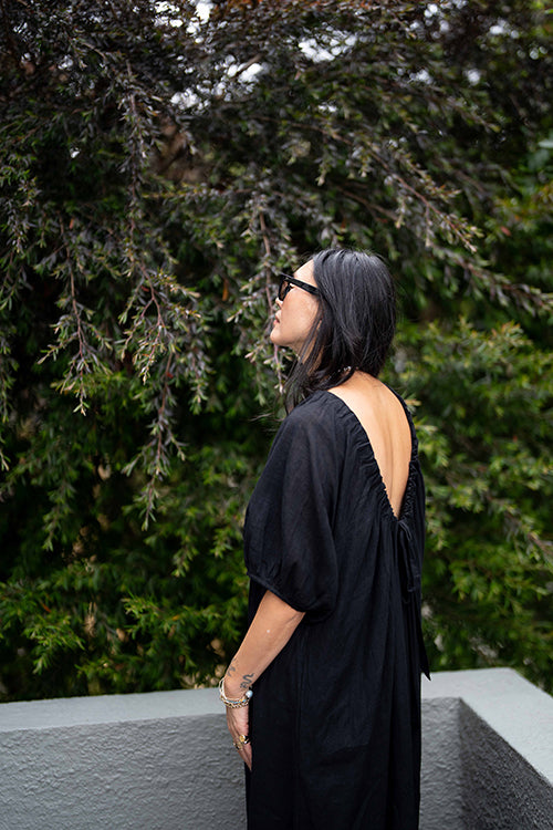 This statement black dress designed in collaboration with meredith peck combines elegance with a comfortable, flowing style. It features an adjustable V-neckline and a beautifully ruched bodice, while the romantic, puffy short sleeves add a touch of flair. This versatile piece can be dressed up with statement jewelry and heels for an evening event or paired with sandals for a relaxed, daytime look.