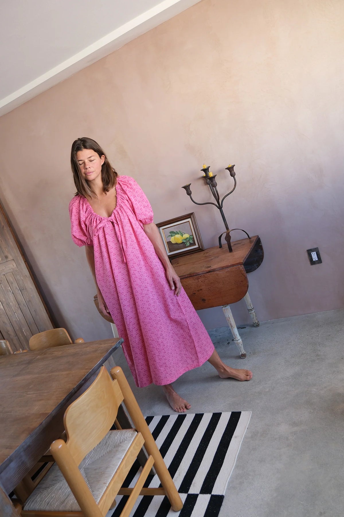 In collaboration with Meredith Peck, this elegant block-printed pink dress combines a comfortable, flowing style with a beautifully ruched bodice and an adjustable V-neckline with a front tie-up. The romantic, puffy short sleeves add a touch of flair, making this a versatile piece for a relaxed, daytime look.