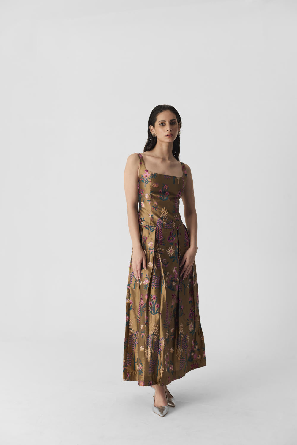 This elegant dress is made from luxurious pure silk, adorned with a beautiful Bahar print, crafted through traditional hand-block printing. The design features a chic boxy silhouette, complemented by a perfectly fitted yoke for added structure. The upper body is tailored with princess panels, while the skirt boasts inverted box pleats, giving it a flattering, full shape. At the back, a deep U-neck adds a touch of sophistication, with a concealed center-back zipper ensuring a seamless, flawless fit.