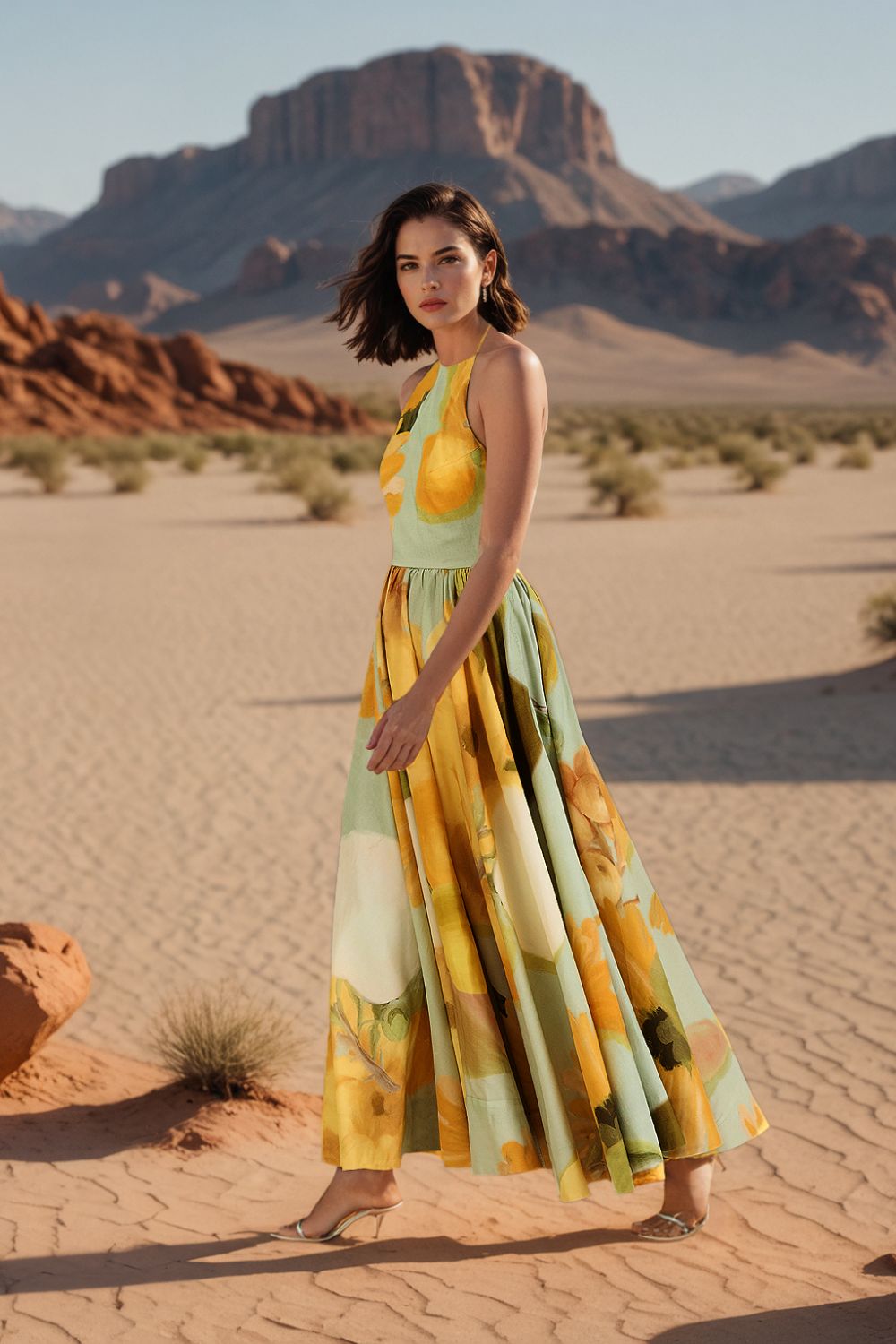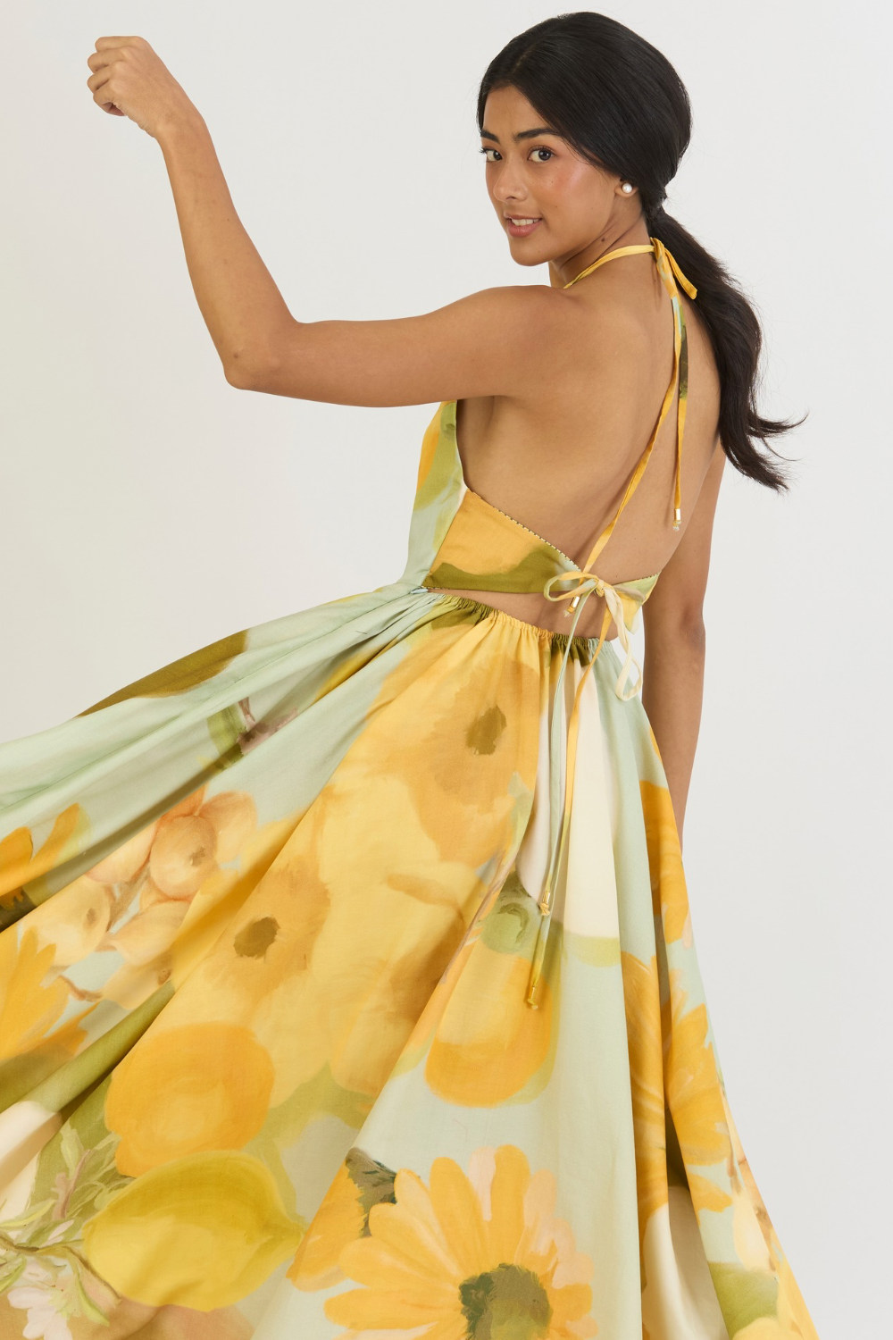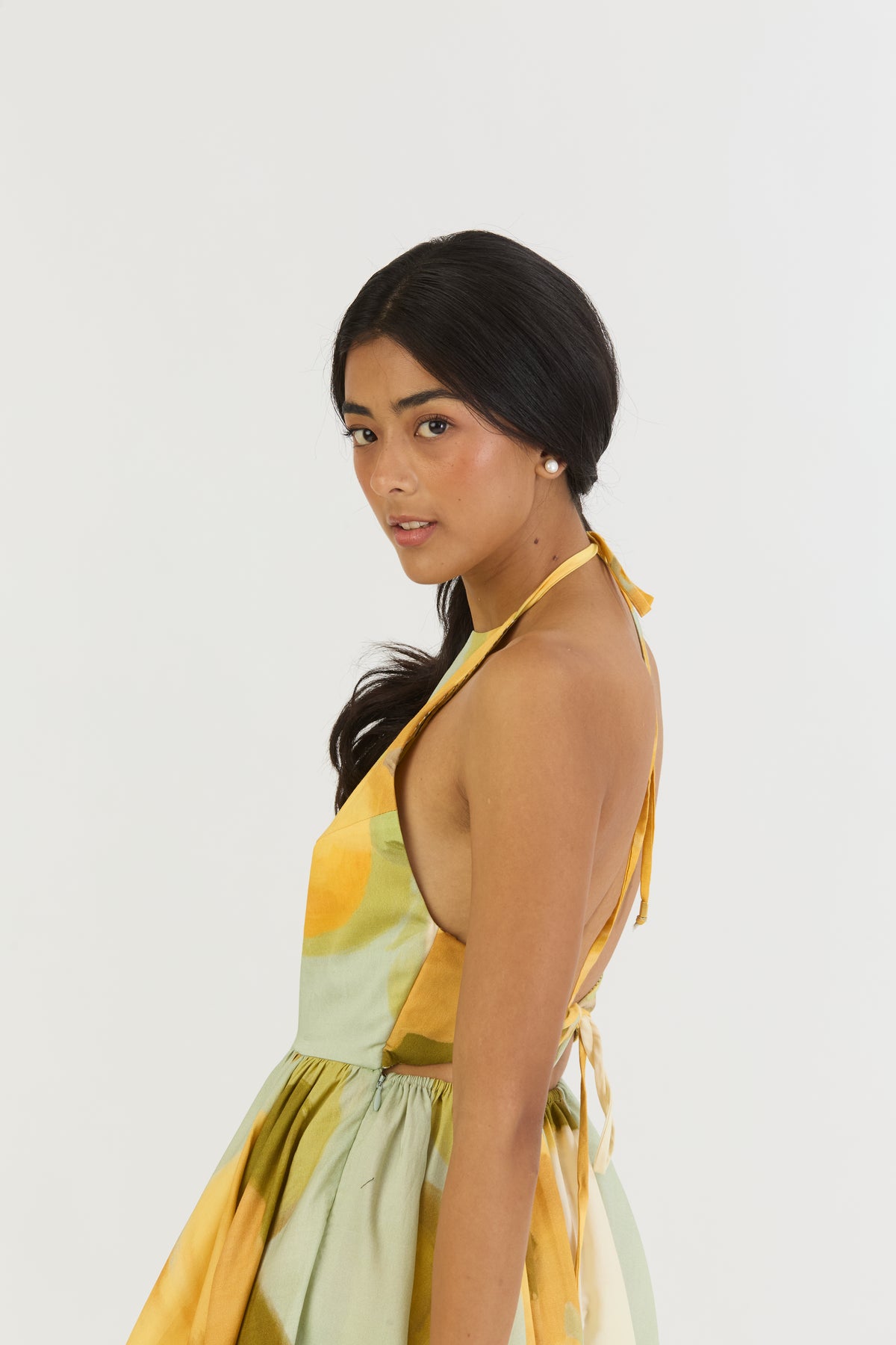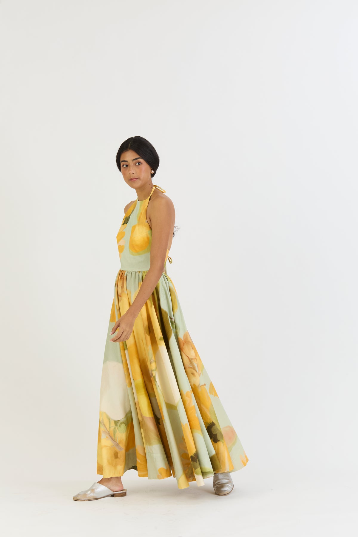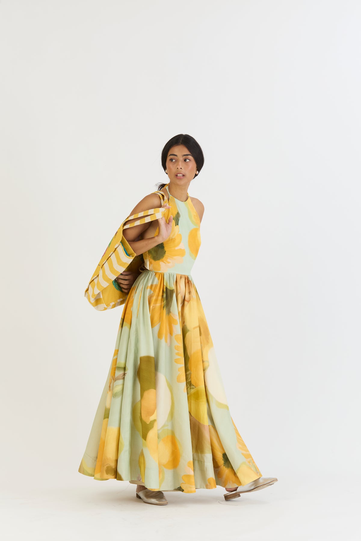 This elegant piece features a halter neck with stylish neck and back tie-ups, ensuring a perfect fit. The waistline is accentuated with gathered skirt detailing, while a convenient pocket is seamlessly attached on the right side.