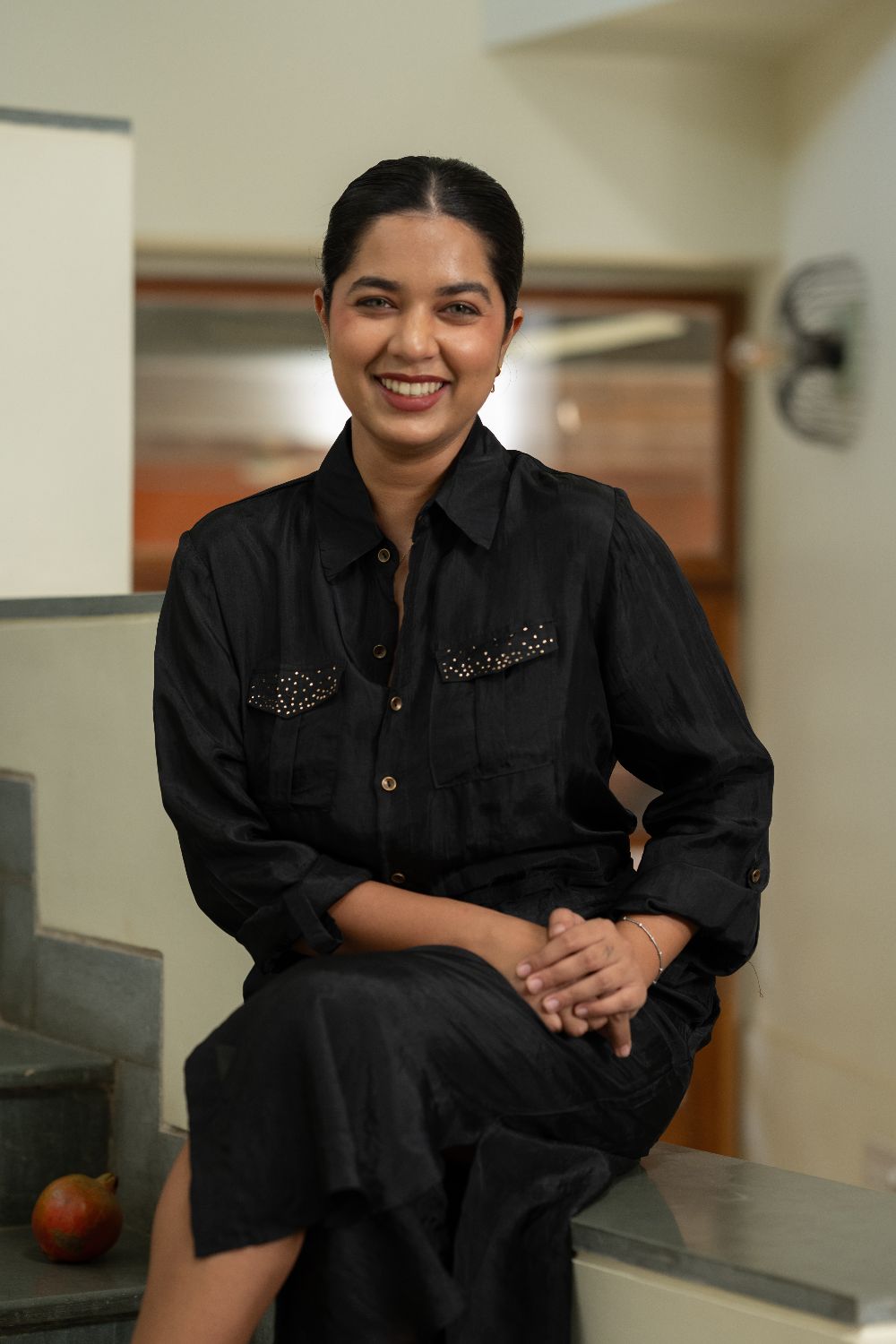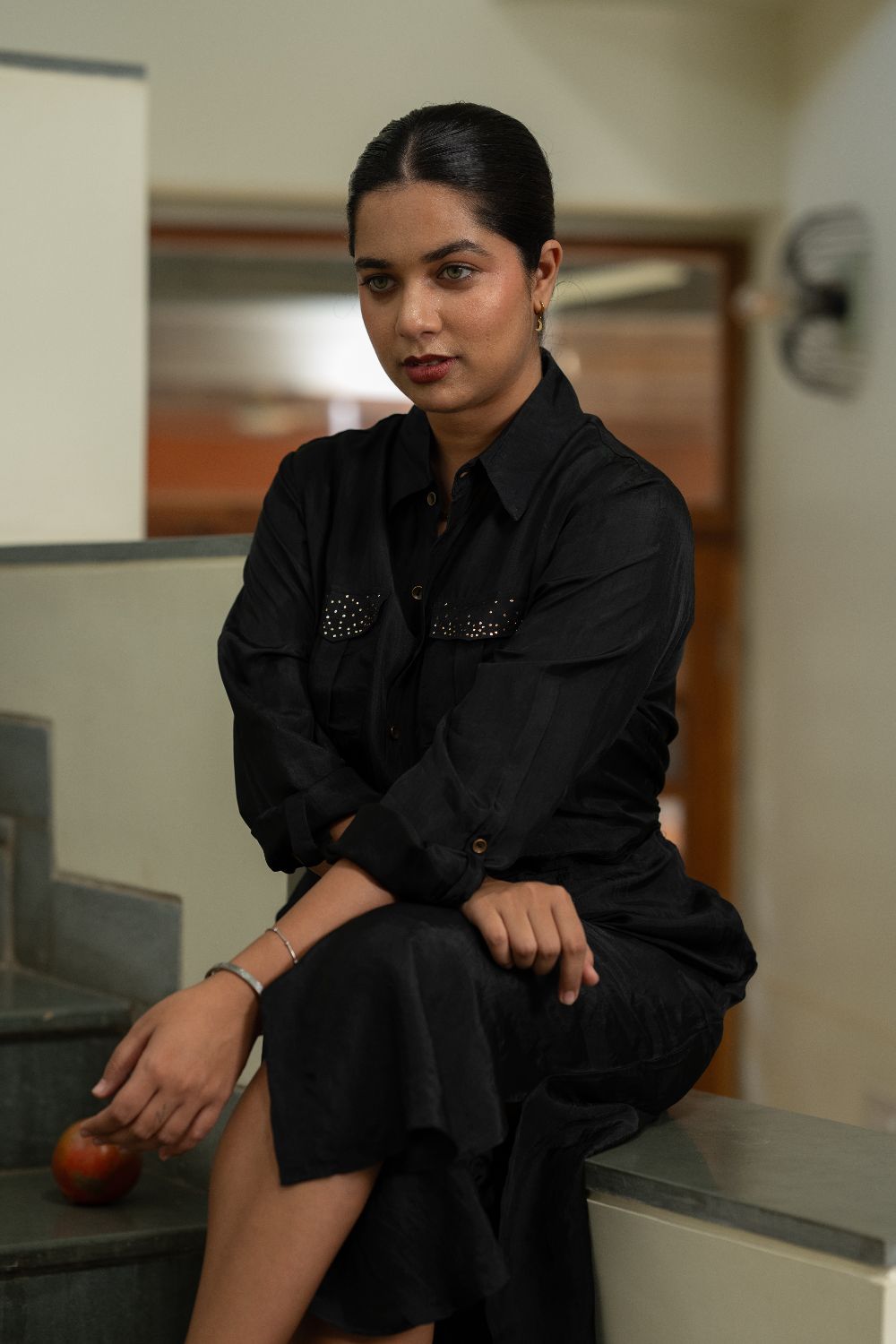A shirt dress that flows like liquid, catching the light with every turn. Detailed with delicate badla embroidery along the collar, pockets, and sleeves, it’s effortless yet statement-making. Wear it as a dress, belt it for structure, or layer it over trousers as an open cape.