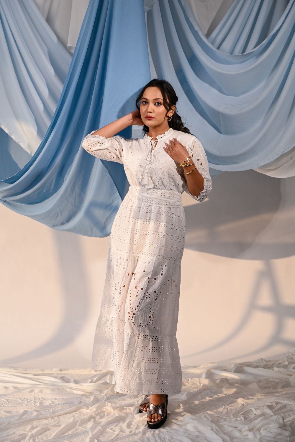 A maxi eyelet dress in soft cotton. finished with a belt to create a cinched silhouette and tasseled cords.