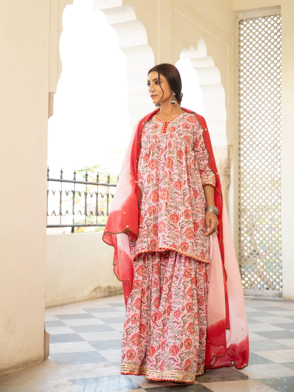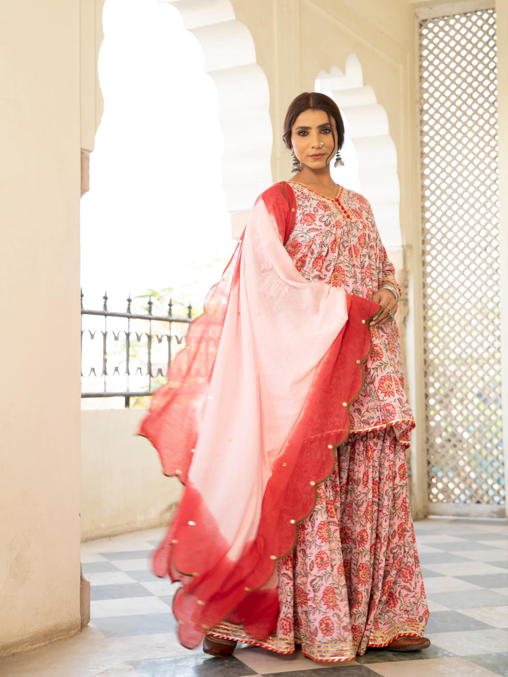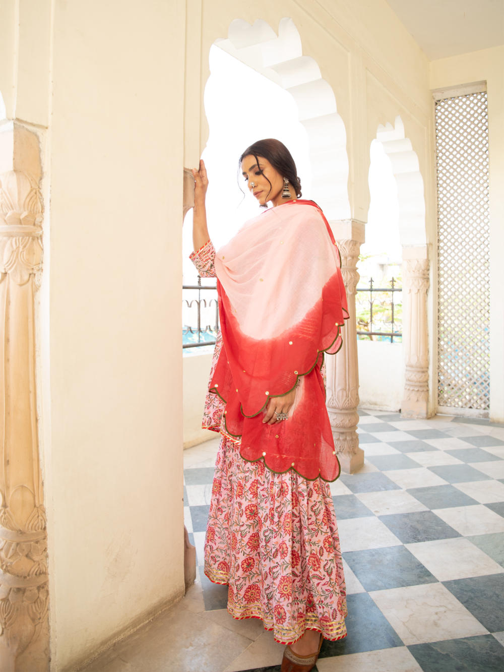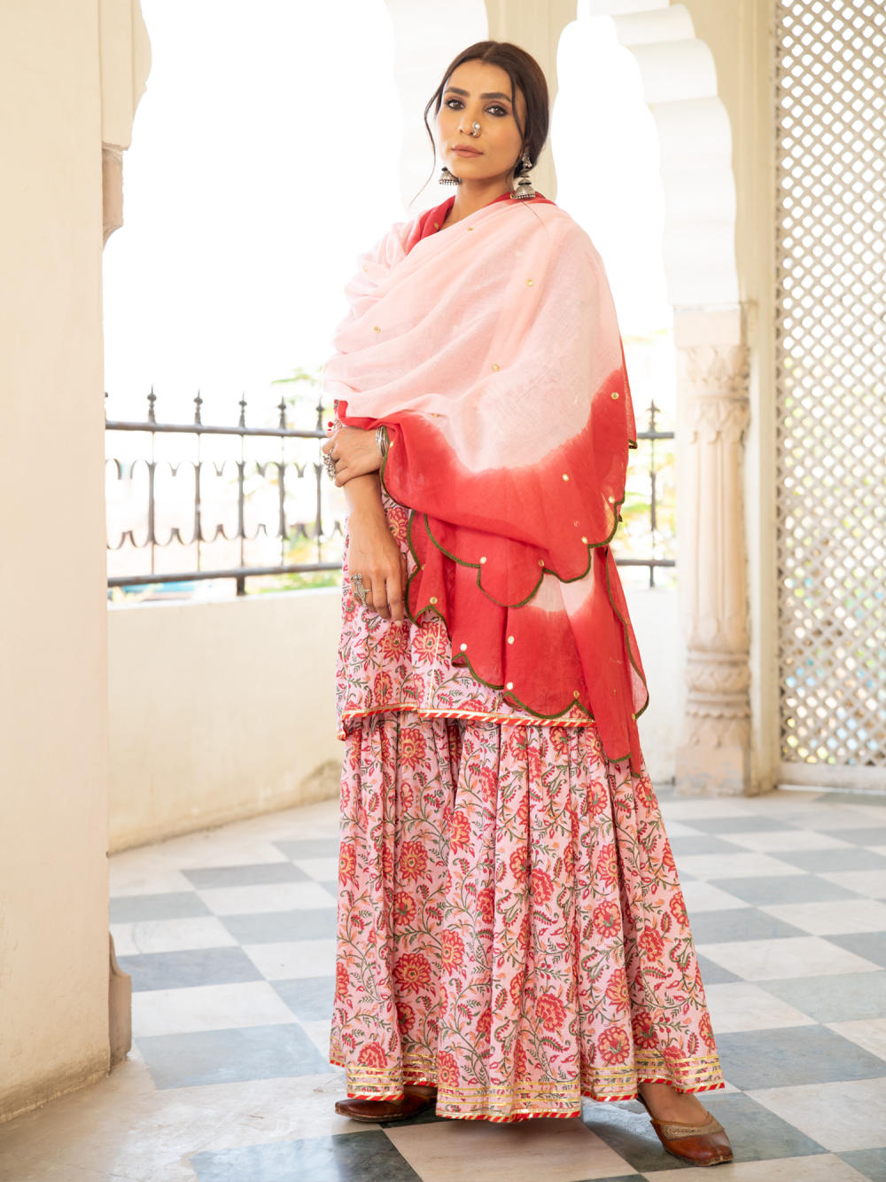 A poetic rendetion of a summer festive collection that makes you nostalgic, in classic luminous block prints. Handcrafted on a bed of fine cotton, mul and doria in hues of pastels. Perfect for light occasions. A set of 3 consists of kurta, sharara & dupatta. KURTA: A gathered ghera kurta in baby pink with gota detailing and bijiya lace on a handblock printed floral base. PANTS: A handblock printed flowy layered sharara in mul. DUPATTA: A stunning ombre dupatta with scalloped edges and mirror highlights.