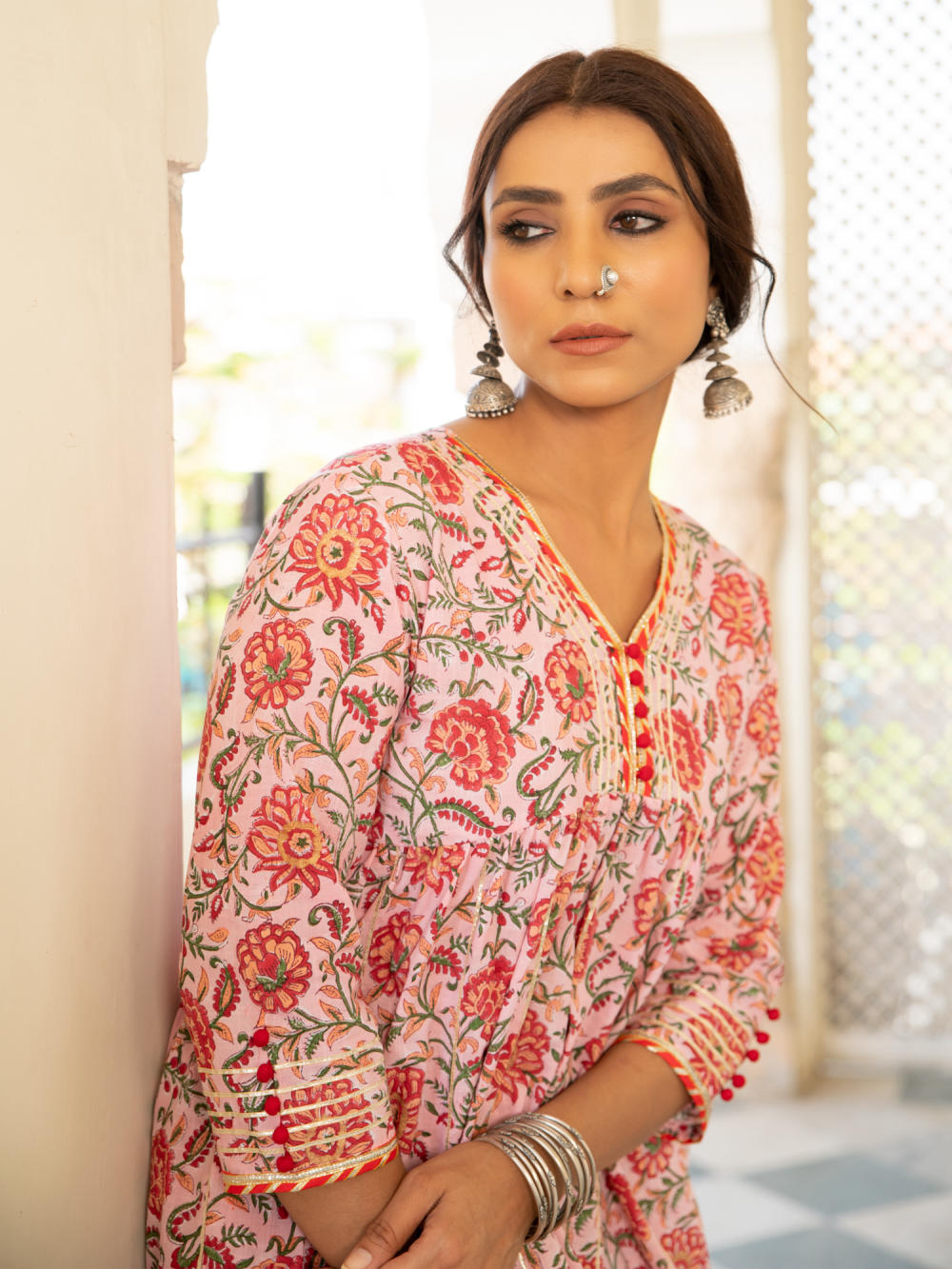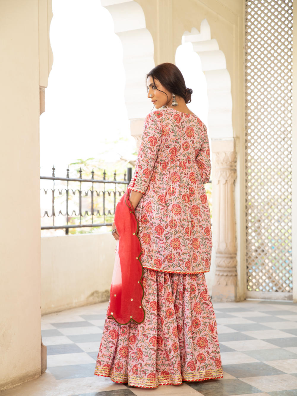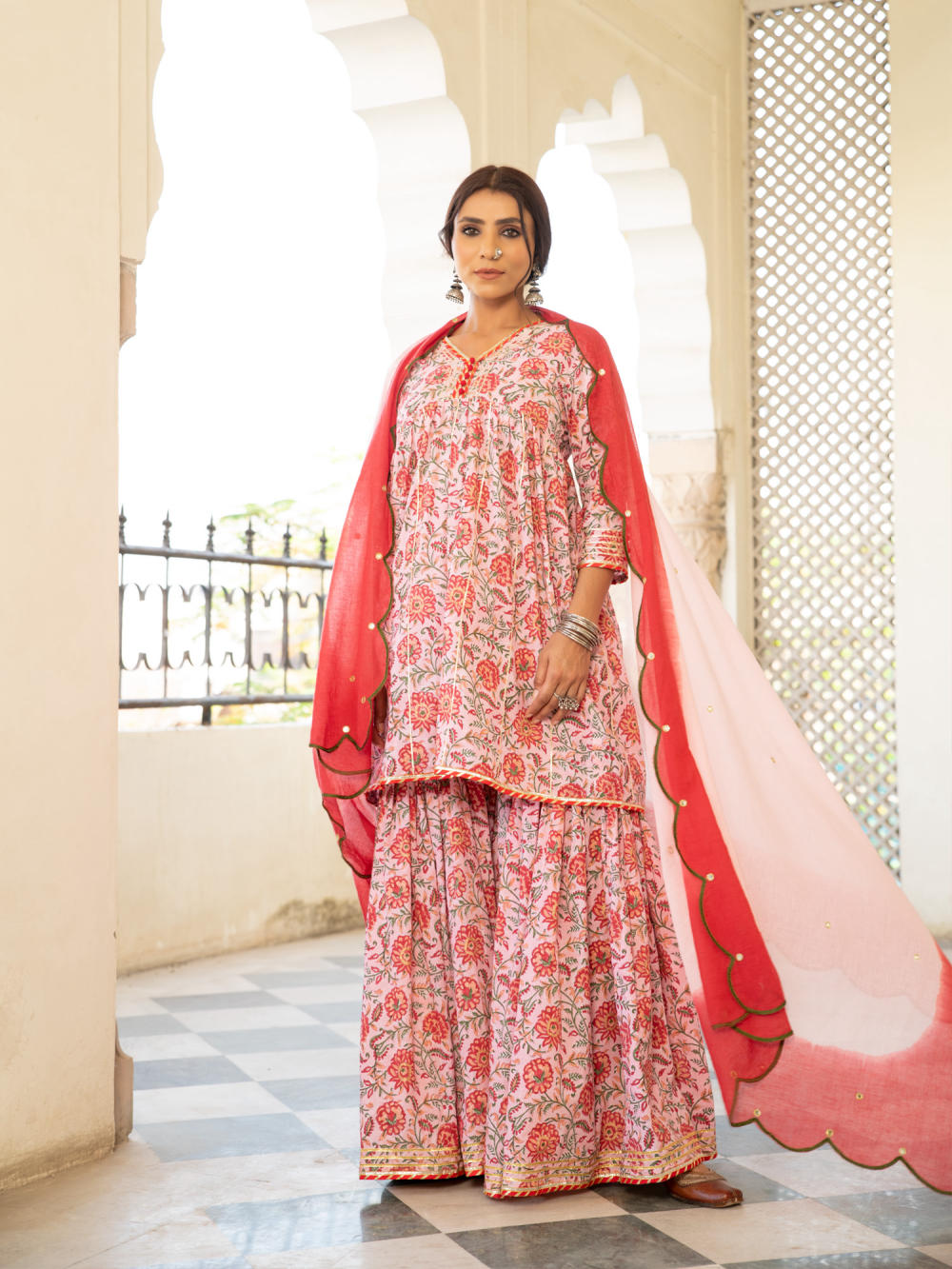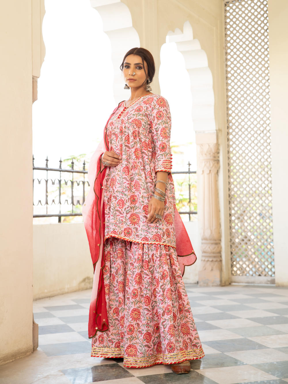 A poetic rendetion of a summer festive collection that makes you nostalgic, in classic luminous block prints. Handcrafted on a bed of fine cotton, mul and doria in hues of pastels. Perfect for light occasions. A set of 3 consists of kurta, sharara & dupatta. KURTA: A gathered ghera kurta in baby pink with gota detailing and bijiya lace on a handblock printed floral base. PANTS: A handblock printed flowy layered sharara in mul. DUPATTA: A stunning ombre dupatta with scalloped edges and mirror highlights.