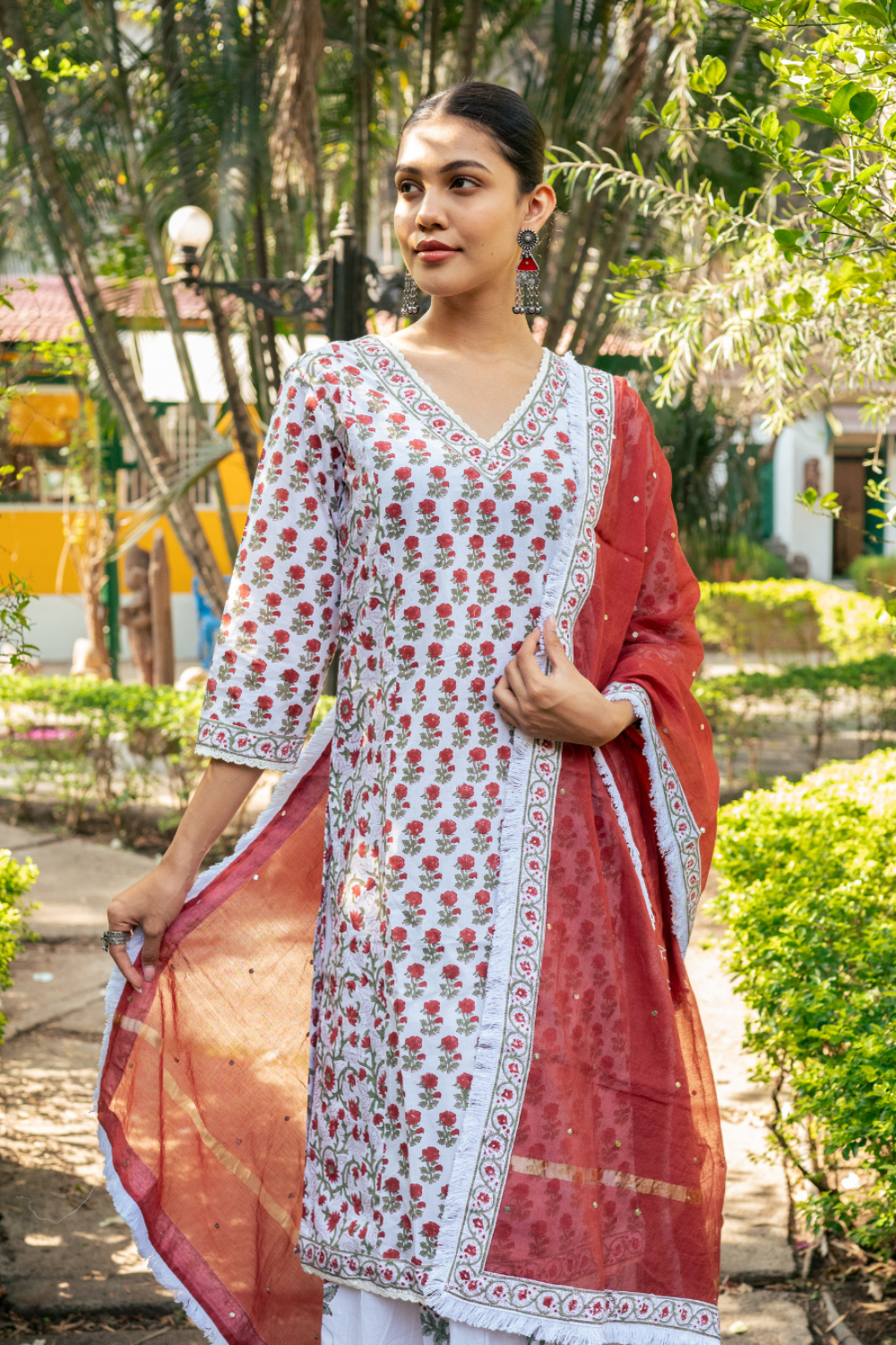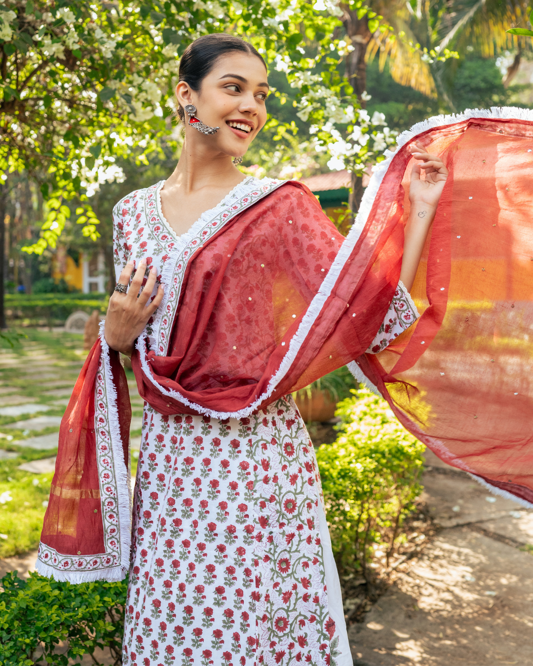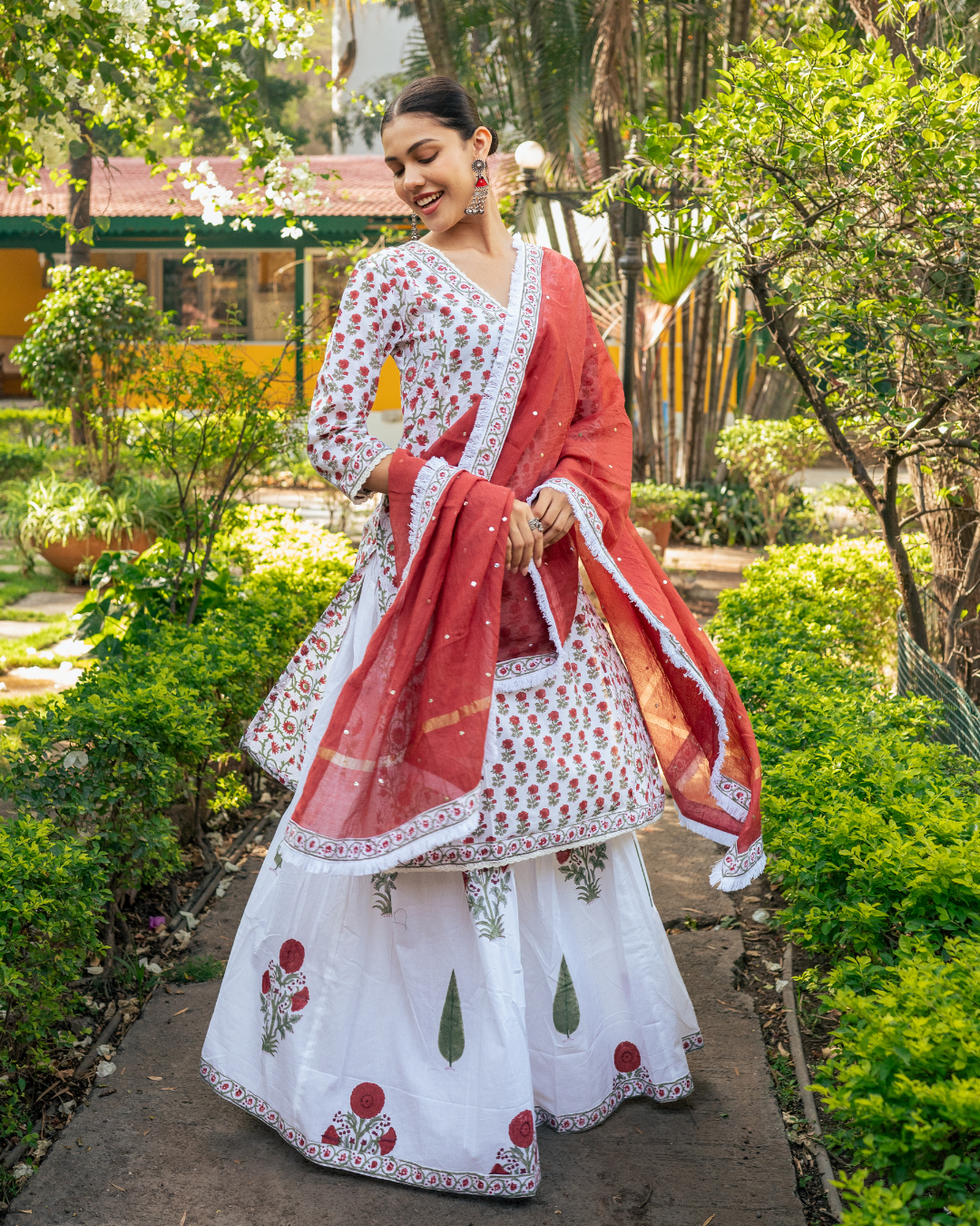 An elegant ensemble combining ivory and red hues, adorned with intricate hand block prints, defines this stunning skirt set.