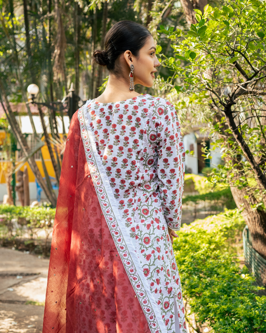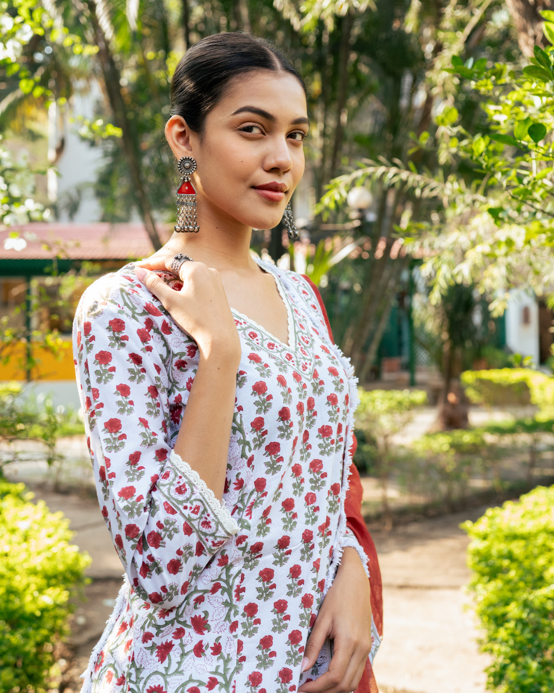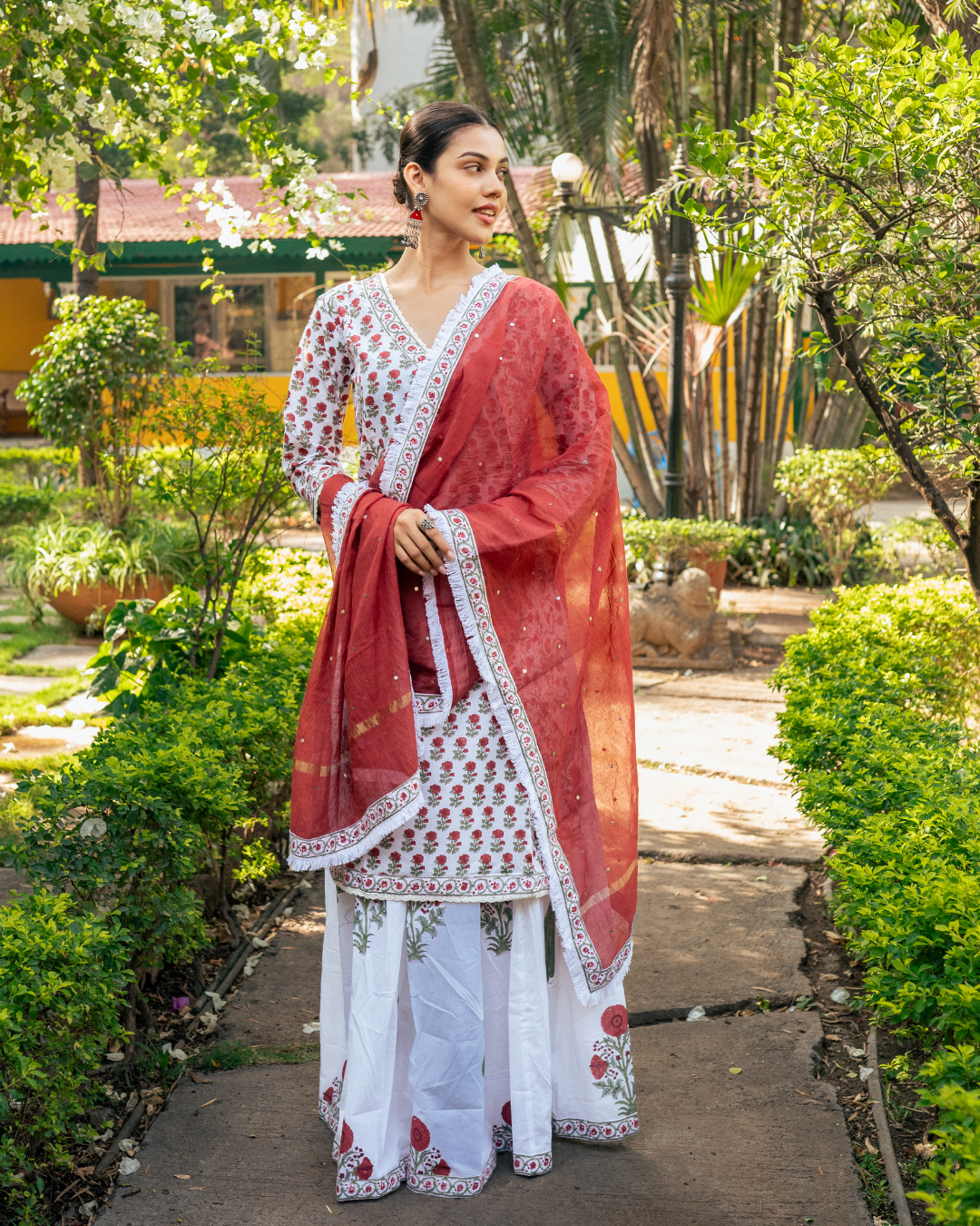 An elegant ensemble combining ivory and red hues, adorned with intricate hand block prints, defines this stunning skirt set.
