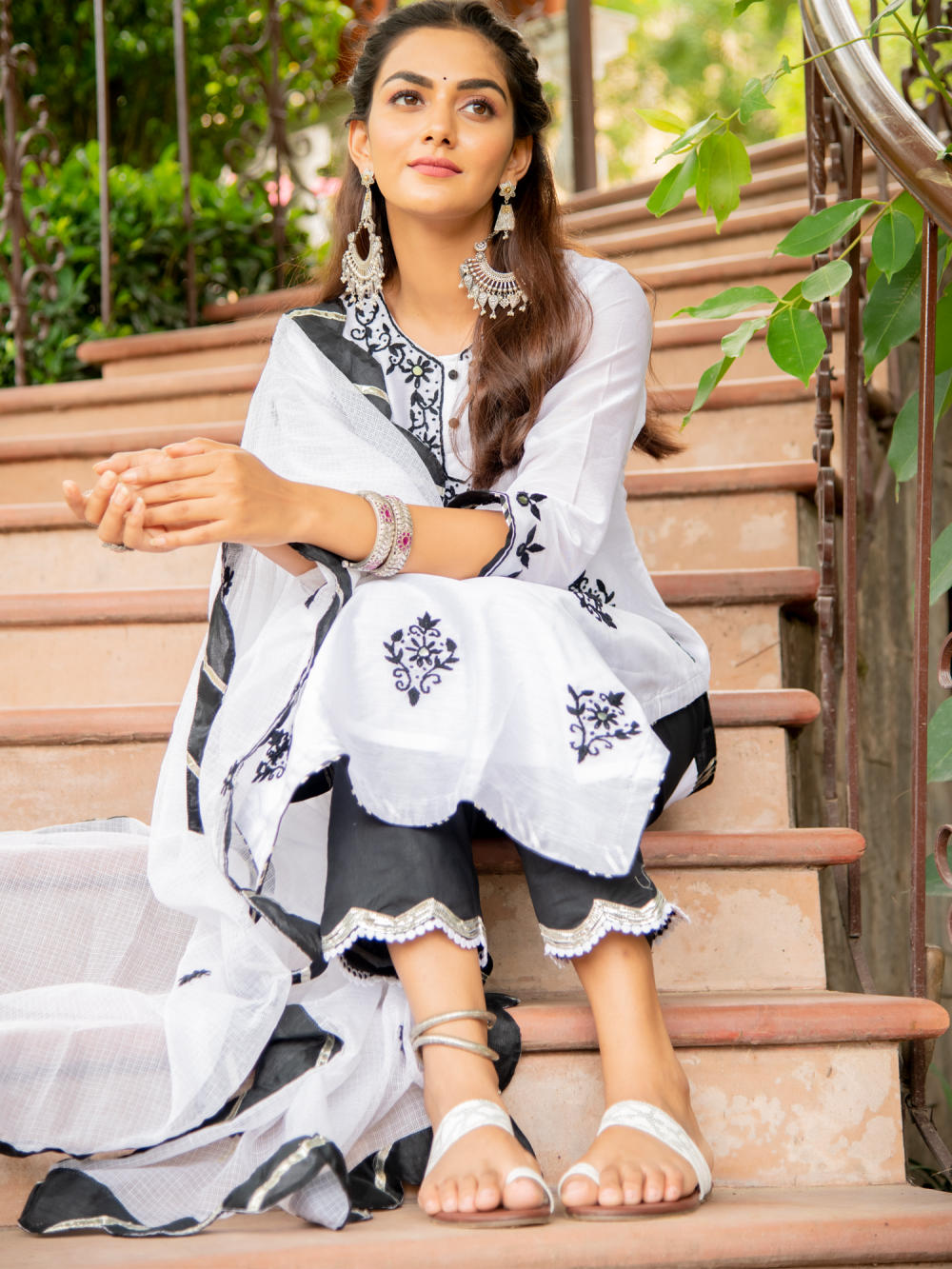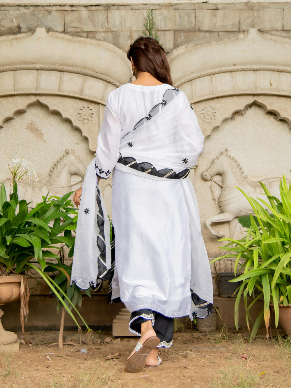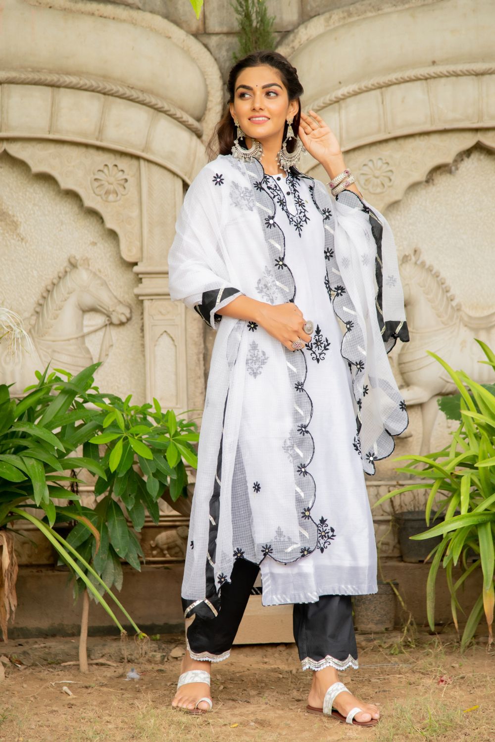 KURTI: A classic black on white chanderi kurti with kasida mirror and thread work on the neckline, sleeves & hemline.