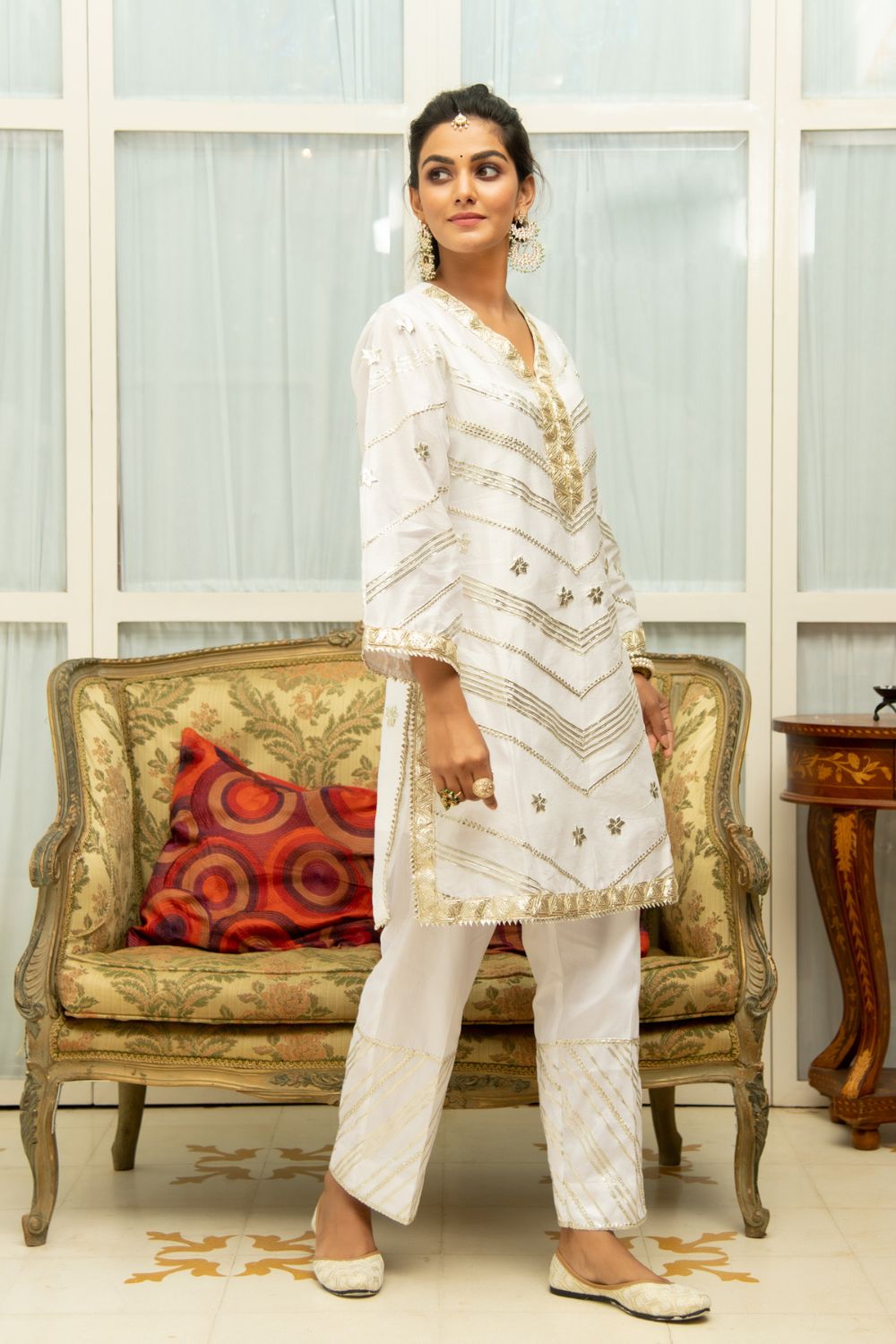 KURTI: A minimal and classic ivory short chanderi kurti with heavy gota lace detailing on the neckline, sleeves & hemline. Comes with an inner.