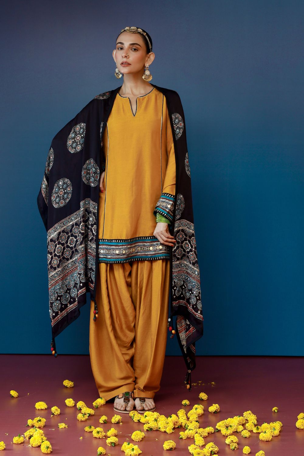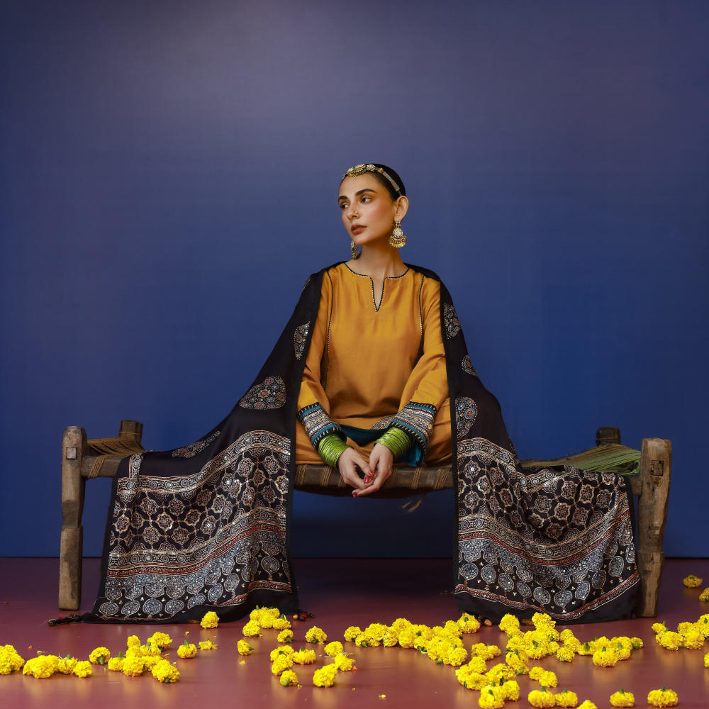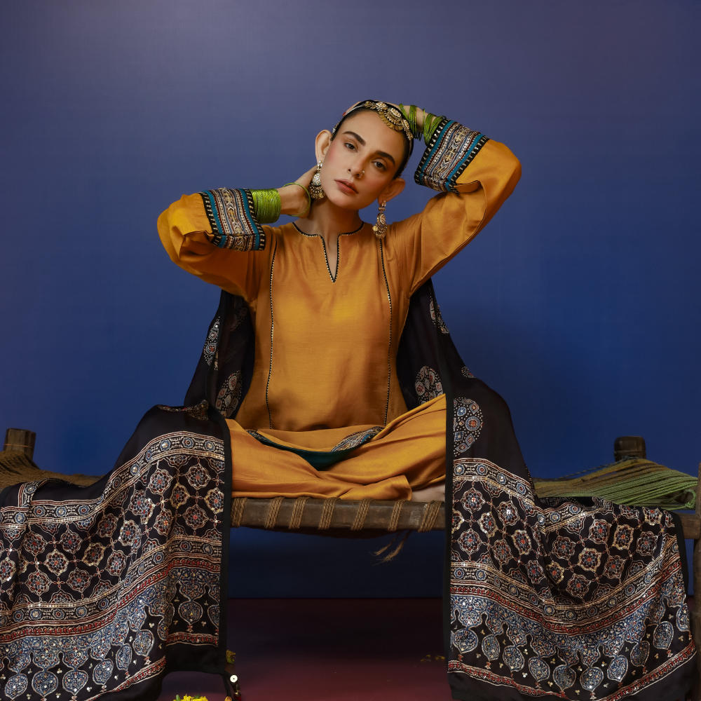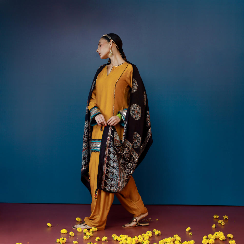 This mustard wide-panel kurti set is paired with a Farsi Pakistani salwar, creating a graceful and traditional silhouette. Featuring an Ajrakh hand-embroidered border and complemented by a stunning Ajrakh dupatta, this ensemble is perfect for wedding & festive occasions.