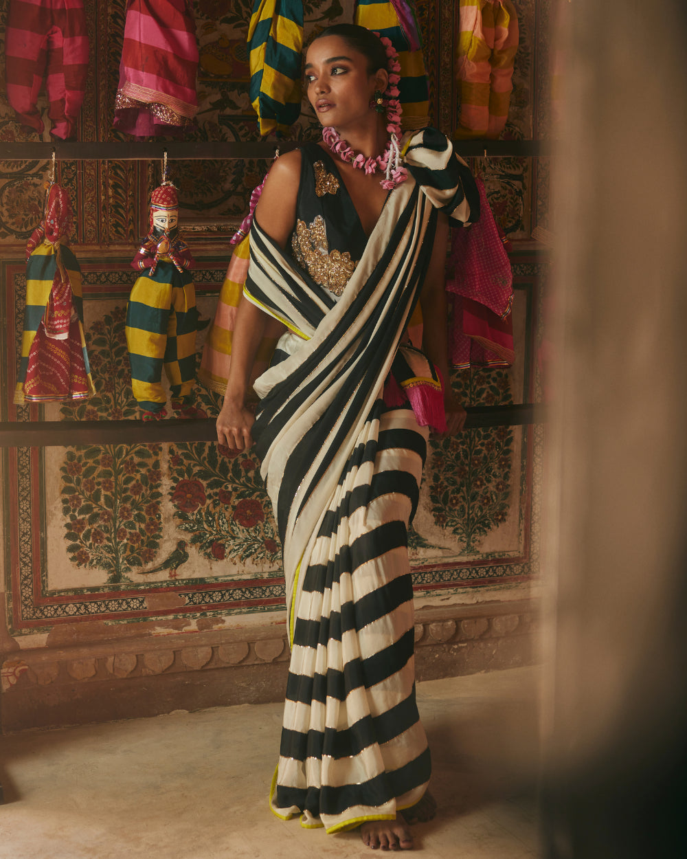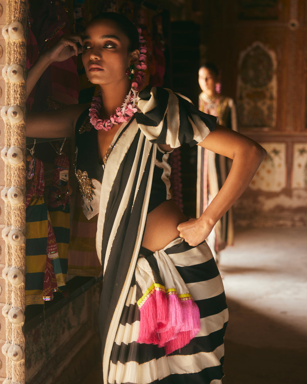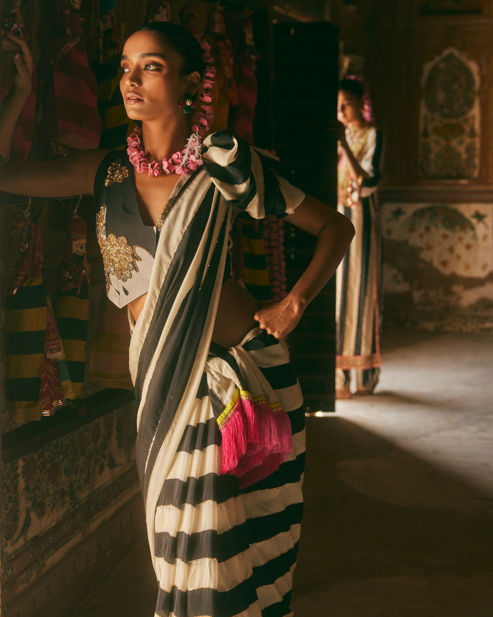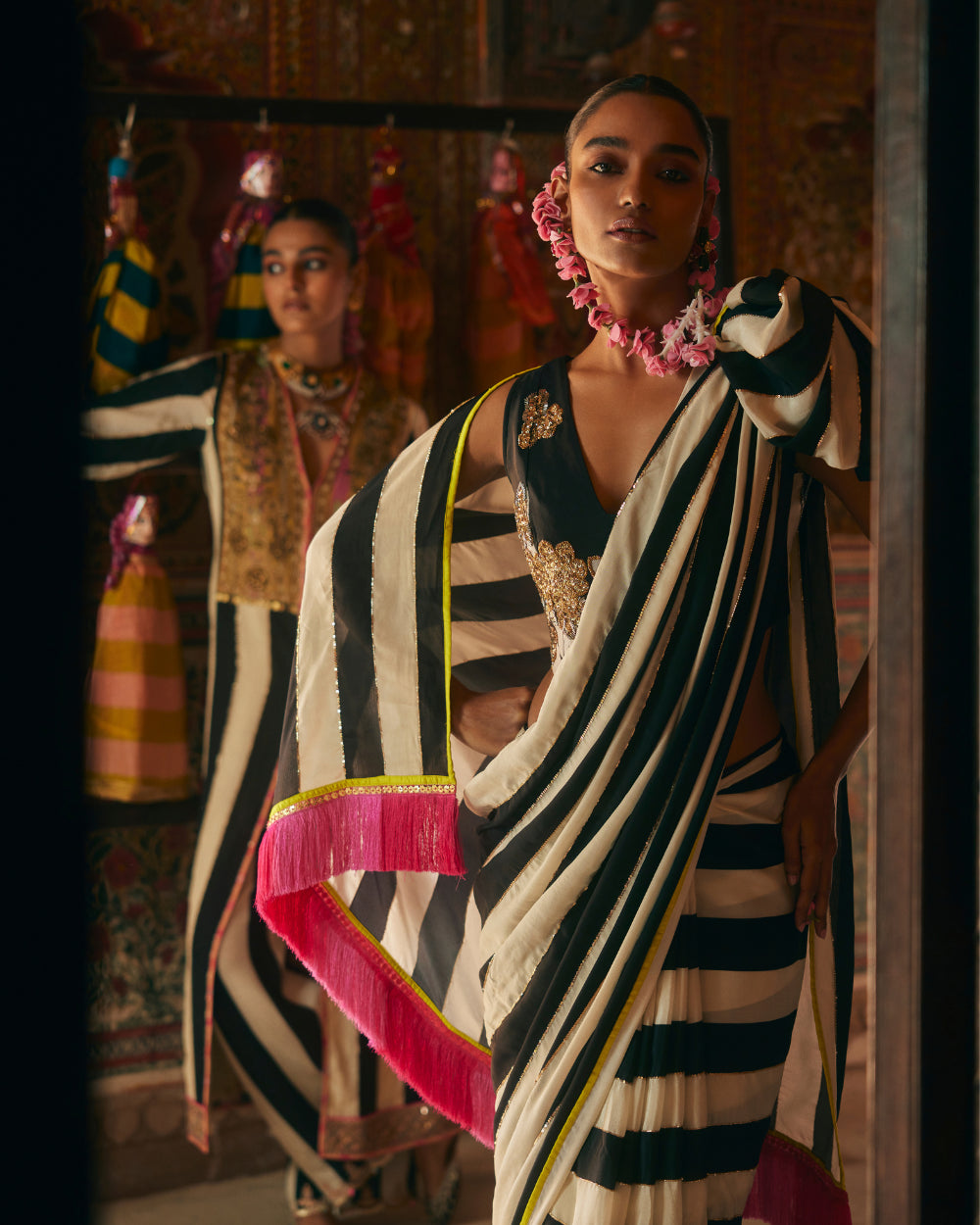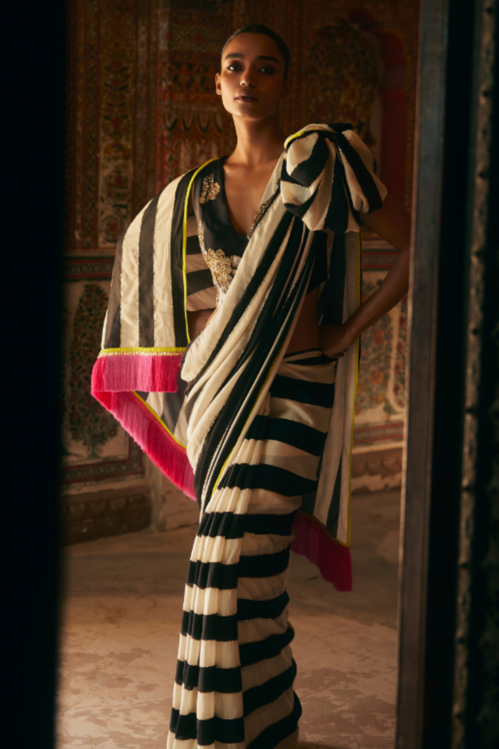 Elegance personified with this striking black and white saree, adorned with chic hand embroidery on stripes.. The vibrant hot pink fringe adds a playful touch of color and flair. Paired with intricately hand embroidered waistcoat blouse in matching hue. This ensemble exudes sophistication and modern charm, making a perfect style statement.