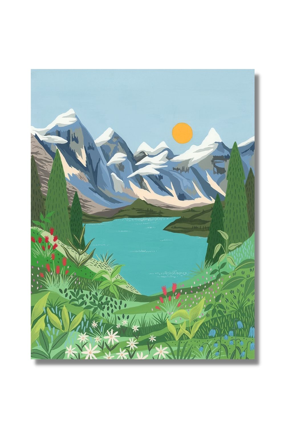 Inspired by our last trip home to Canada. I think Banff is one of the most beautiful places in the world, and Moraine Lake definitely has that WOW factor. The colour of the water is so blue it's almost unbelievable and takes your breath away. The background of mountains that surround the lake is just awe-inspiring and I knew I had to paint it.The foreground features a few native flowers, just as Castilleja and Bluebells. This print was created from an original Em+Co gouache painting.