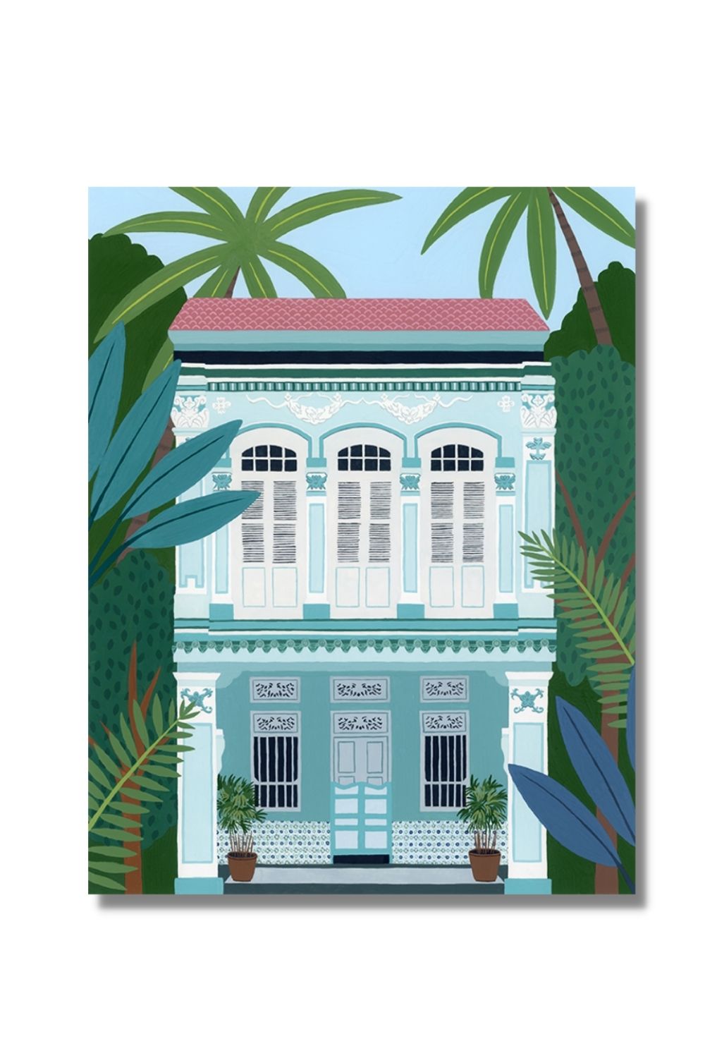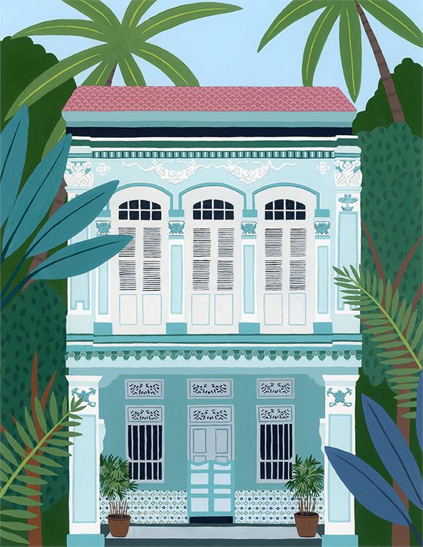 Singapore is well known for its colourful heritage shophouses. This teal shophouse art work is inspired by the impeccably kept Peranakan home on Blair Road here in Singapore. If you look up Blair Road on social media I can assure you you'll find this shophouse featured many times! I have always been a big fan of the colourful architecture here in Singapore and draw a lot of inspiration from it. My favourite parts of this shophouse are definitely the Peranakan tiles and the decorative motifs on the facade.