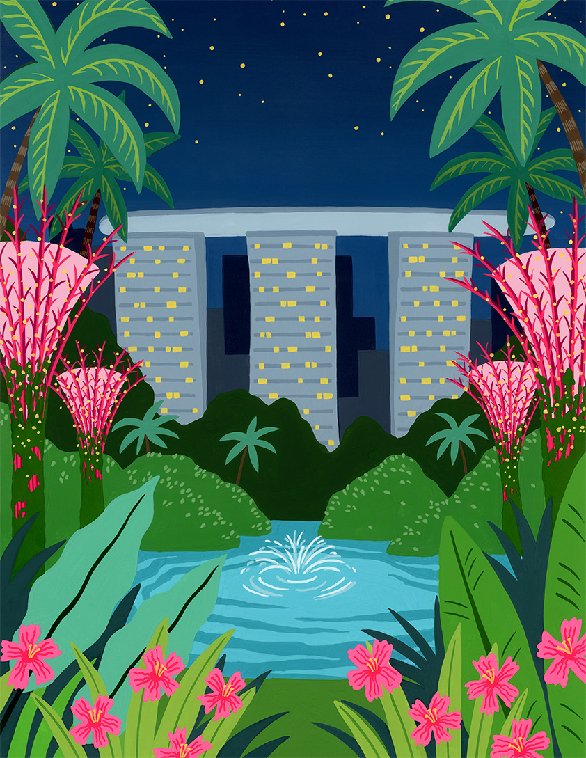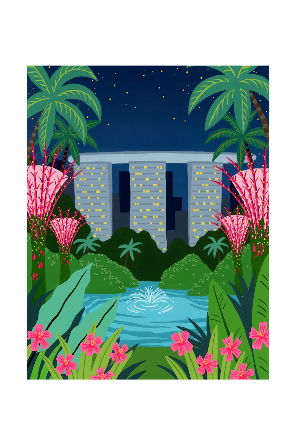 This gouache painting was inspired by arguably the most iconic sight in Singapore, Marina Bay Sands Hotel. The foreground features tropical plants and flowers, followed by a view of the fountain found towards the south of the hotel in Gardens by the Bay. And of course, how could I not include some supertrees while I was at it? This is the first painting I've done staged at night, the time at which the hotel and supertrees really light up!