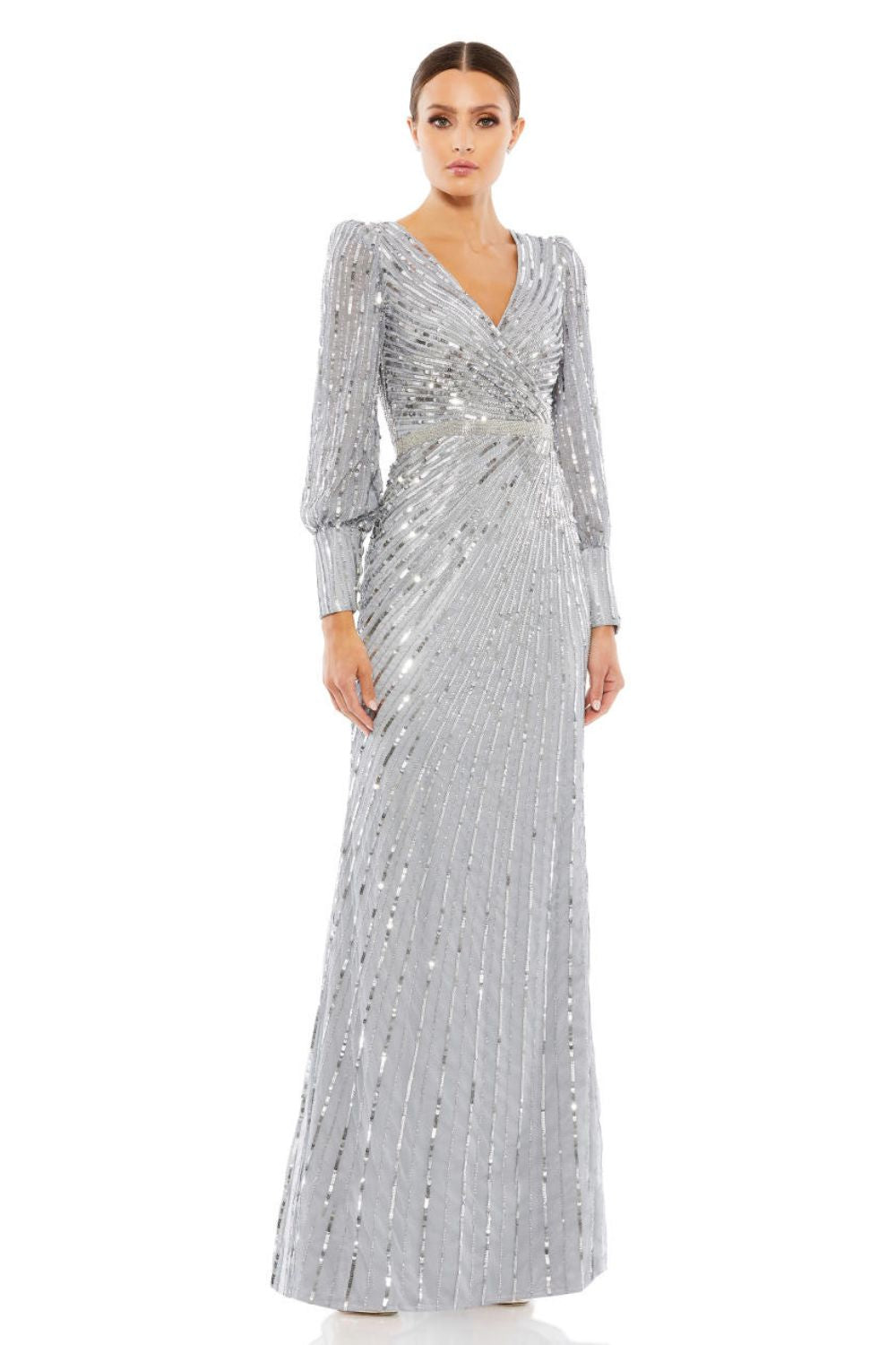 Founded in Chicago by designer Mac Duggal, the label has become a red-carpet language of its own—seen at the Oscars, the Emmys, the Met-adjacent soirées, and the kind of celebrations where the lighting is soft, the music is warm, and the dress needs no introduction. Known for sculpted drapes, sequined textiles, and silhouettes that photograph with cinematic clarity, Mac Duggal designs gowns that balance drama with precision.