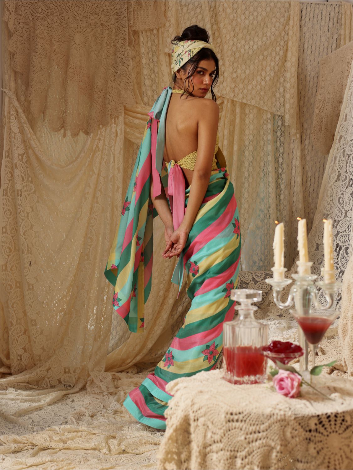 Where tradition meets tropical chic—this contemporary saree is paired with a handcrafted yellow crochet bralette, adding a bold, artisanal twist to the look. The bralette can double as a separate, offering versatile styling options.
