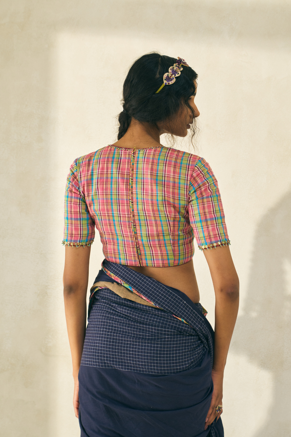 V-neck blouse with fitted short sleeves, back zip, and hand beading, crafted in handwoven yarn-dyed Bengal cotton with punch-pink checks and a hand block-printed lining.