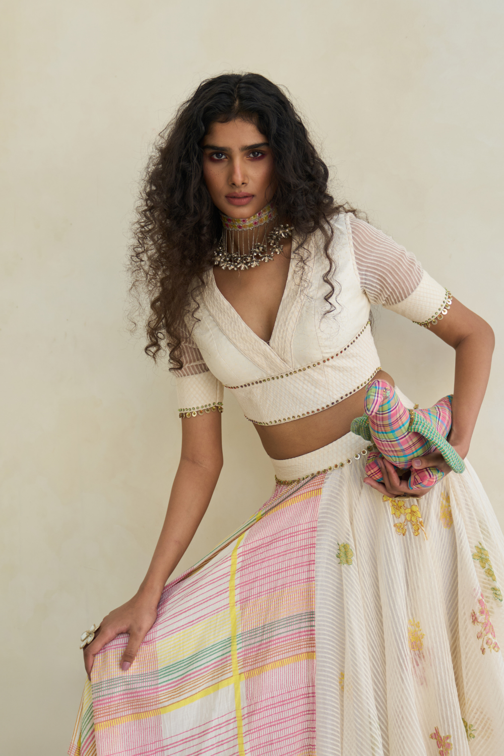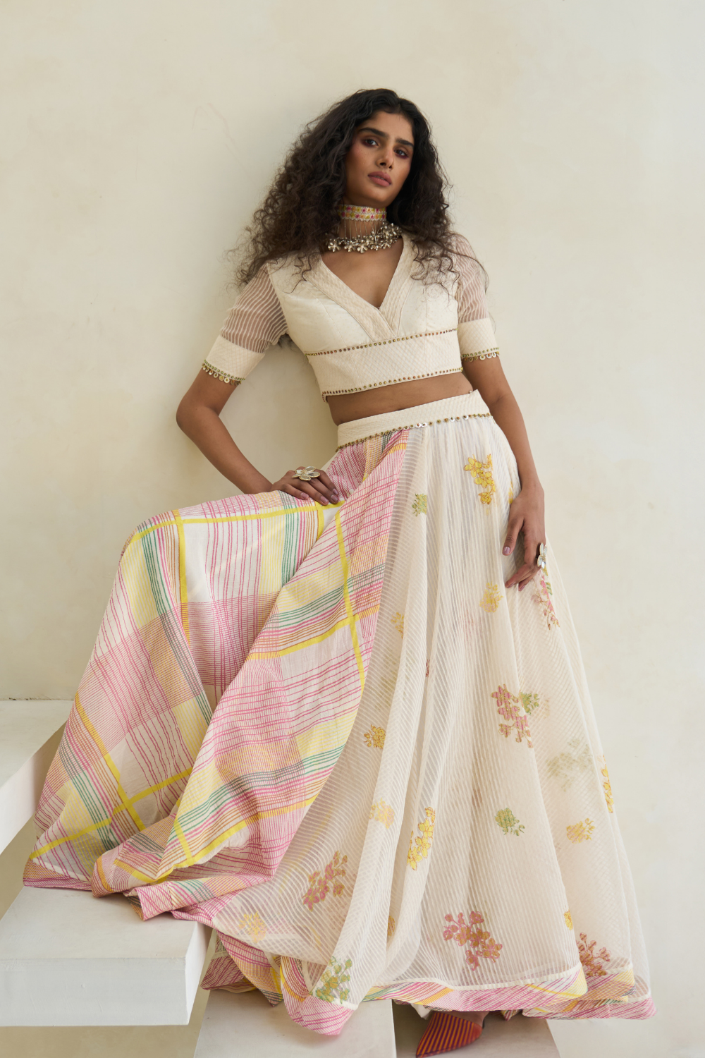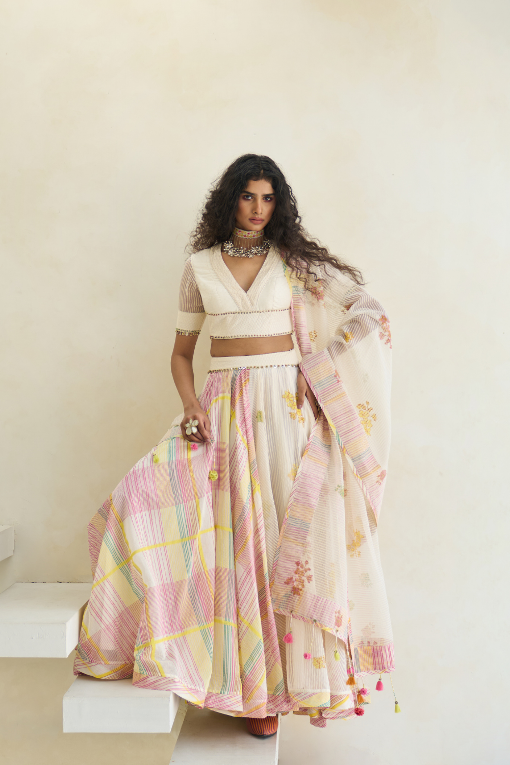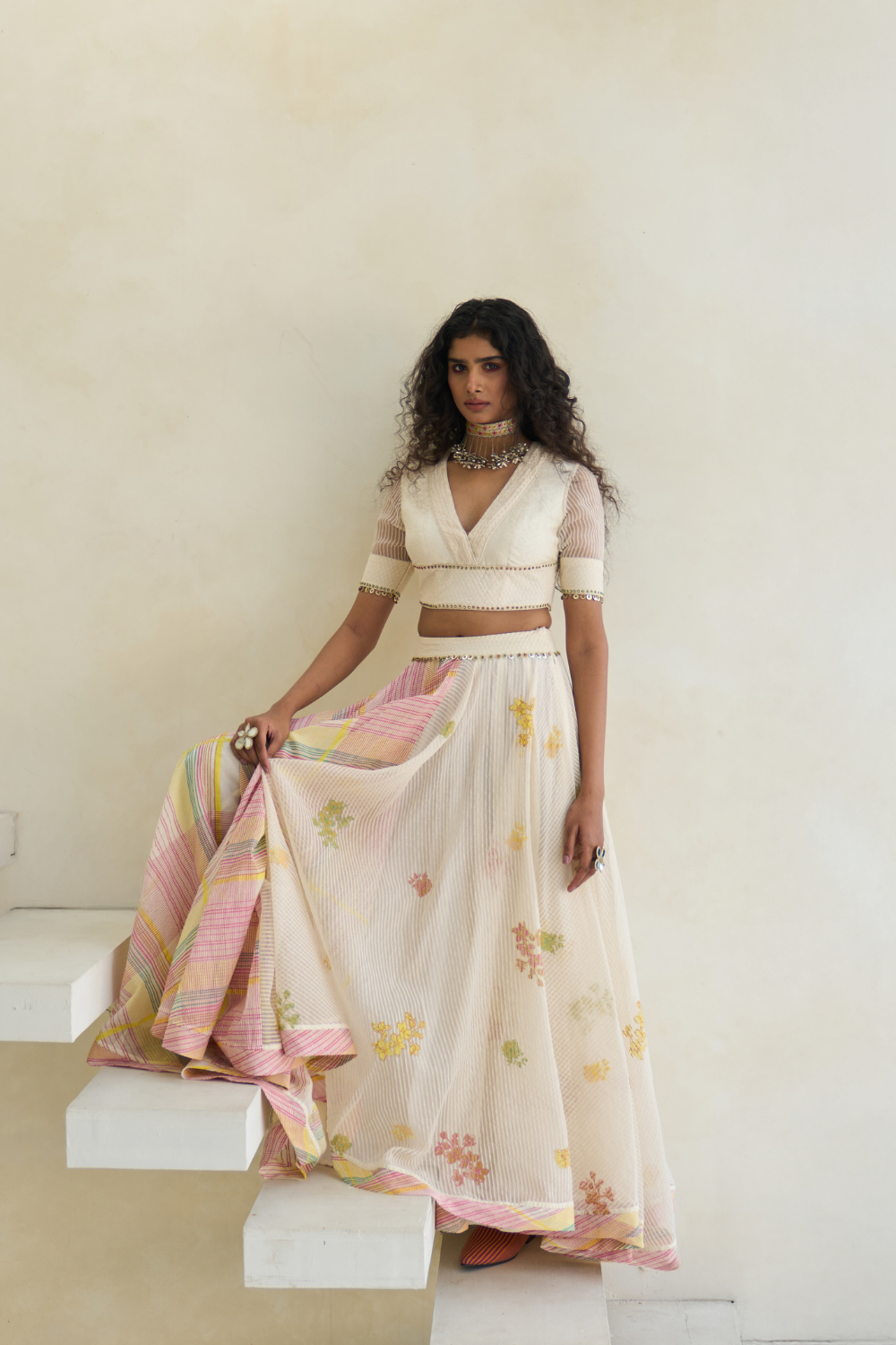 Hand block print V-neck blouse with a fabric-manipulated neckline, in woven striped silk organza and handwoven 60 gm Chanderi with 100% cotton lining, enhanced with beaded tassel work.