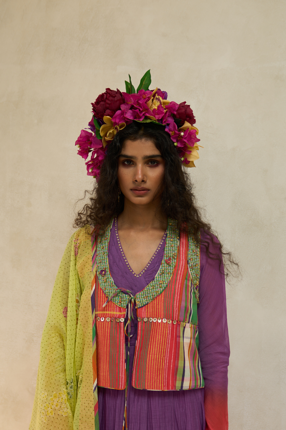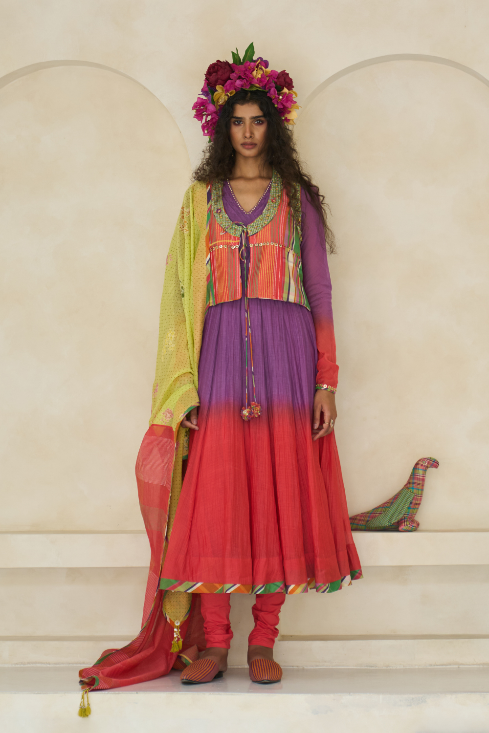 Spliced dupatta in handwoven 40 gm Chanderi, block printed and finished with hand-done beaded and tassel details.