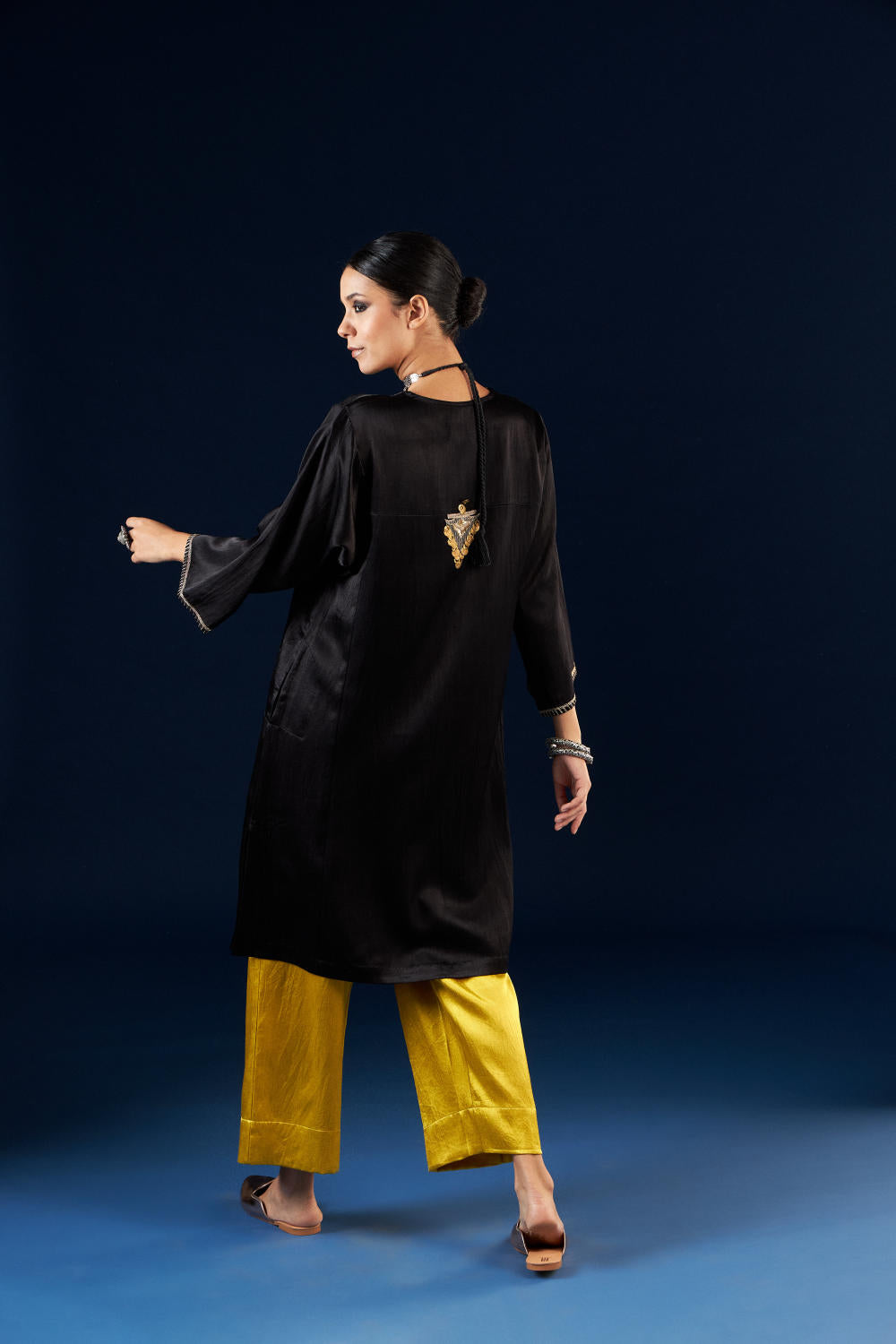 Kalidaar Kurta Set - Coal Black & Gold Yellow