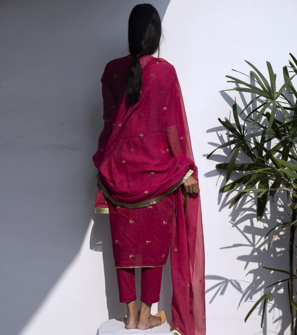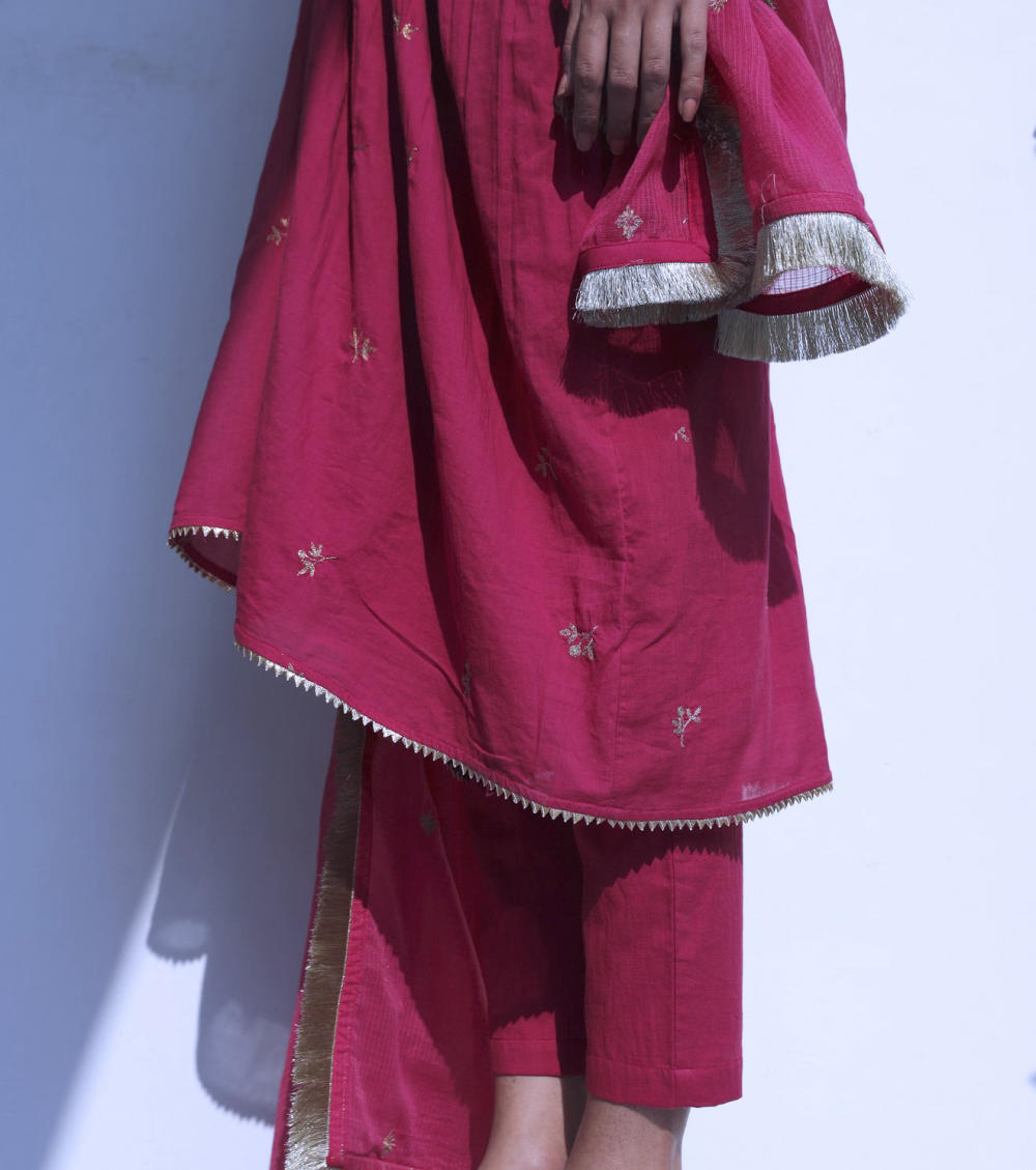 An elegant magenta ensemble made from cotton mulmul. Presented with delicate zari embroidery and gold details. Comes with cropped zip up pants and matching dupatta.