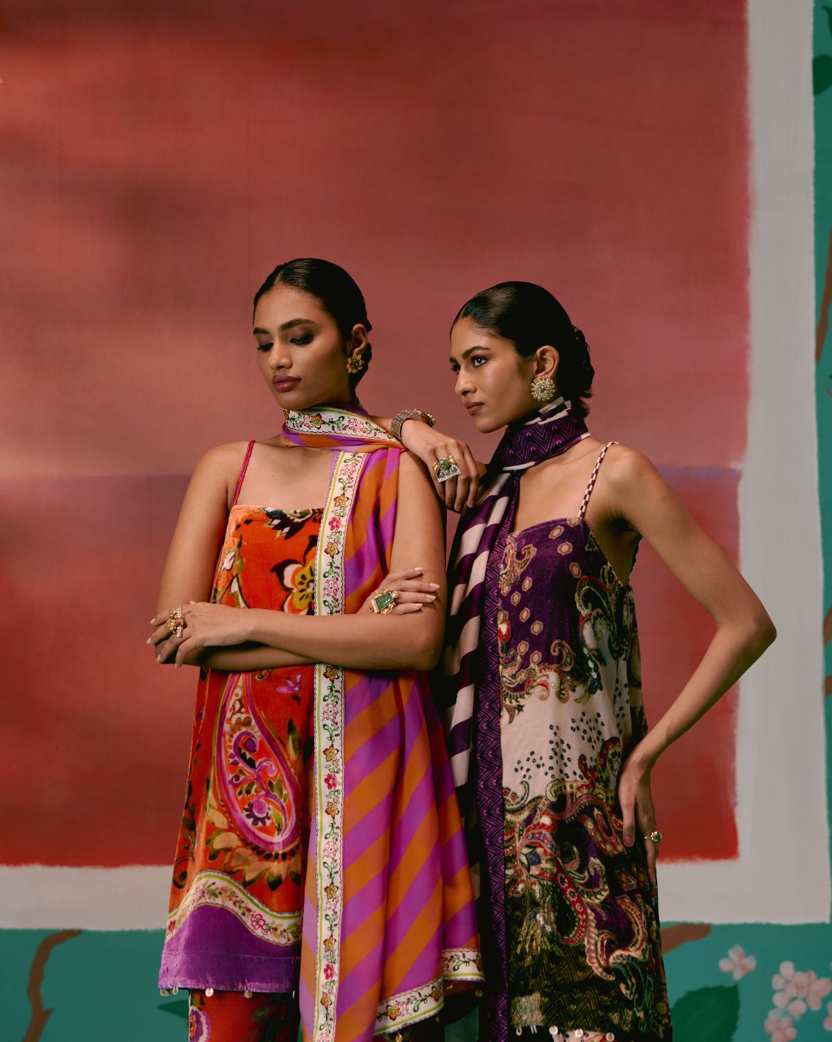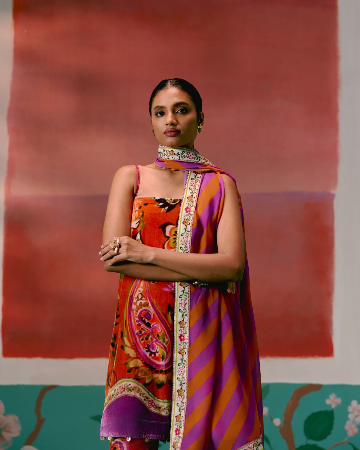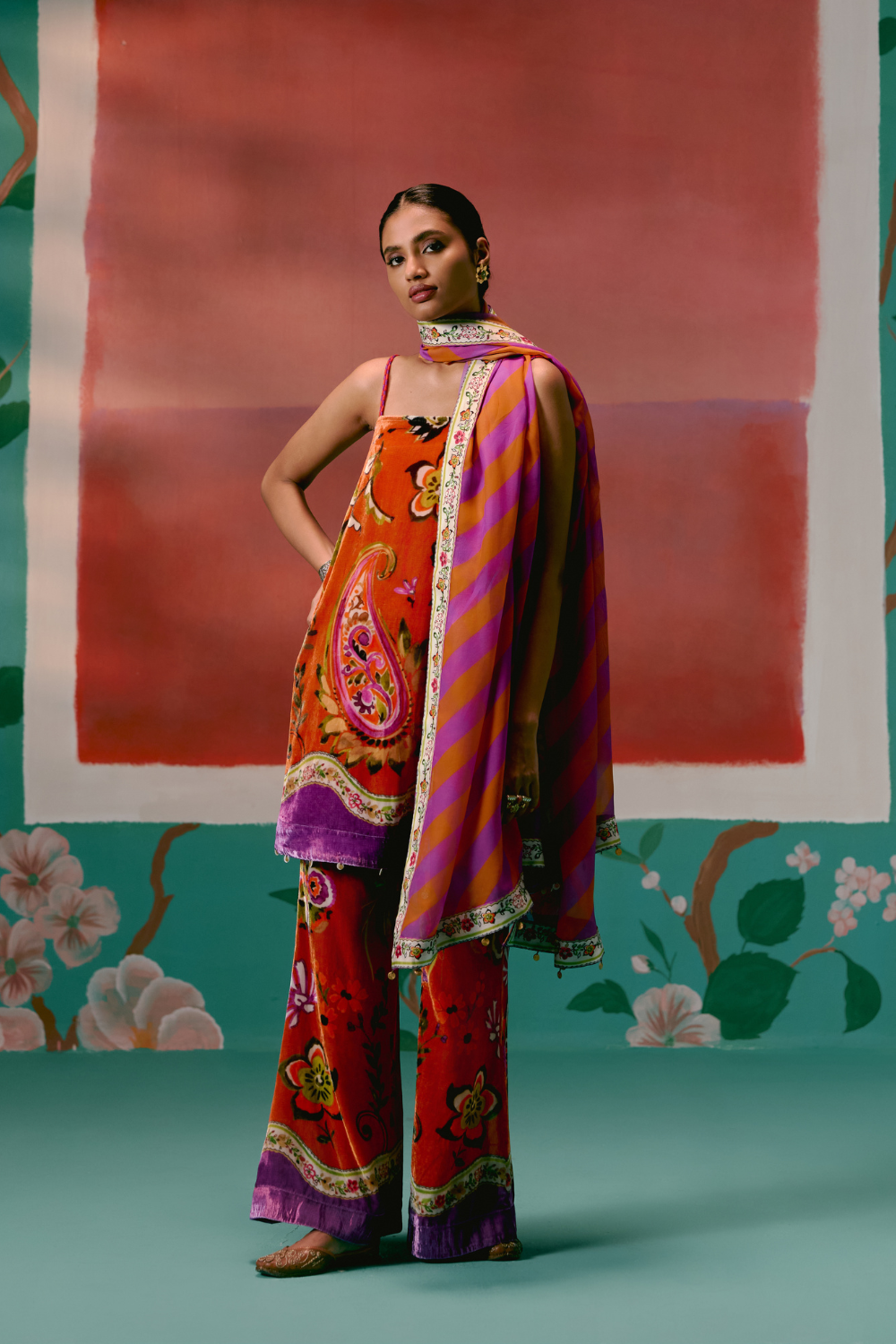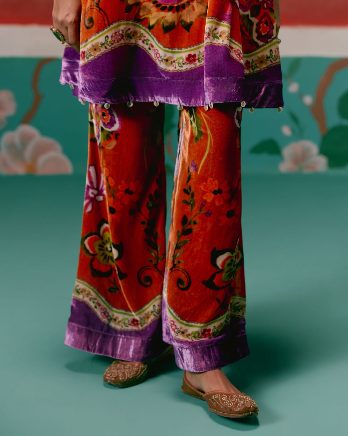 Vibrant and bold, the Tangerine & Purple Floral Kurta Set brings a modern twist to festive dressing in plush velvet.