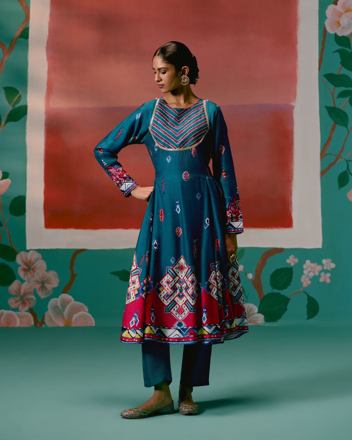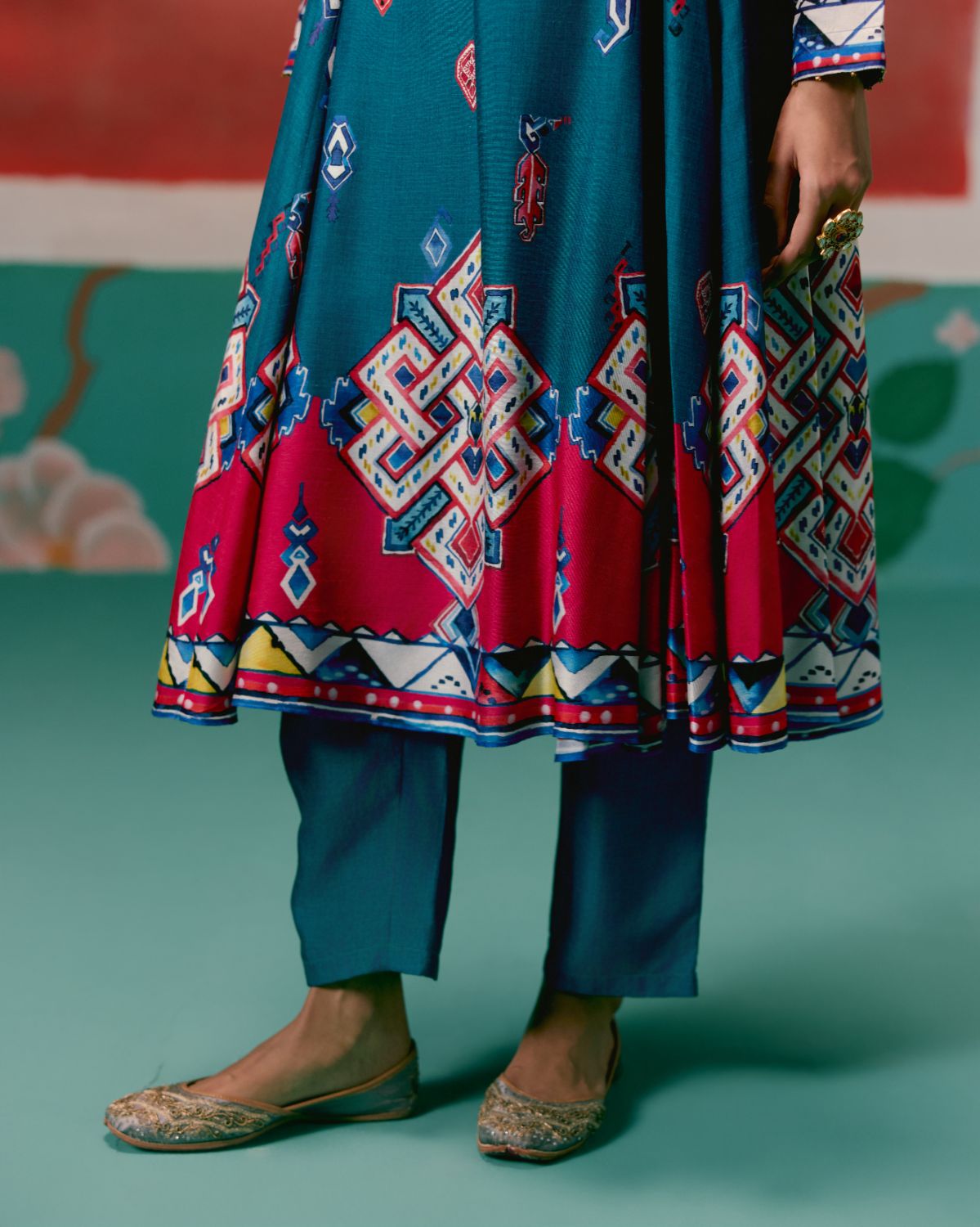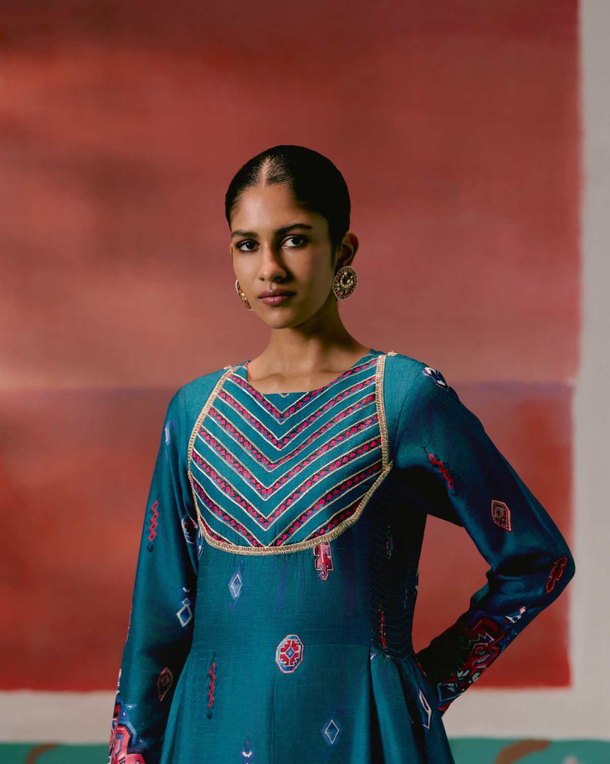 Elegant and striking, the Teal Aztec Anarkali Kurta Set brings a fresh spin to festive dressing.