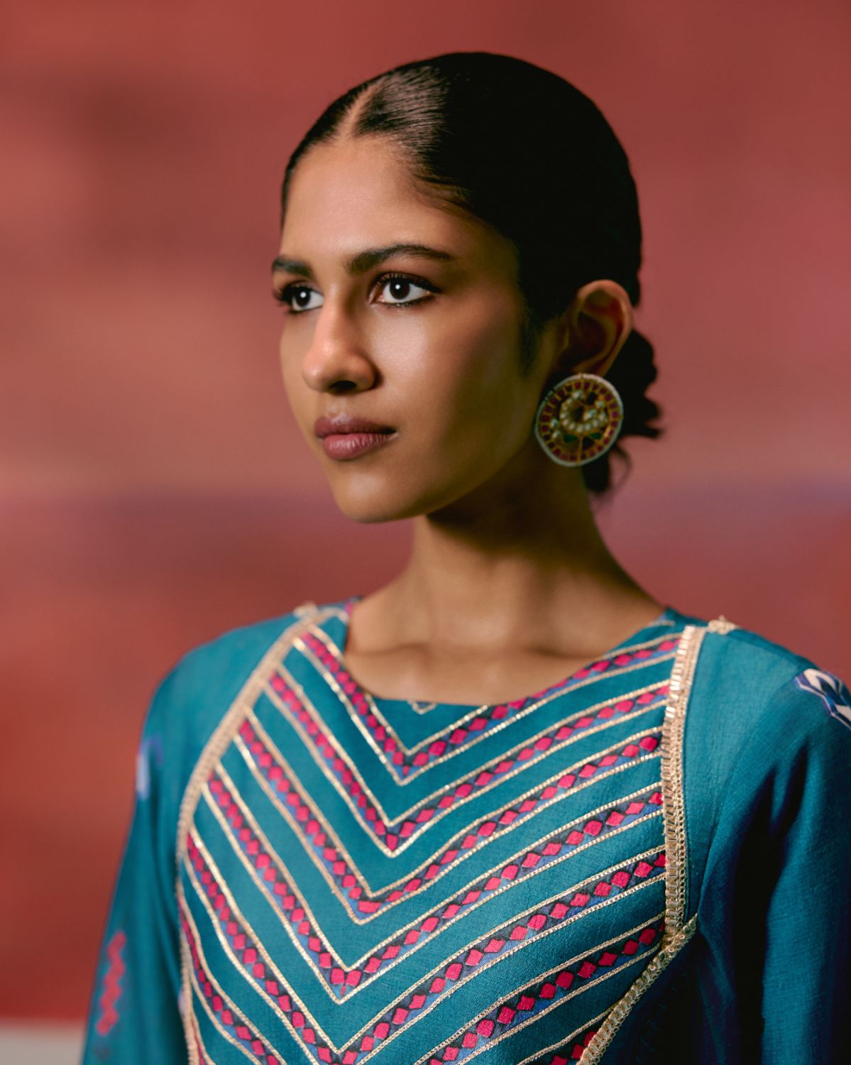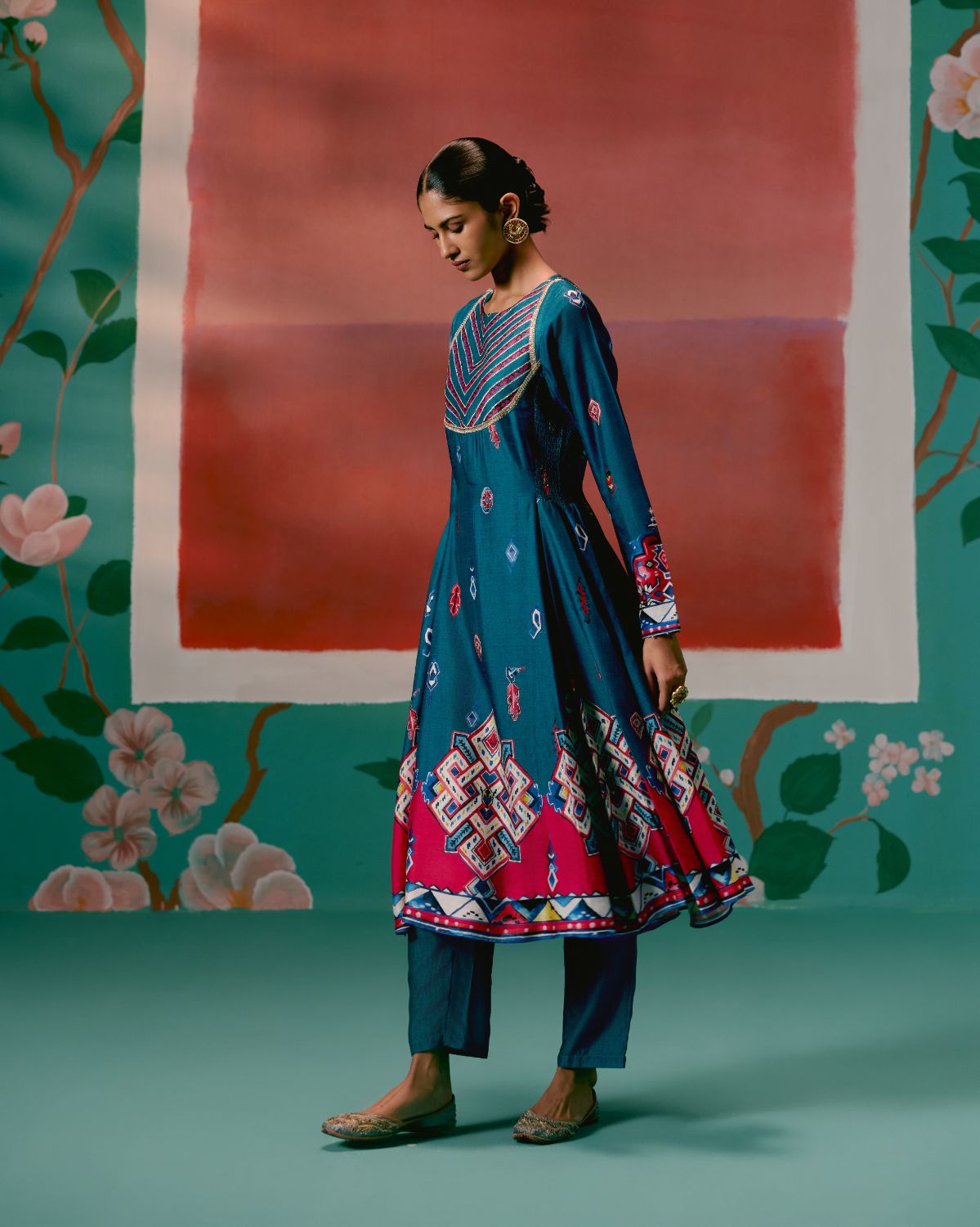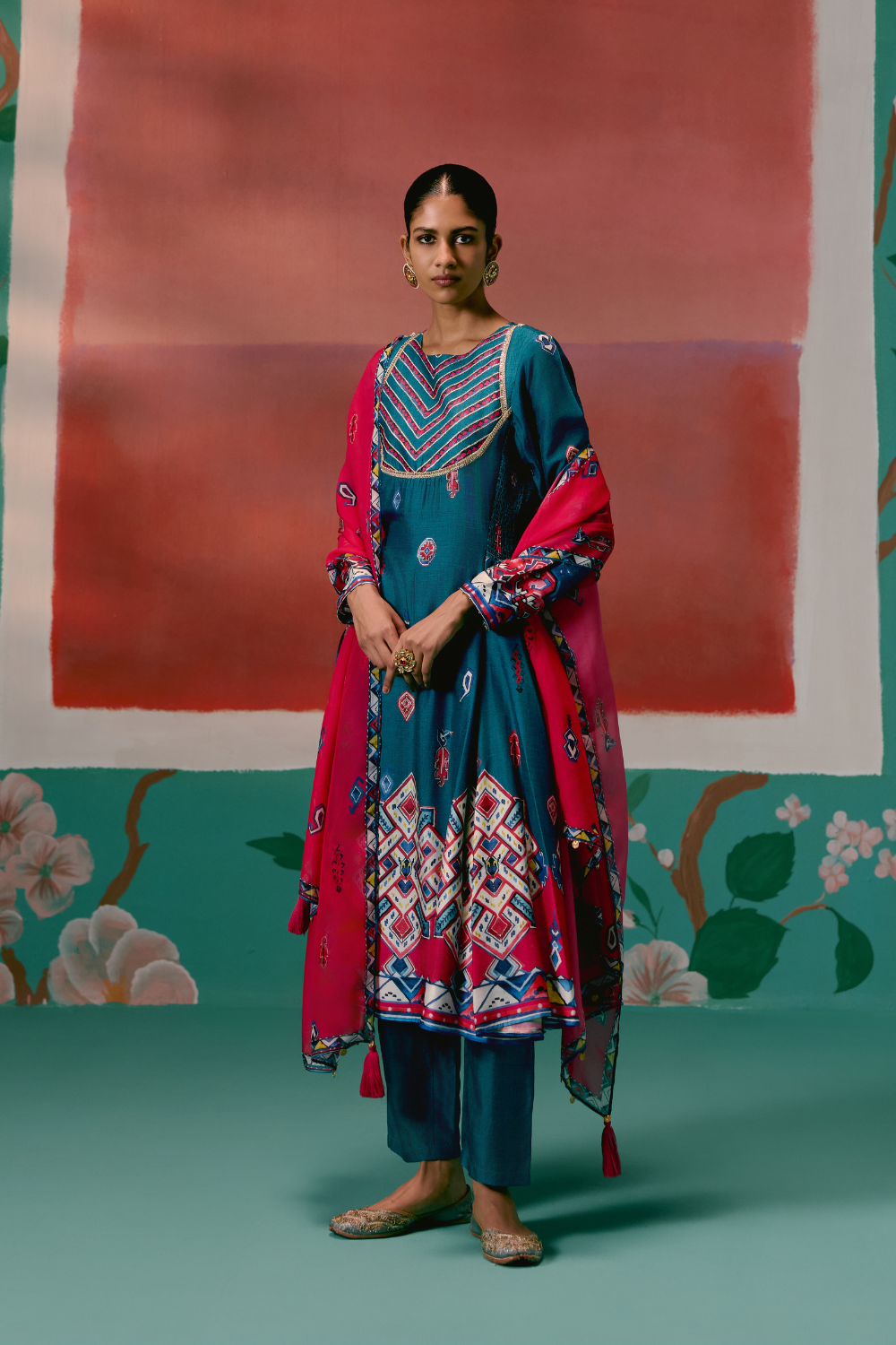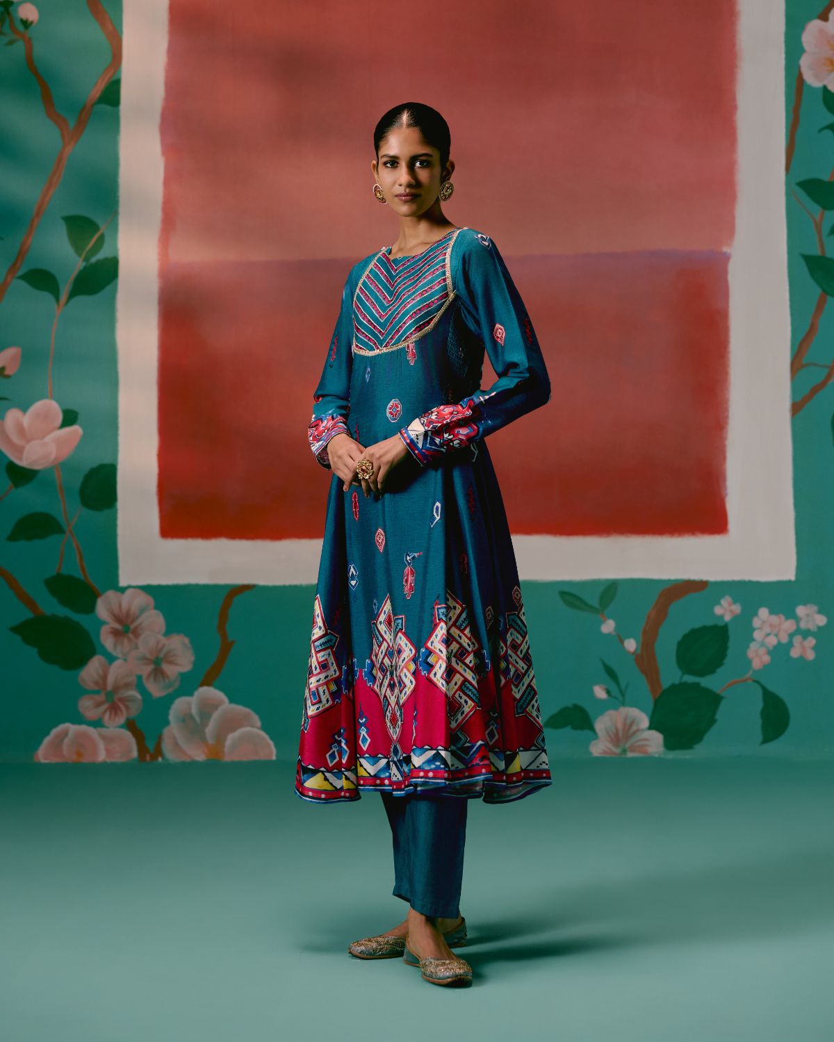 Elegant and striking, the Teal Aztec Anarkali Kurta Set brings a fresh spin to festive dressing.