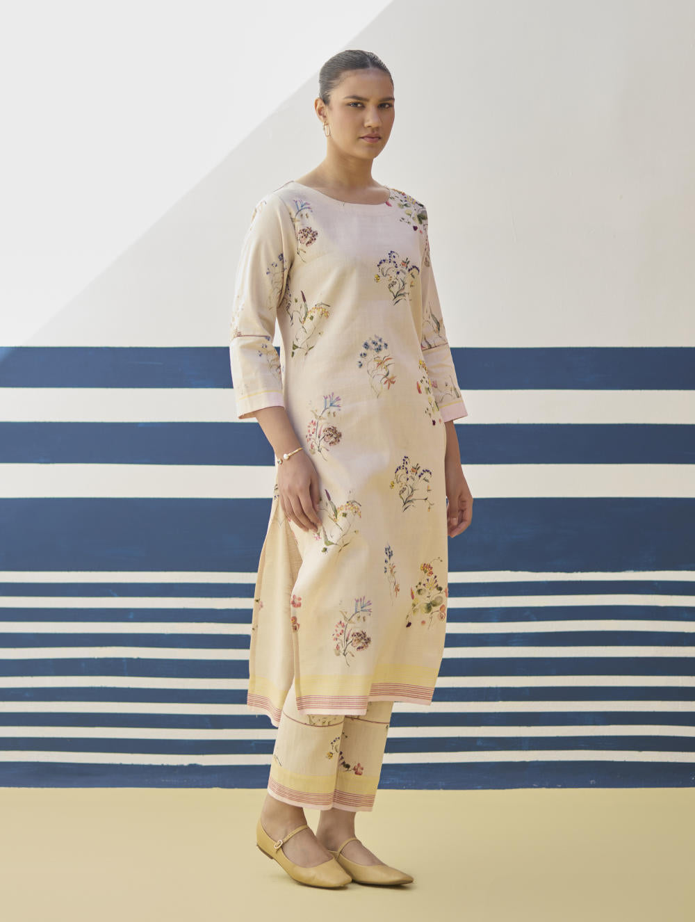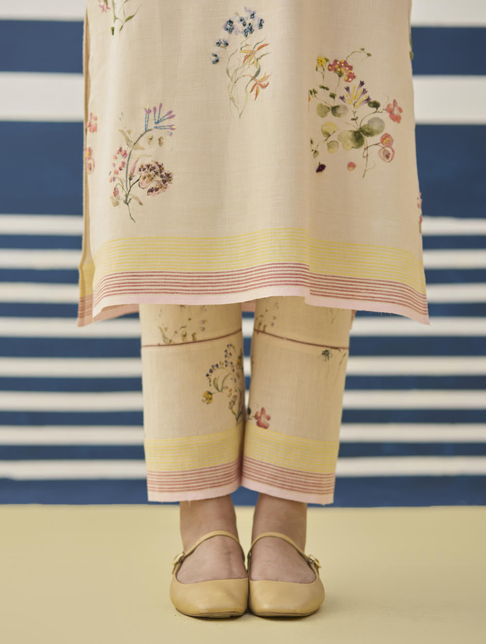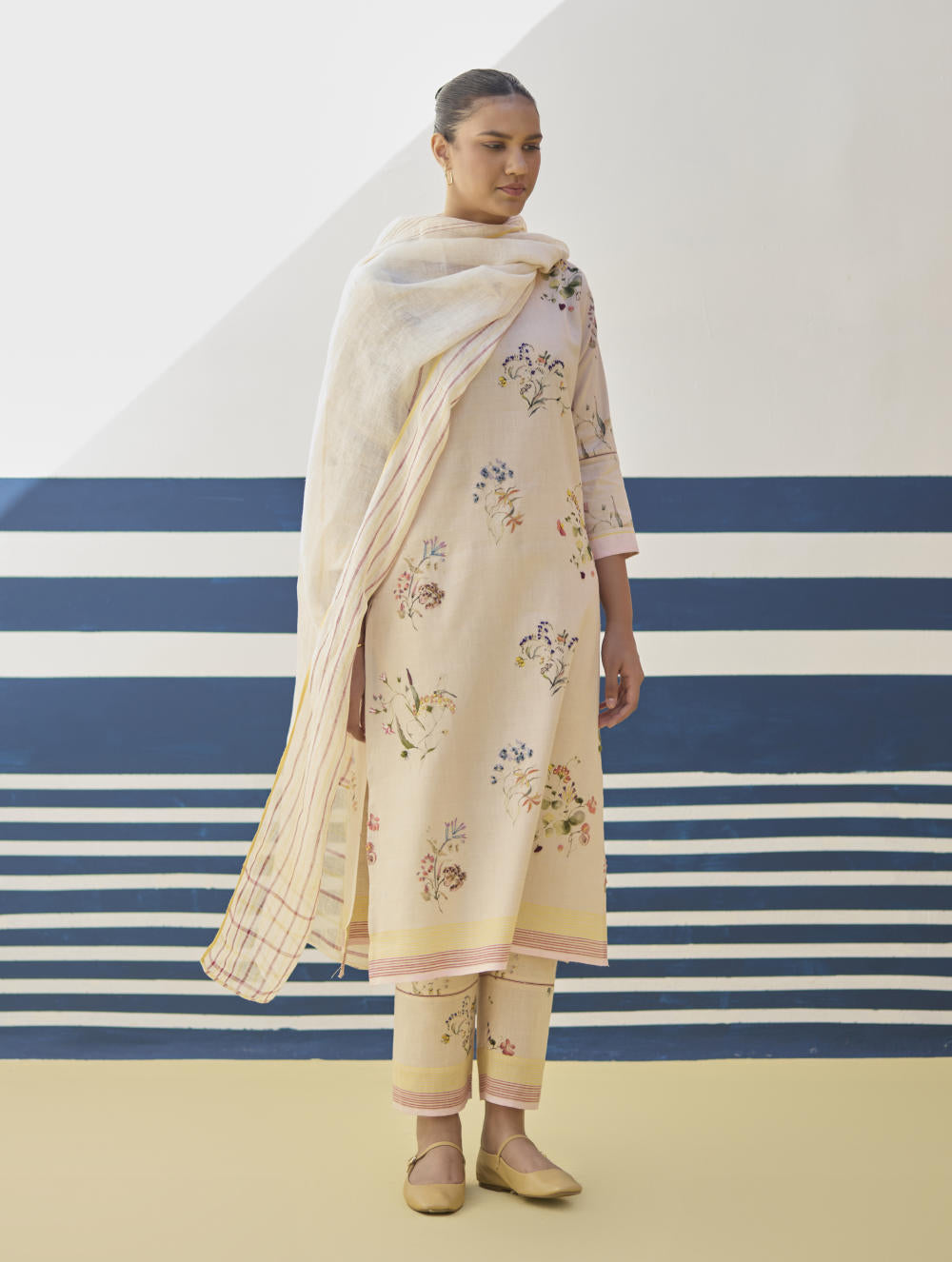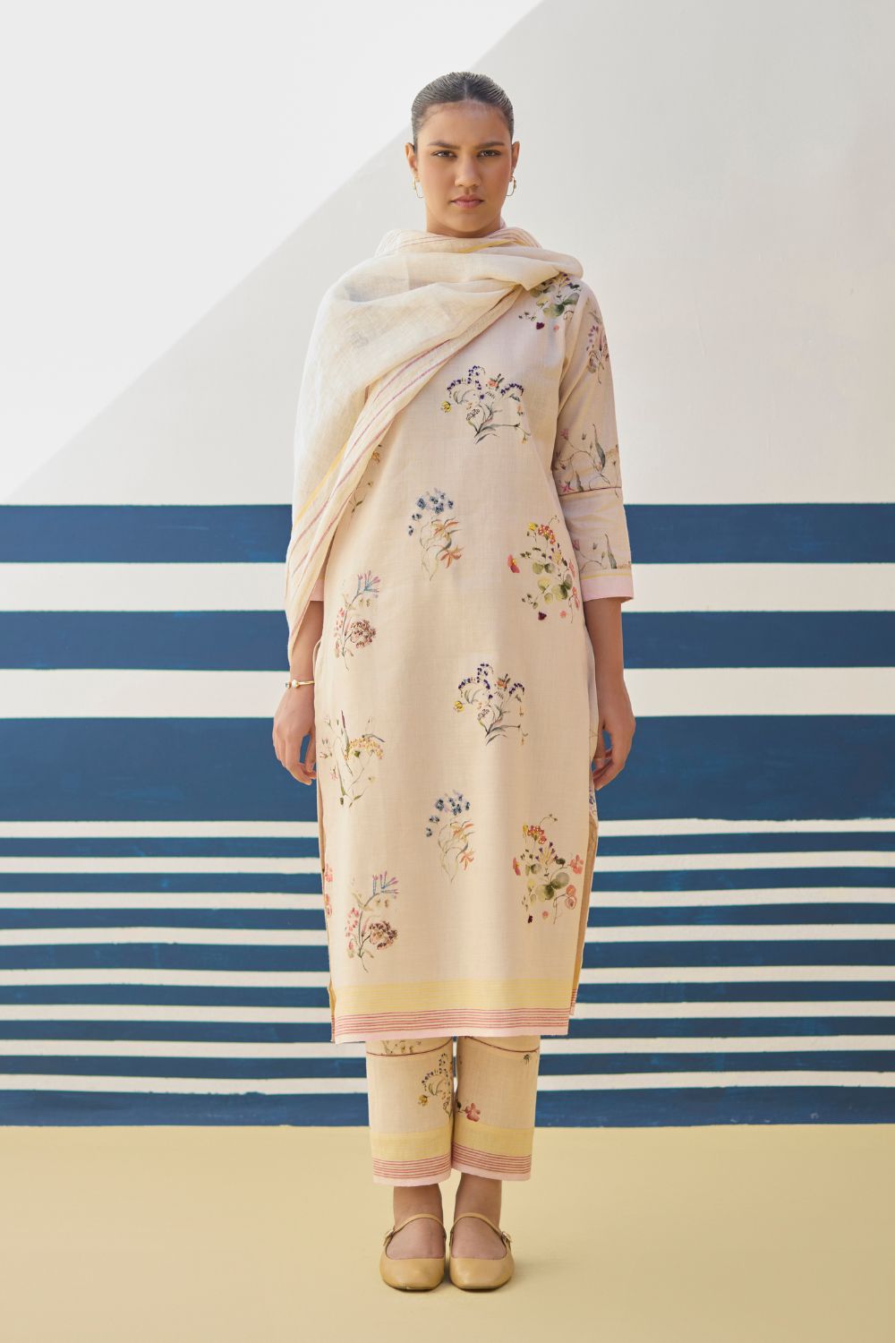 Kurta- Our favourite hand-embroidered printed boat-neck full sleeve kurta on handloom linen cotton with a handwoven stripe border. The kurta is detailed with a handmade jaali (mesh) stitch detail on the sleeves and has intricately hand-embroidered french knots and single thread hand-embroidery with multi-coloured yarn on the hand-illustrated multicolour floral print. Pant- A timeless tapered Watercolour floral printed pant handcrafted in our handloom linen cotton with a self-woven stripe border. The pant is detailed with an intricate jaali (mesh) stitch in a pop coloured thread. The pant has a drawstring, pockets and an elasticated back-waistband for a comfortable fit. Dupatta- A soft hand-woven dupatta with a multi-coloured stripe border in contrast colours on beautiful flowing sheer linen.