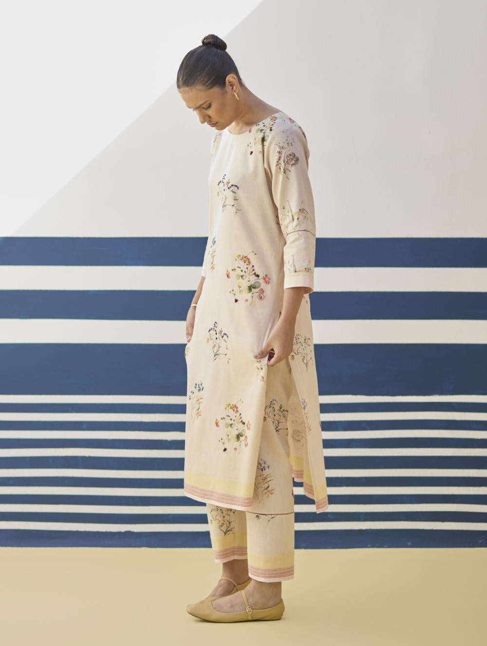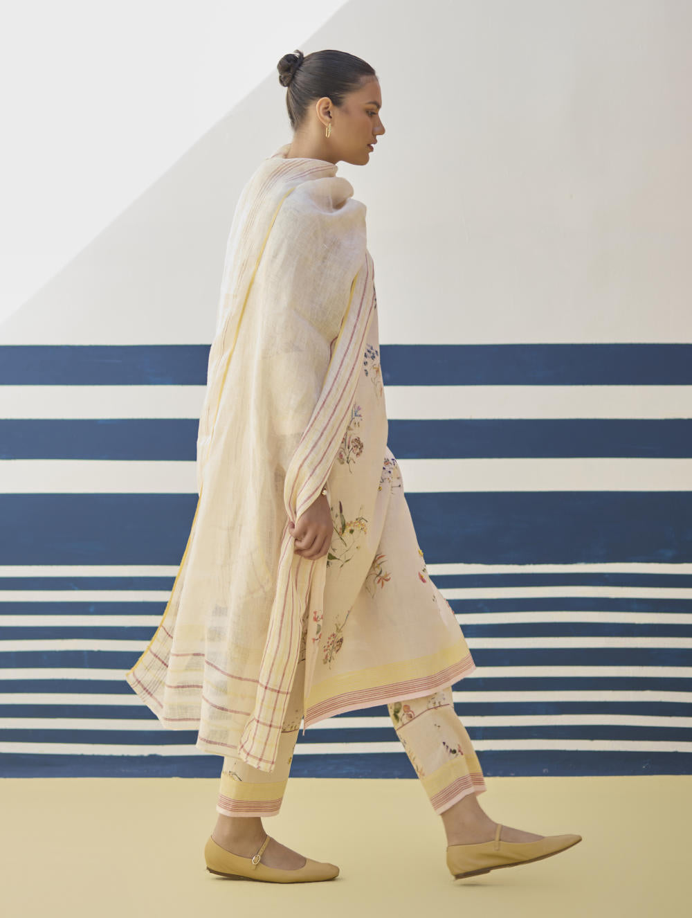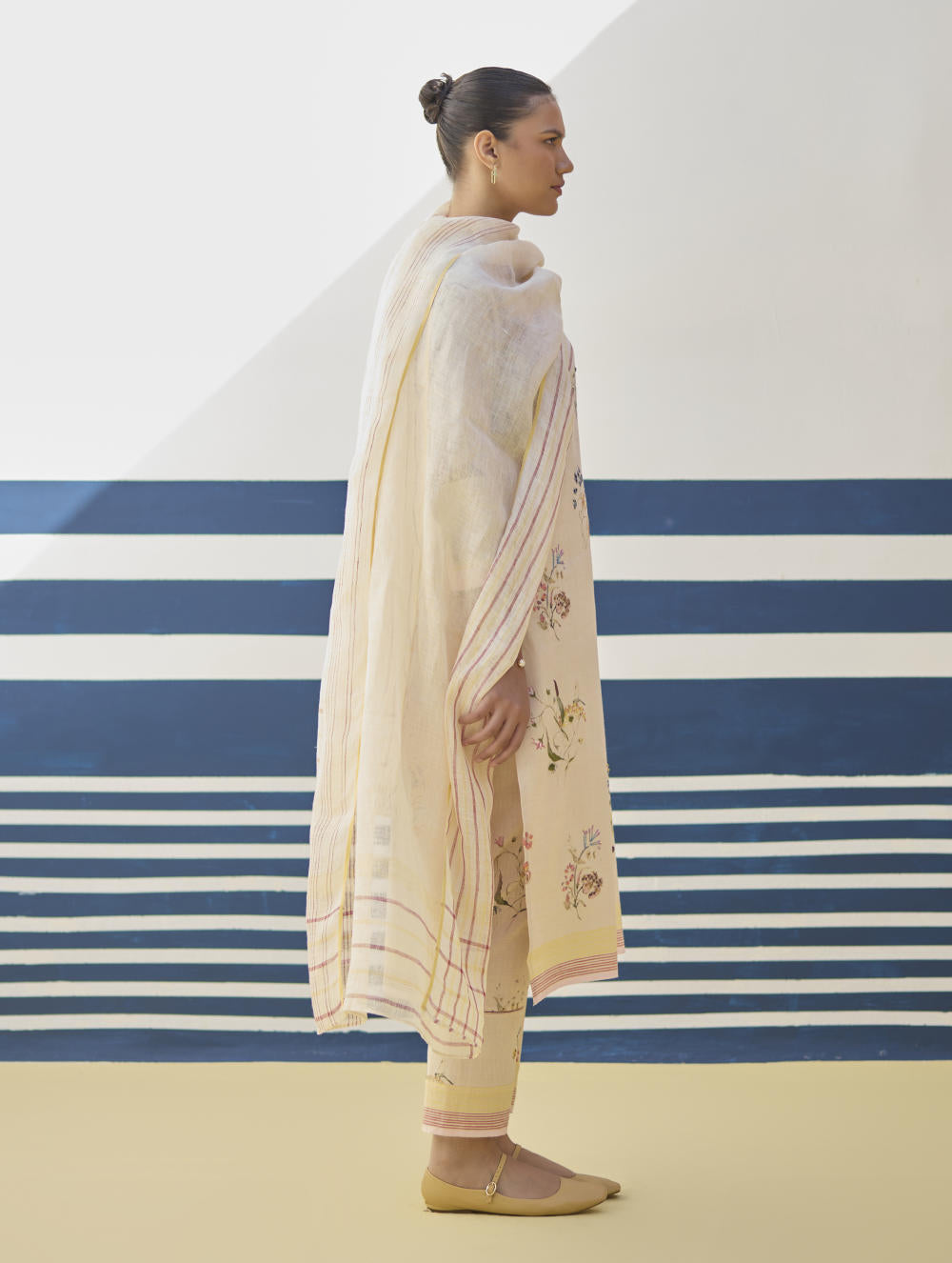 Kurta- Our favourite hand-embroidered printed boat-neck full sleeve kurta on handloom linen cotton with a handwoven stripe border. The kurta is detailed with a handmade jaali (mesh) stitch detail on the sleeves and has intricately hand-embroidered french knots and single thread hand-embroidery with multi-coloured yarn on the hand-illustrated multicolour floral print. Pant- A timeless tapered Watercolour floral printed pant handcrafted in our handloom linen cotton with a self-woven stripe border. The pant is detailed with an intricate jaali (mesh) stitch in a pop coloured thread. The pant has a drawstring, pockets and an elasticated back-waistband for a comfortable fit. Dupatta- A soft hand-woven dupatta with a multi-coloured stripe border in contrast colours on beautiful flowing sheer linen.