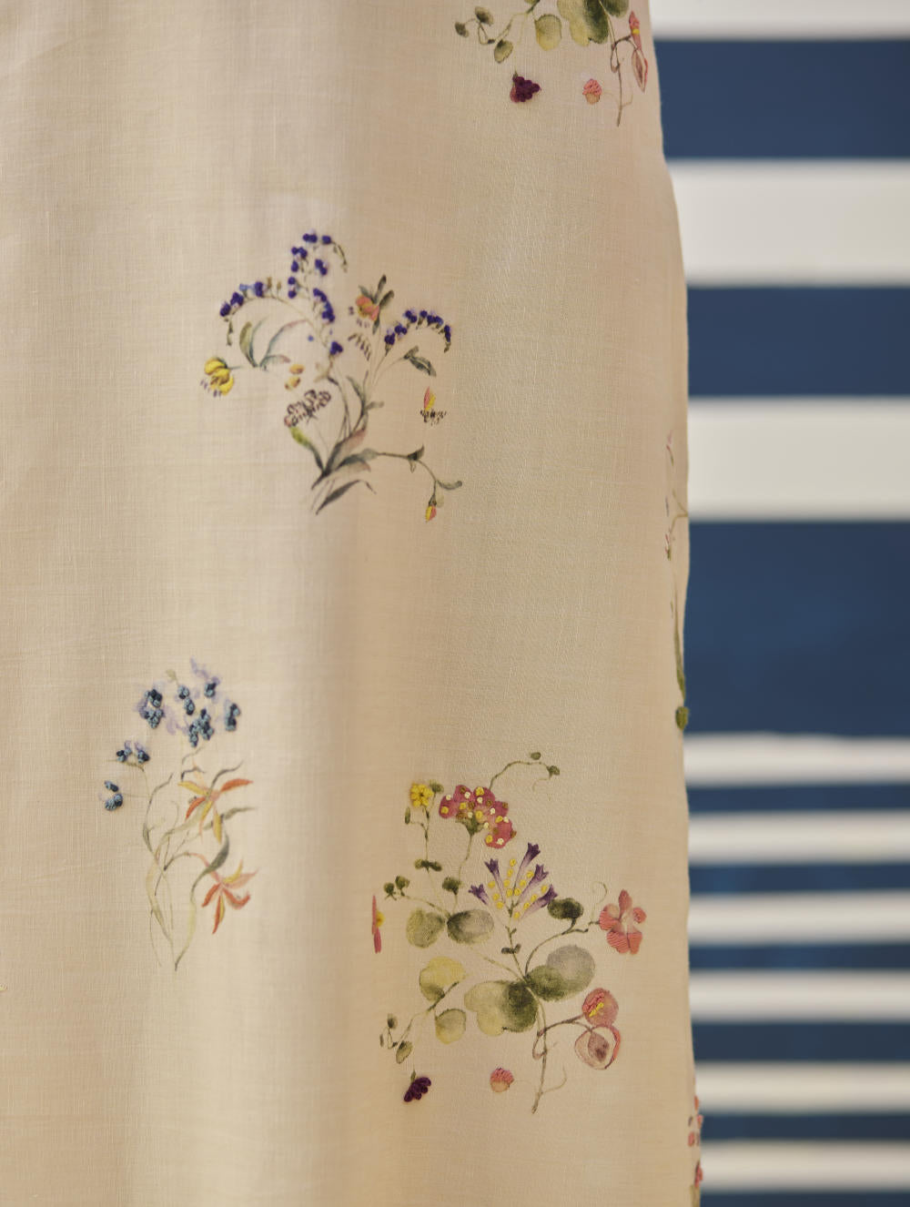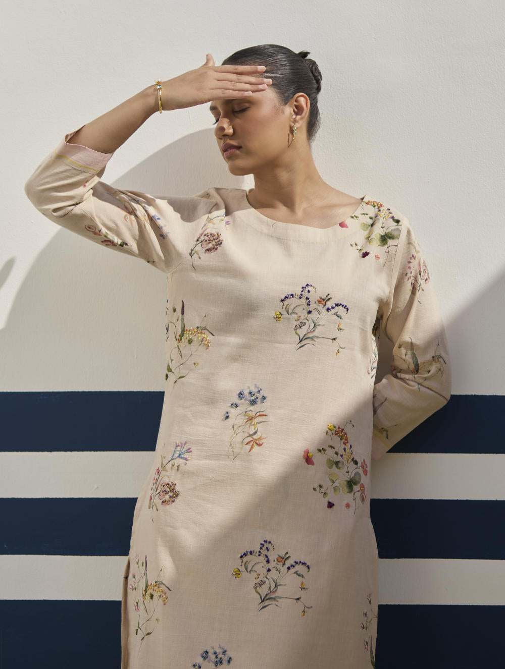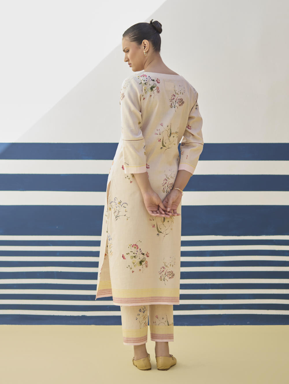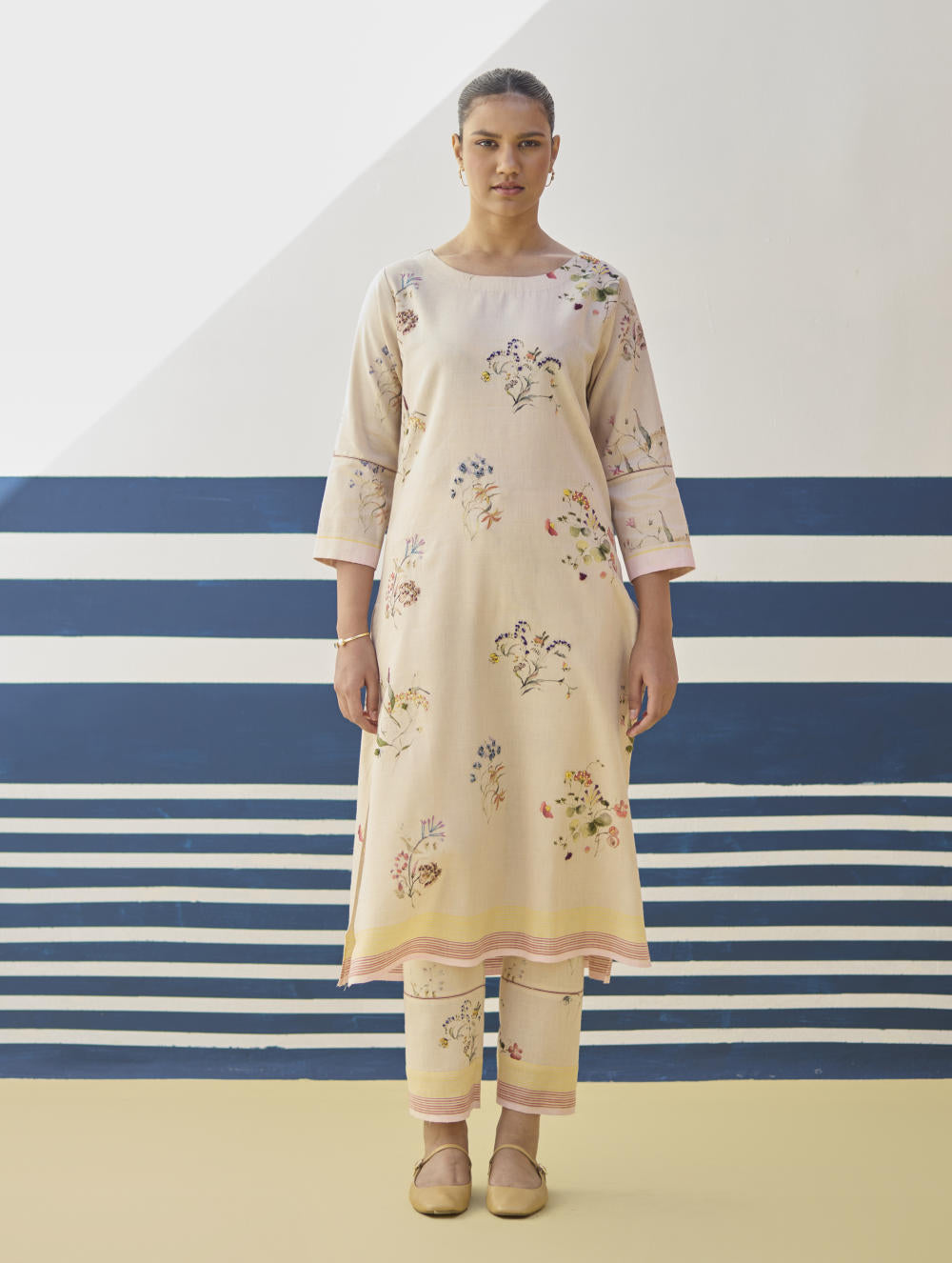 Kurta- Our favourite hand-embroidered printed boat-neck full sleeve kurta on handloom linen cotton with a handwoven stripe border. The kurta is detailed with a handmade jaali (mesh) stitch detail on the sleeves and has intricately hand-embroidered french knots and single thread hand-embroidery with multi-coloured yarn on the hand-illustrated multicolour floral print. Pant- A timeless tapered Watercolour floral printed pant handcrafted in our handloom linen cotton with a self-woven stripe border. The pant is detailed with an intricate jaali (mesh) stitch in a pop coloured thread. The pant has a drawstring, pockets and an elasticated back-waistband for a comfortable fit. Dupatta- A soft hand-woven dupatta with a multi-coloured stripe border in contrast colours on beautiful flowing sheer linen.