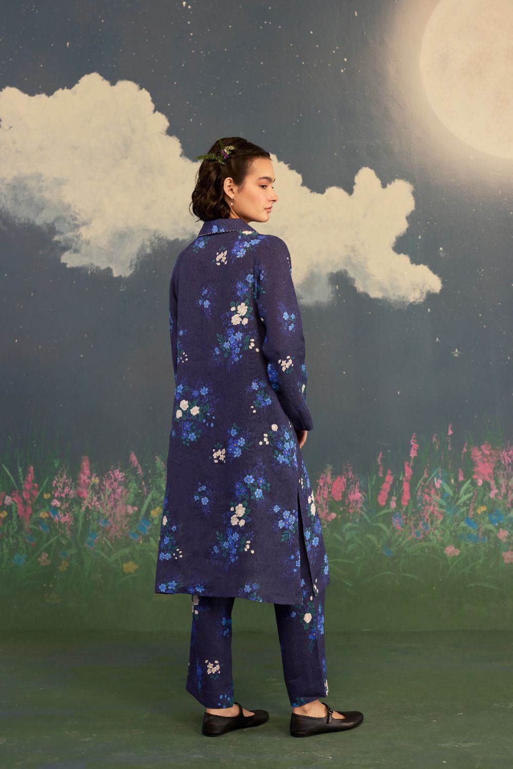 A fascinating midnight blue set in linen, is inspired by the Morning Glory, a flower known for its poetic bloom at daybreak. It celebrates renewal, grace, and the gentle unfolding of a new beginning. The deep backdrop acts like a night sky just before sunrise—intensifying the flower’s pastel radiance and allowing each bloom to glow with quiet luminosity.