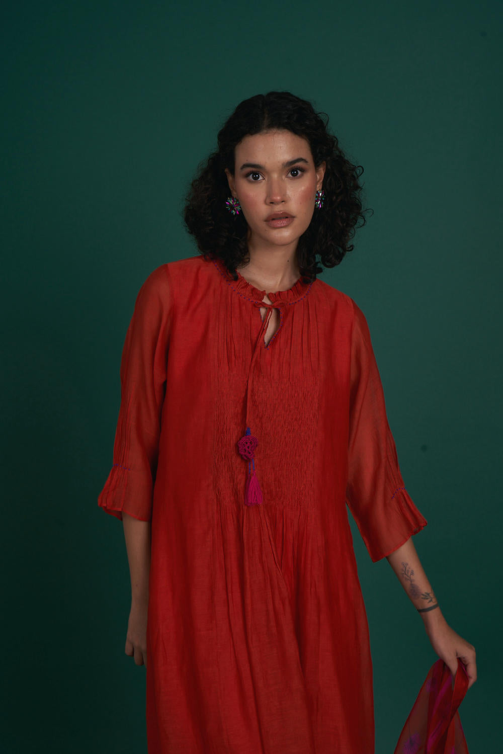 Intricate smocking, beadwork and crochet detailing are on this kurta set . A very festive silk organza dupatta in our signature print makes the outfit great pick