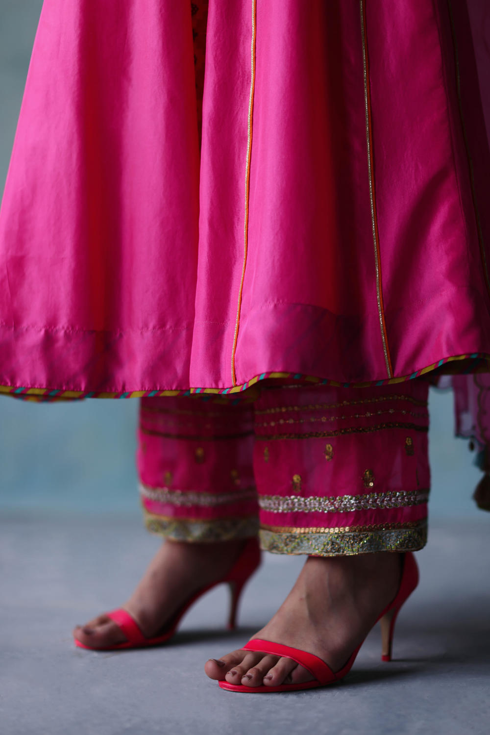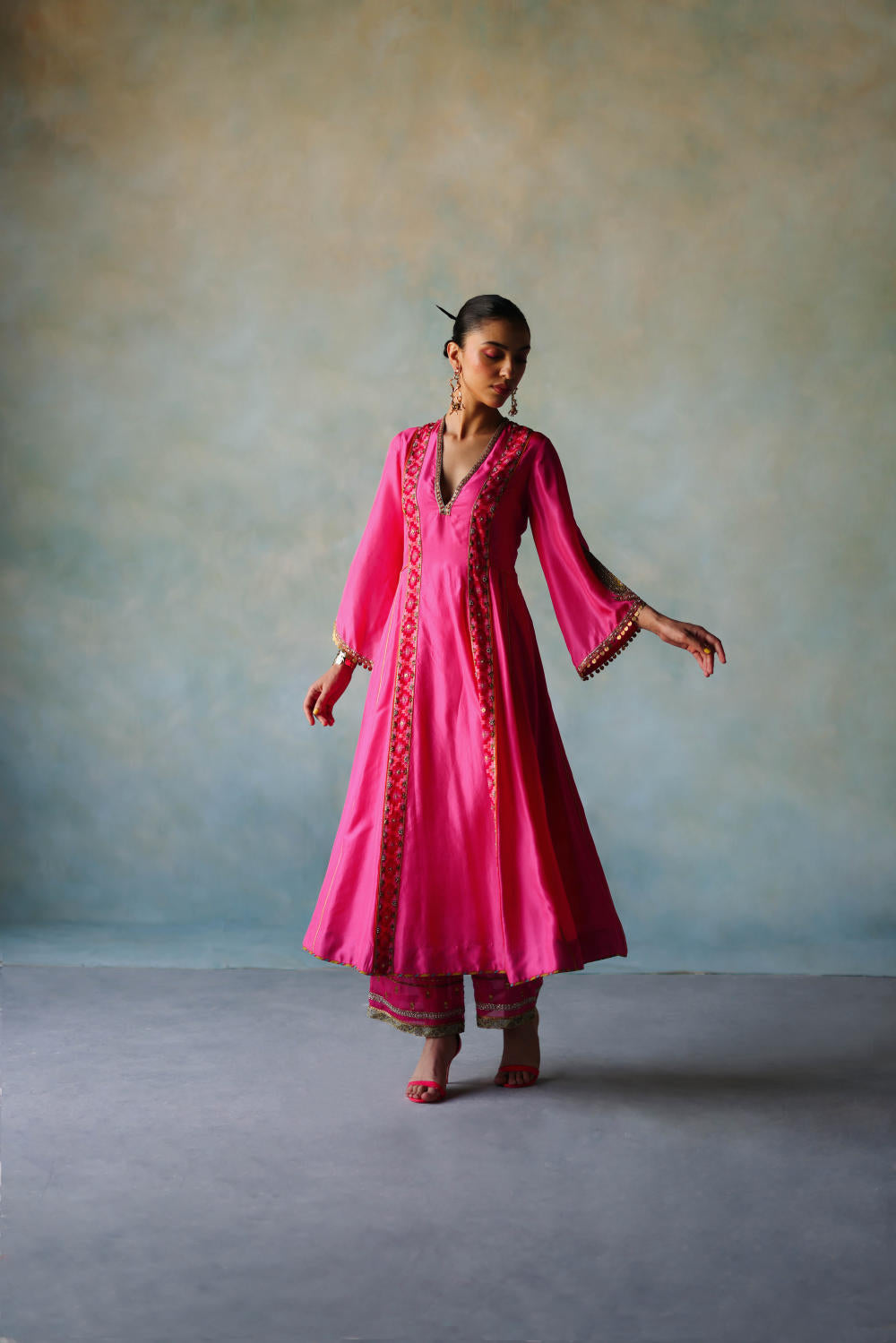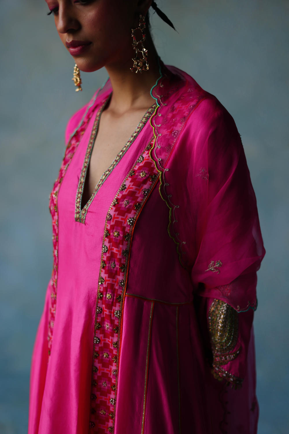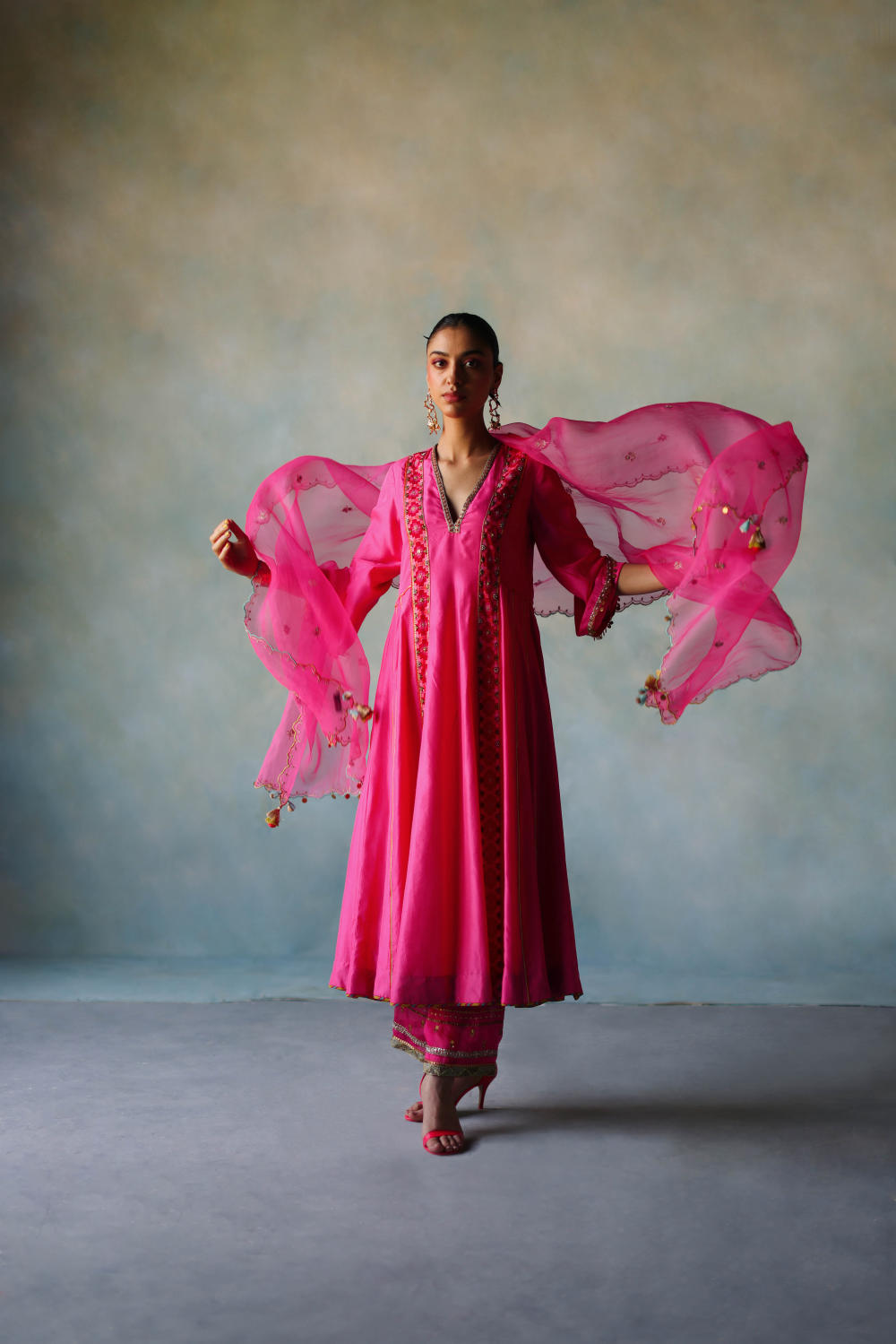 Hot Pink side kali kurta with hand embroidered neckline , sleeves and panel pattis paired with hand embroidered palazzo. Along with dori embroidered hot pink organza dupatta with scallops n tassels detailing.
