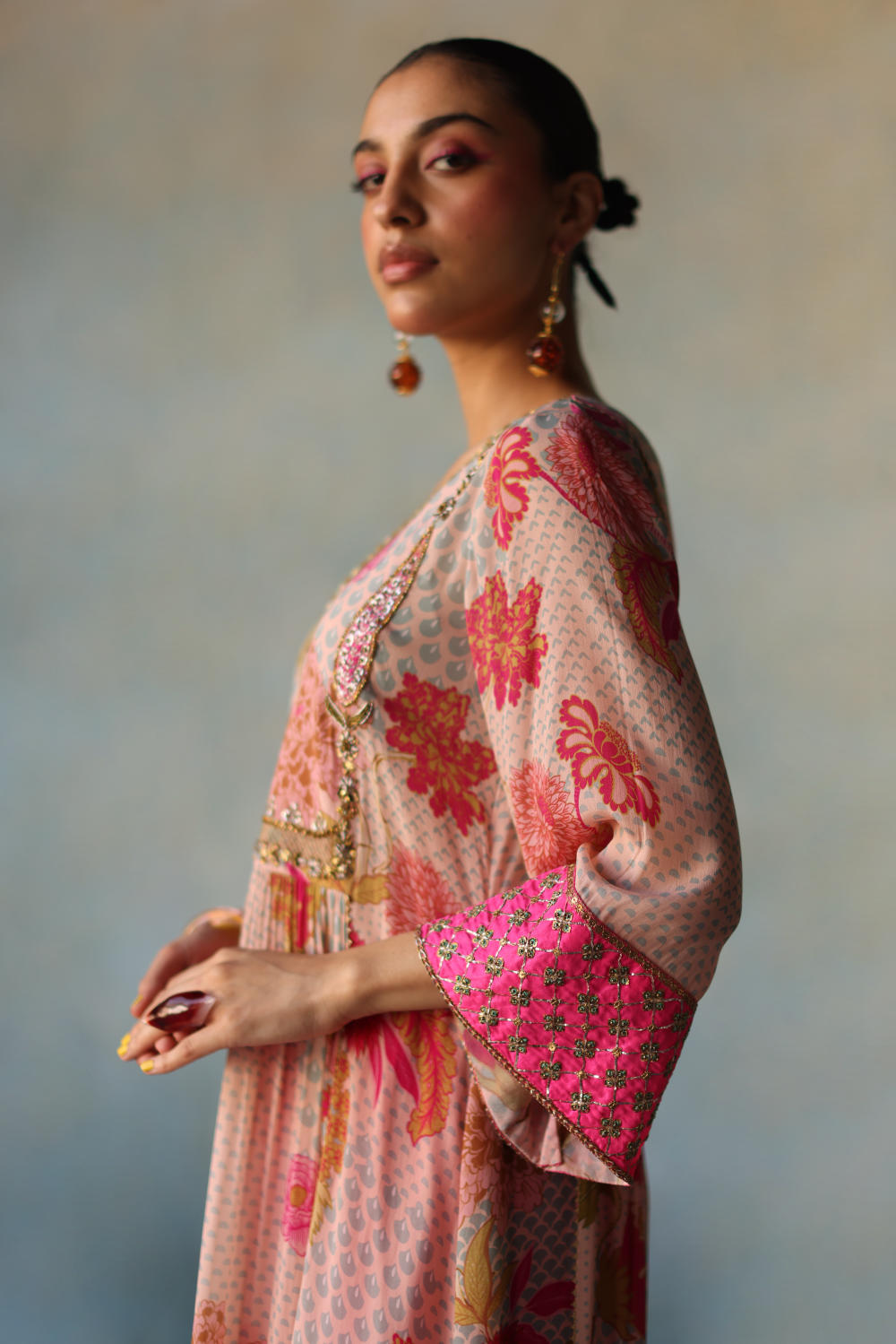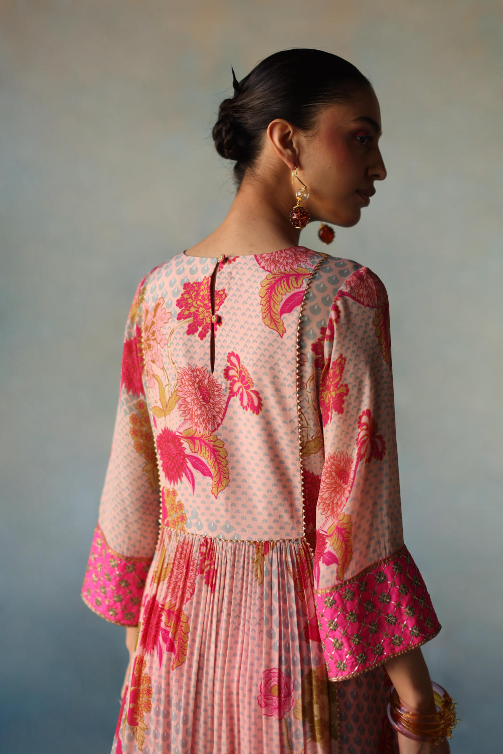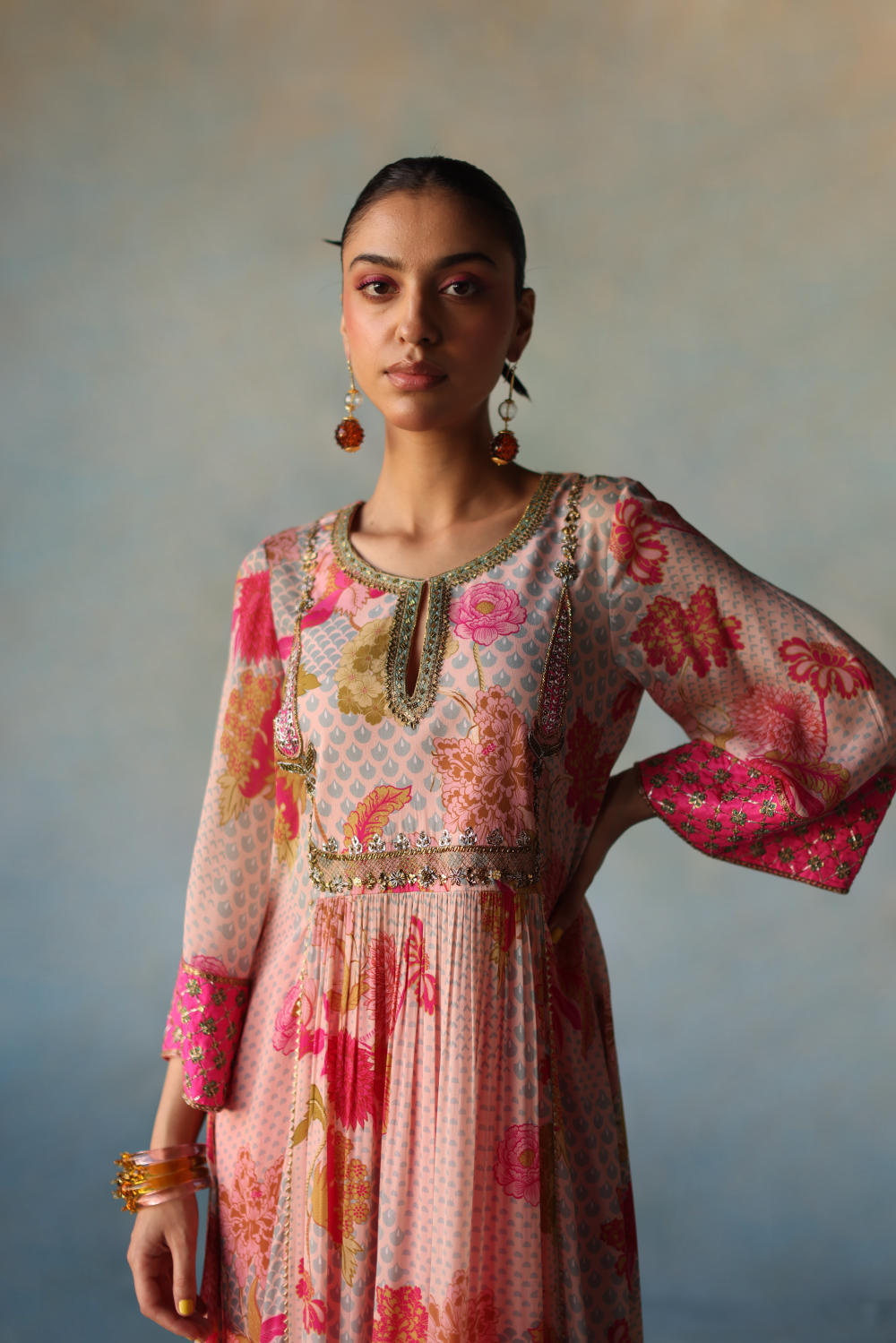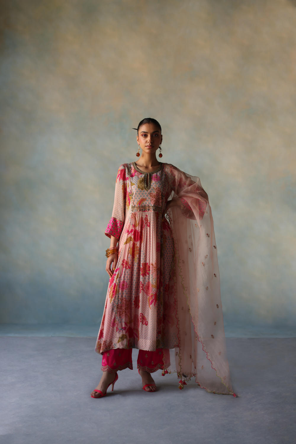 Nude Pink printed front puckering crepe kurta with intricate embroidery on yoke and sleeves , paired with hot pink modal palazzo with applique dori embroidery and nude pink organza dupatta with dori work scallops and tassel detailing.