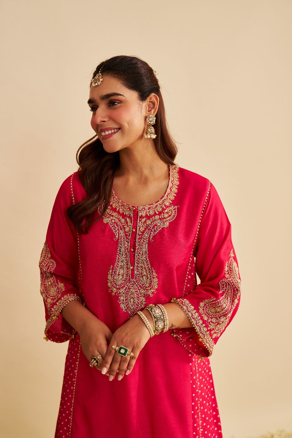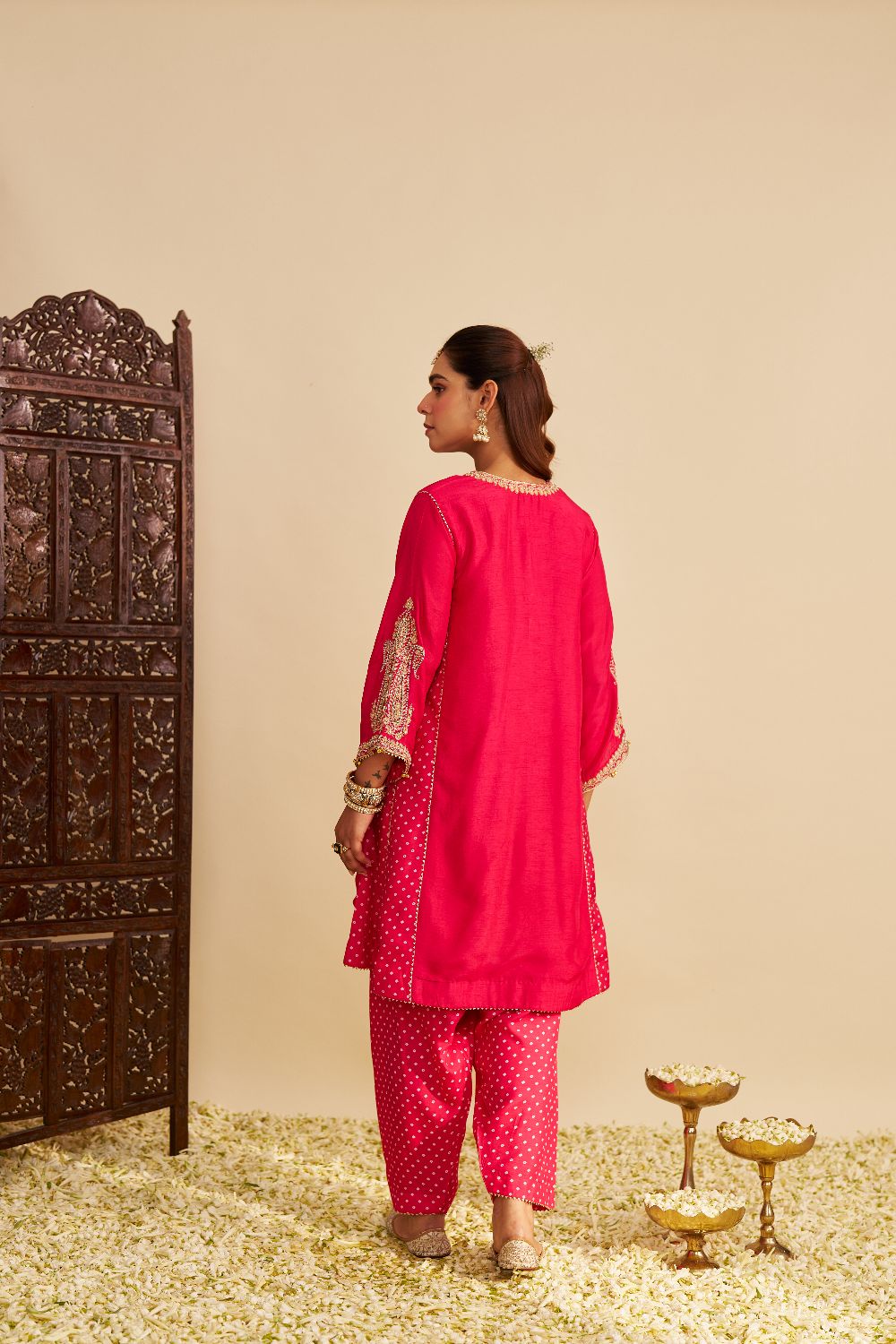 The kalis of the chauga are crafted in traditional Bandhej fabric and paired with a matching Bandhej Dogri salwar, adding vibrant texture and cultural richness to the ensemble.