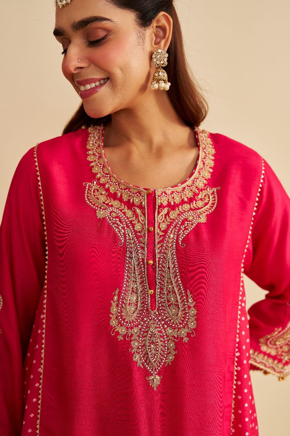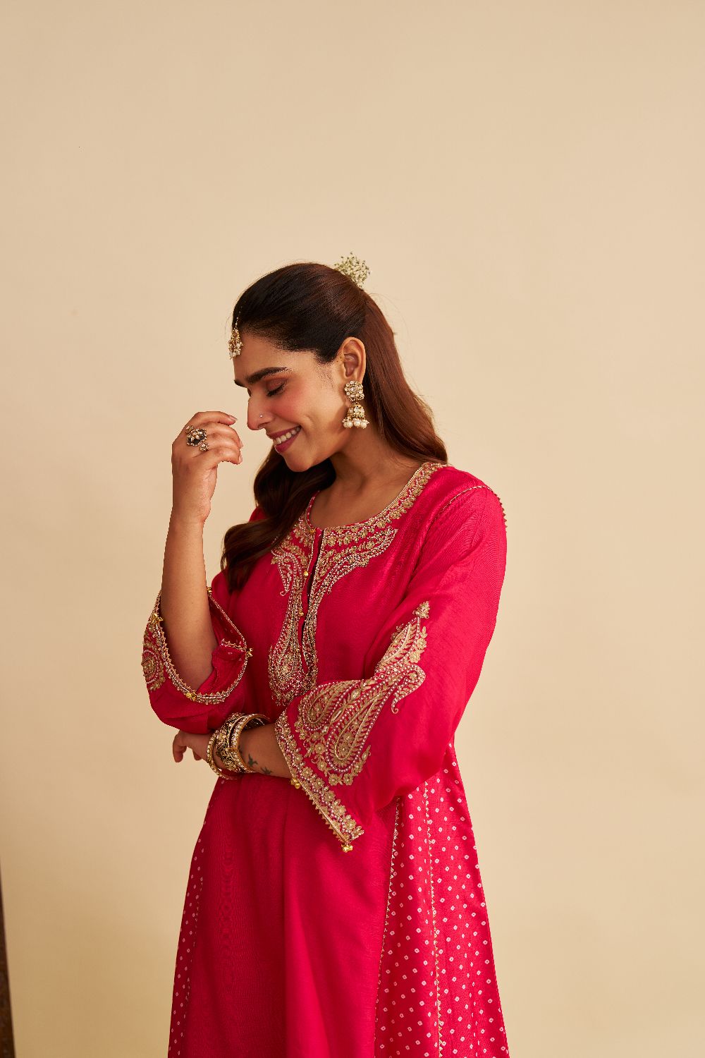 Intricate Aari Tilla embroidery, enhanced with delicate pearls, sequins, and dabka zardozi work, lends a soft shimmer and opulent finish. Accented with Bandhej and gota detailing, this ensemble beautifully blends timeless craftsmanship with modern elegance.