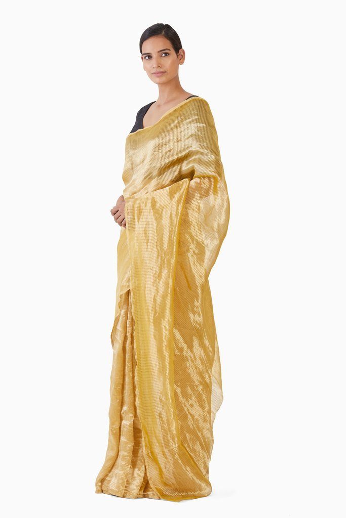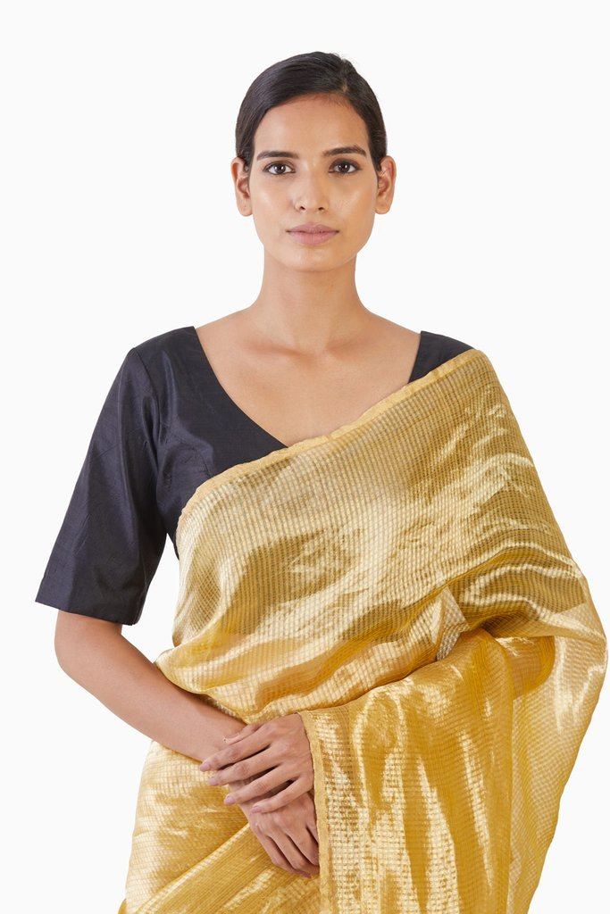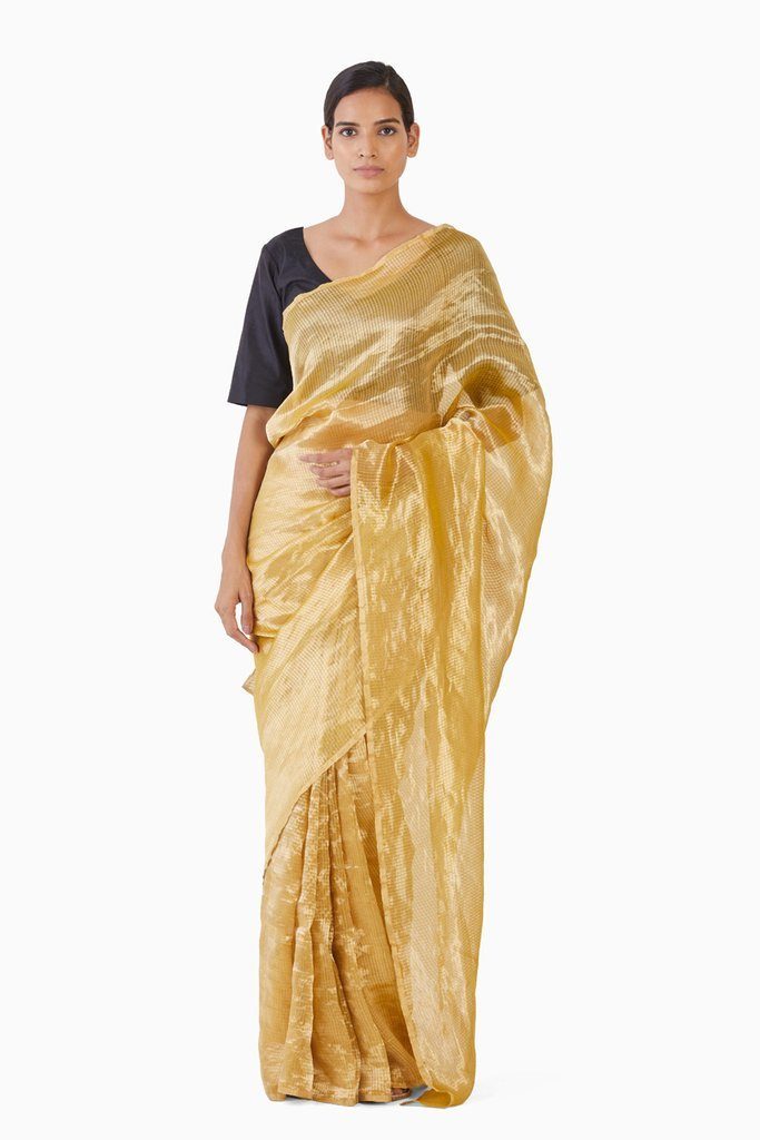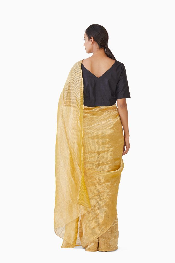 Handwoven in fine Silk & Zari on a traditional loom in central India. the saree is medium weight making it easy to carry. This is an innovative smart mix of materials ; devoid of any traditional motif, the minimal glaze makes it a must have due to the optical appeal.