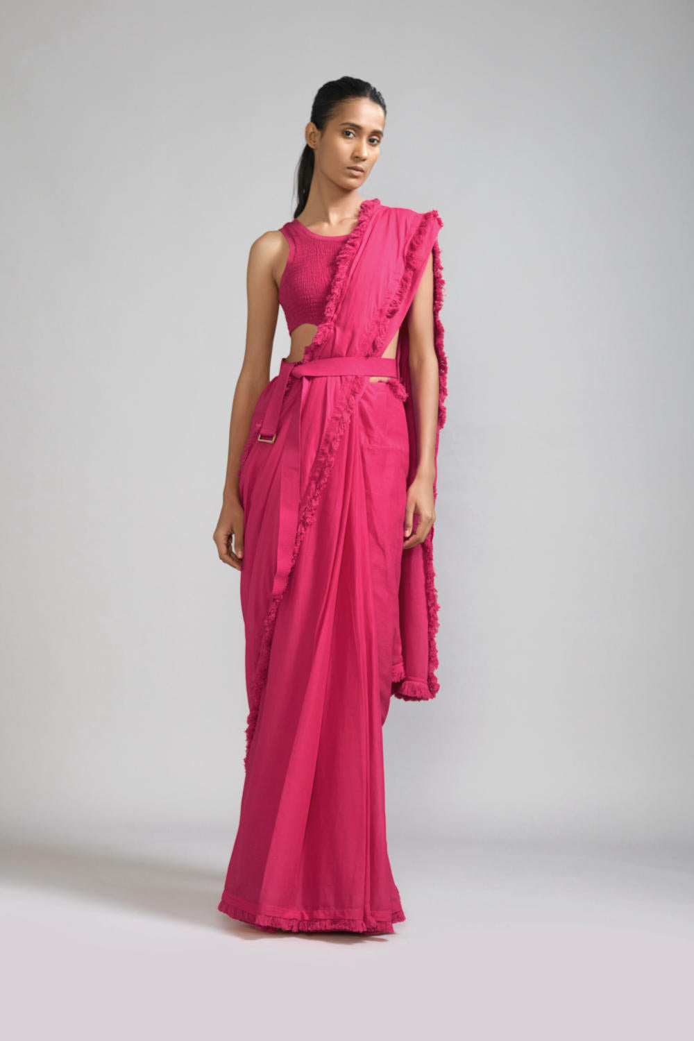 A modern mul saree with fringe-detailing on the borders