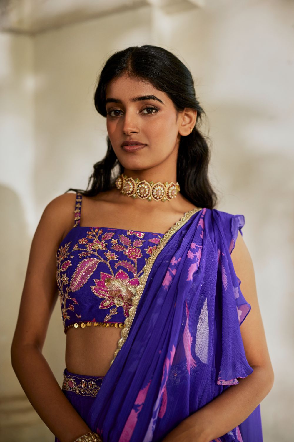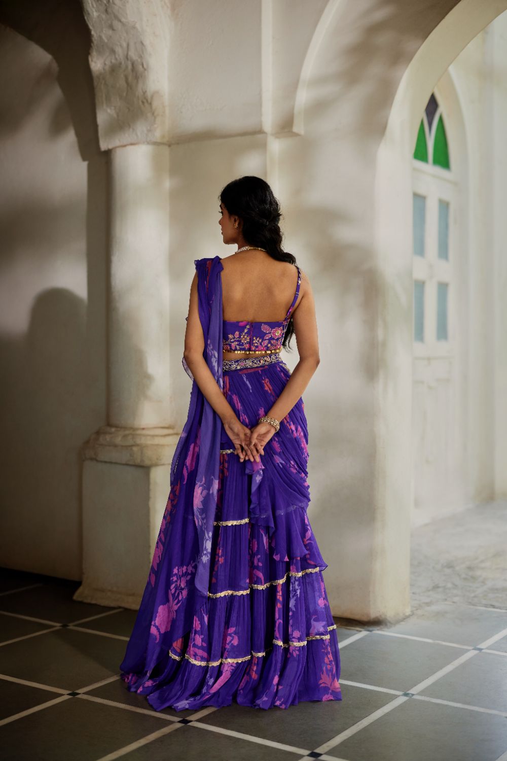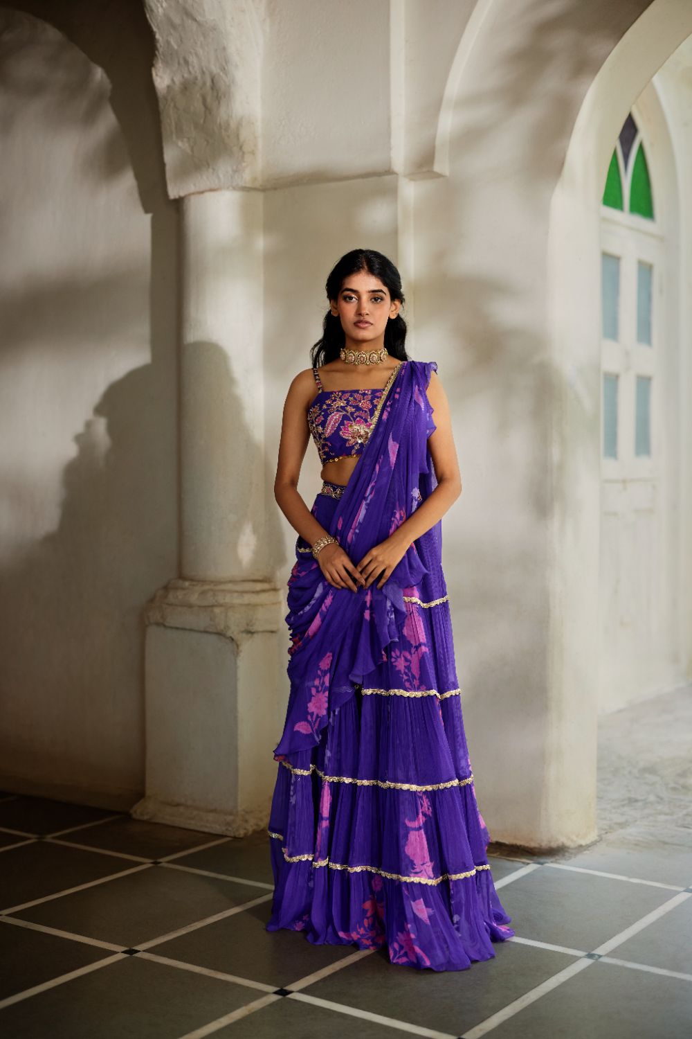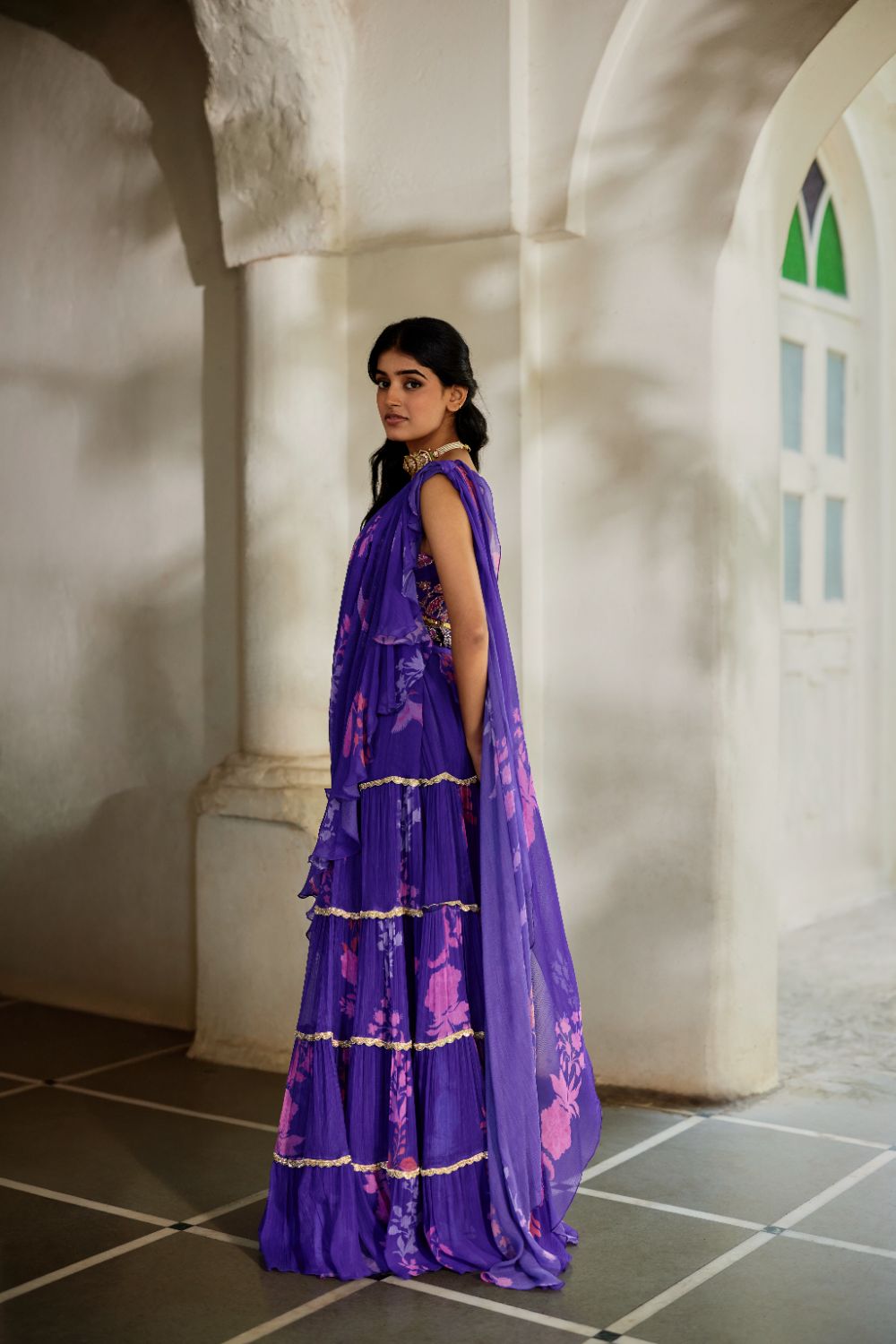 A purple pre-stitched saree with delicate floral prints, evoking the charm of a bygone era. The tiered saree features embroidered borders on each layer and the pallu, paired with a hand-embroidered belt. Completed with a beautifully hand-embroidered blouse, this ensemble radiates timeless elegance.