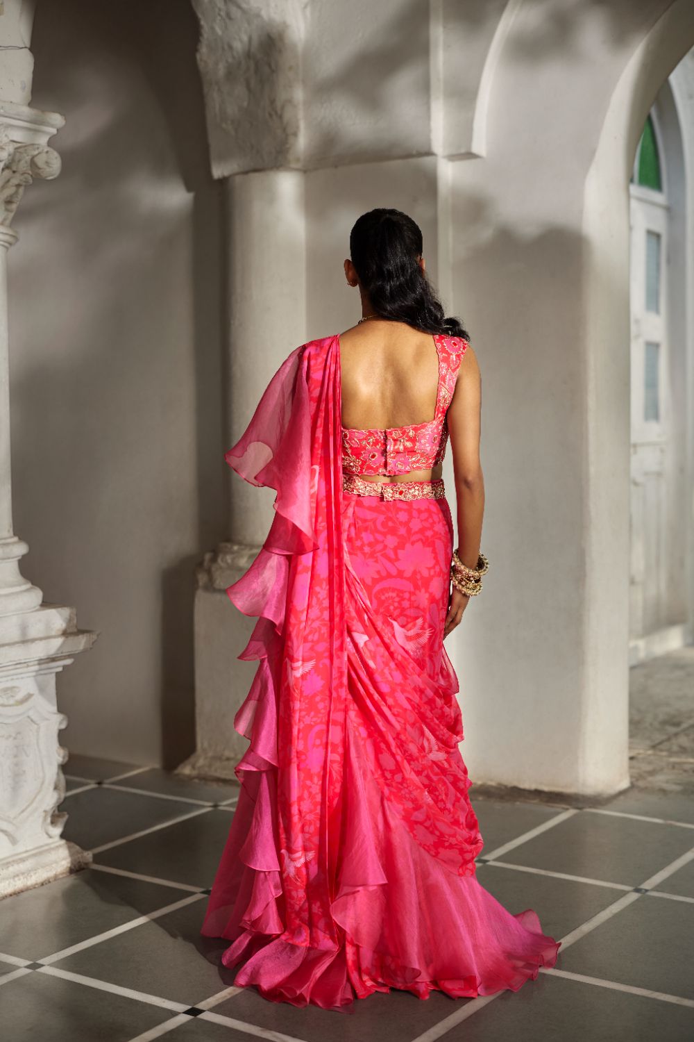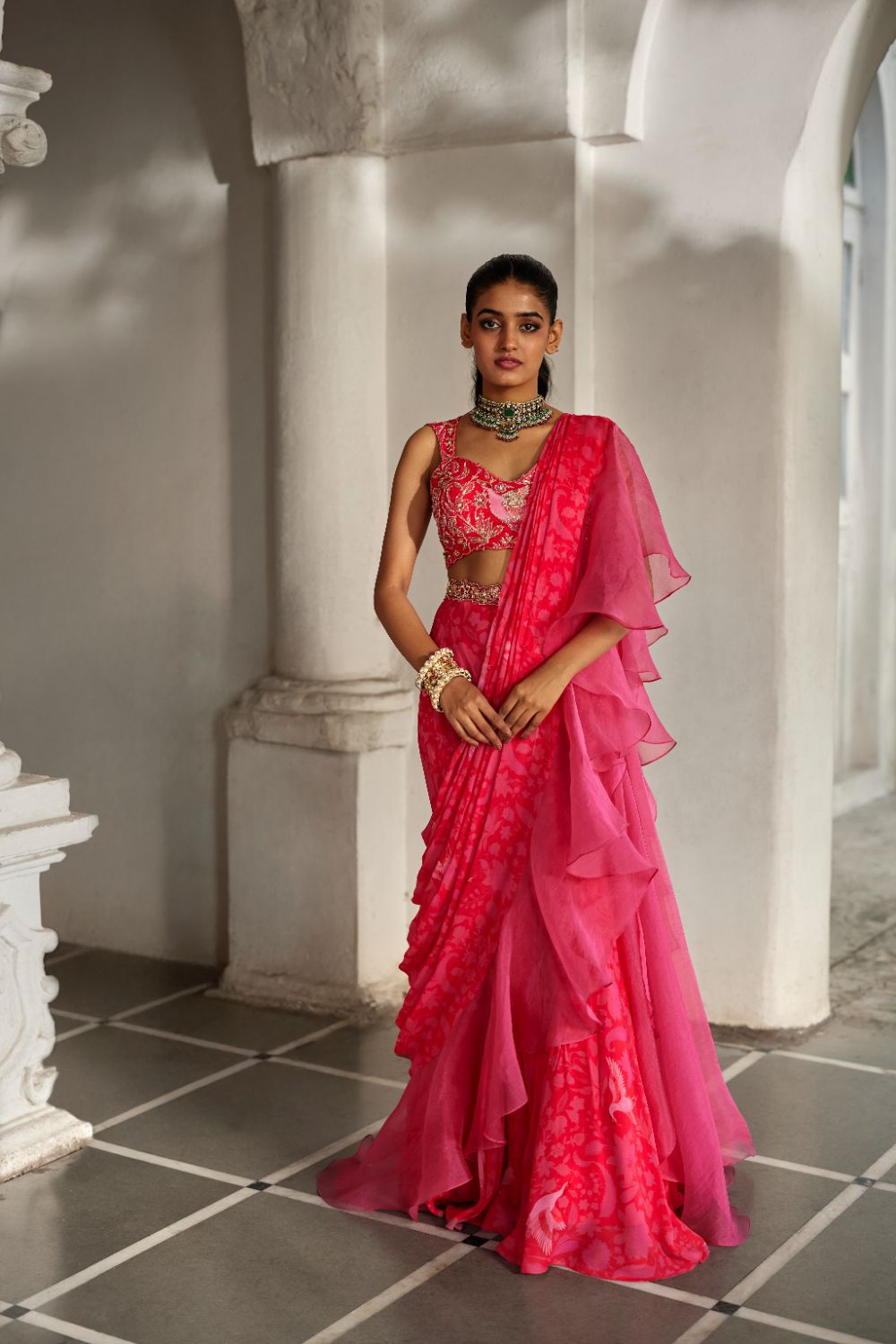 Step into timeless elegance with this red pre-stitched saree, adorned with a subtle mono floral print that captures the romance of a bygone era. Paired with a meticulously hand-embroidered blouse, this ensemble exudes grace and sophistication, making it perfect for festive occasions and special celebrations.