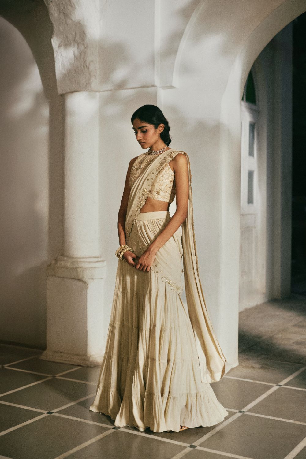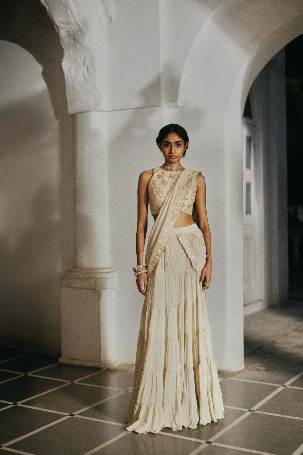 Featuring our Ivory Solid Georgette Pre-Draped Saree, designed in a tiered silhouette with embroidered pallu adding a touch of refined artistry, while the fully embroidered blouse showcases intricate couchni and zardosi work, reflecting timeless craftsmanship and luxurious detail. this ensemble blends traditional embroidery techniques with a contemporary silhouette perfect for festive occasions, and elegant soirées,