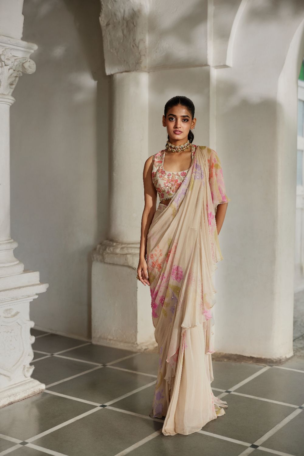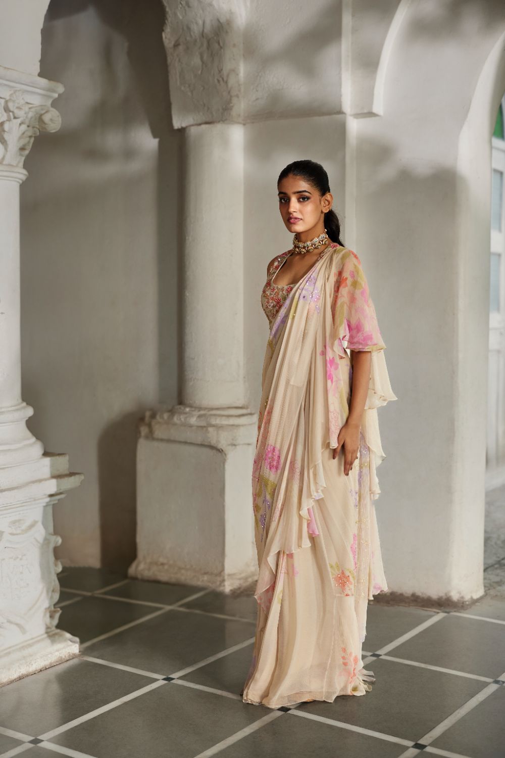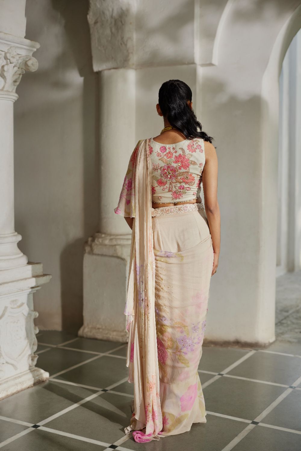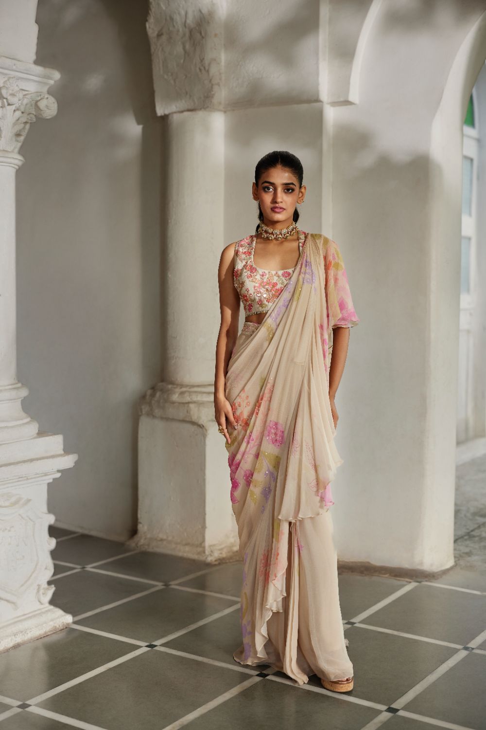 Introducing timeless elegance in our Ivory Chiffon Saree, featuring delicate floral motifs and exquisite hand-embroidered detailing. The pre-draped silhouette ensures effortless grace, while the heavily embroidered blouse is enhanced with charming hanging embellishments along the waistline, adding a touch of playful sophistication. Perfect for weddings, festive occasions, and special celebrations,
