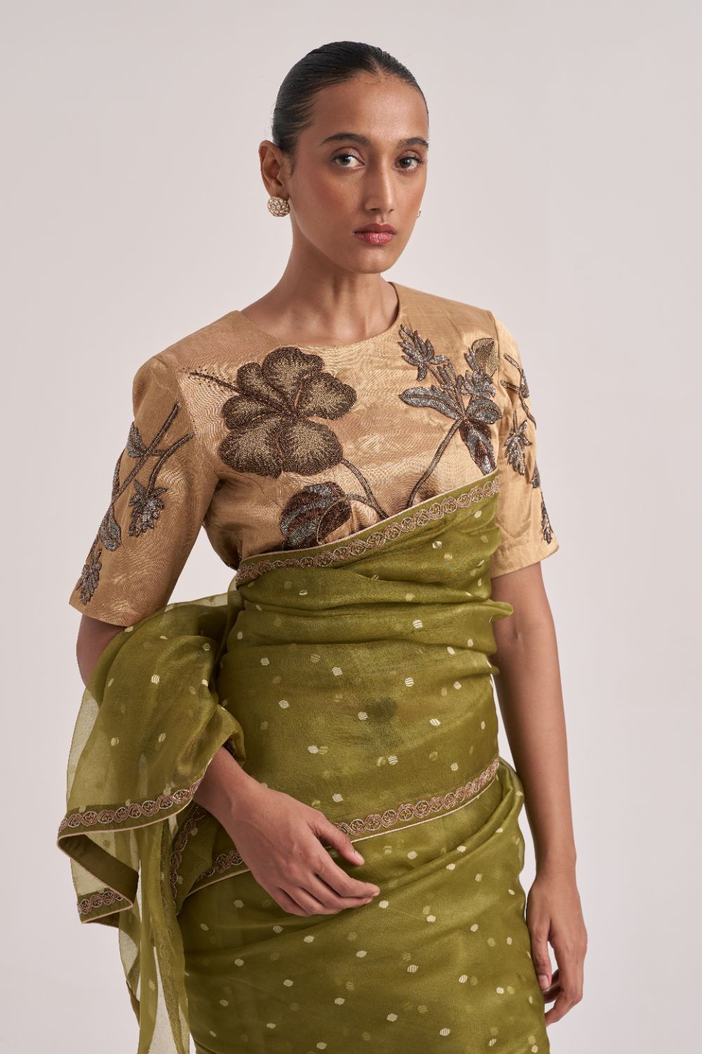 A Mehendi Green Polka Handwoven Organza Jacquard Silk Sari Detailed With A Bead Hand Embroidered Border.