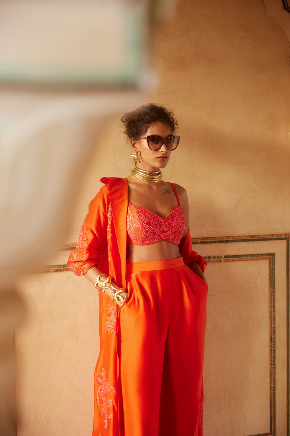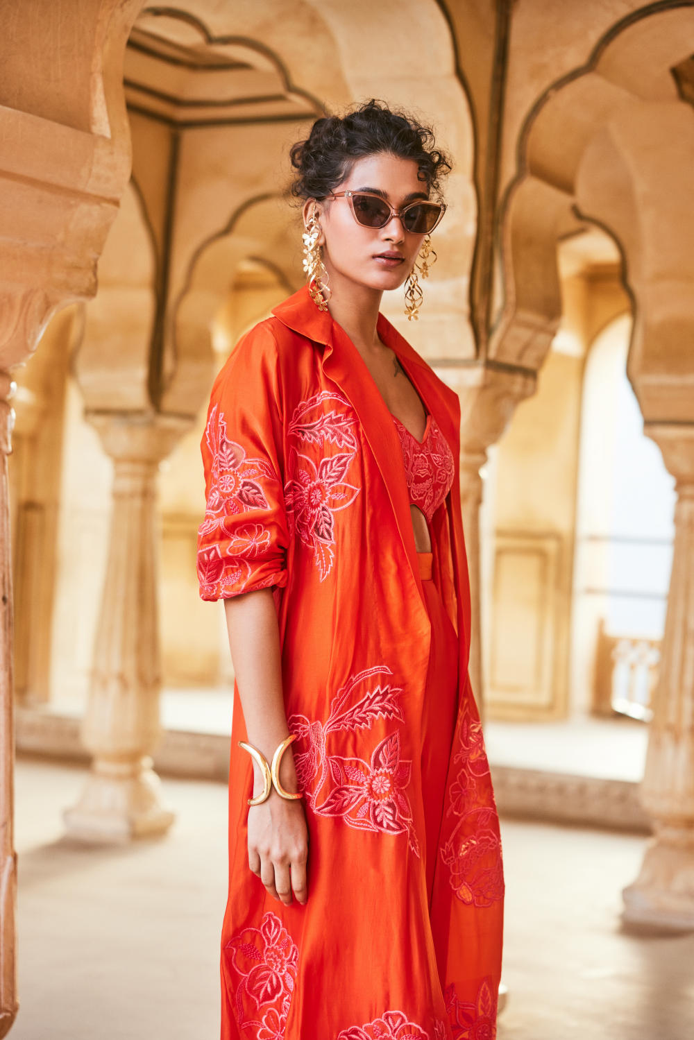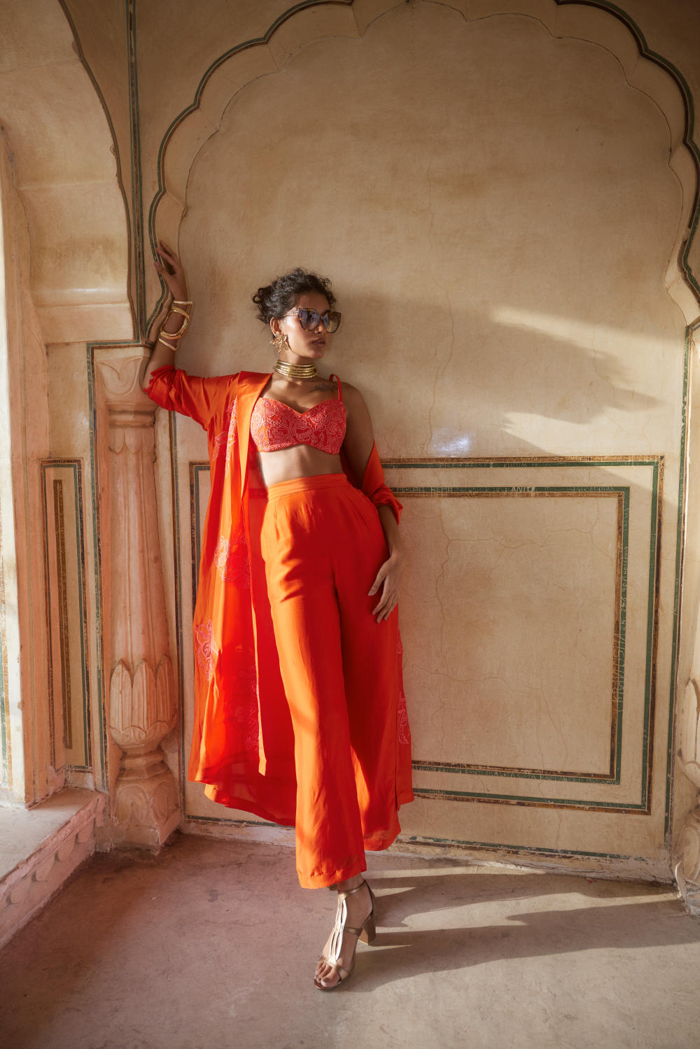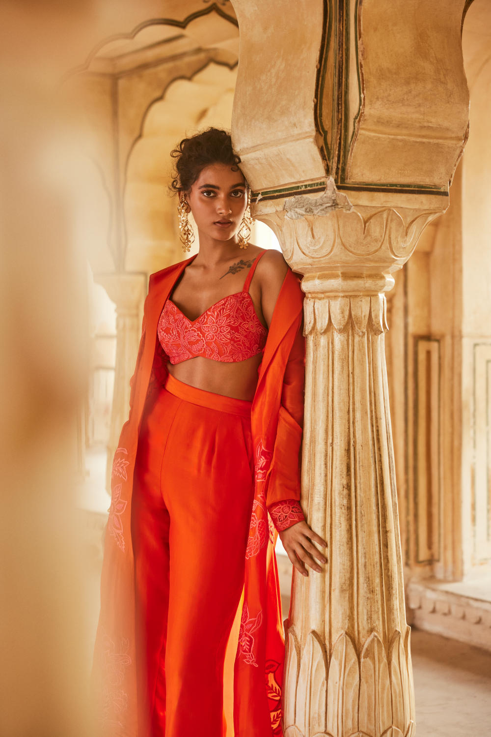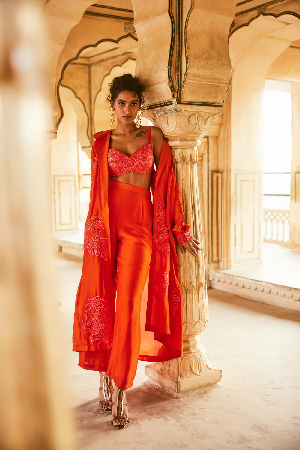 Every collection begins long before the garment is stitched: months of research into India’s rich craft traditions, followed by the painstaking creation of detailed illustrations. These artworks are then scanned, enhanced with jewel-toned palettes and touches of rich gold, and finally translated onto fabric. The result is a visual language so distinct that their name has become synonymous with print, colour, and the kind of glamour that still feels feather-light.