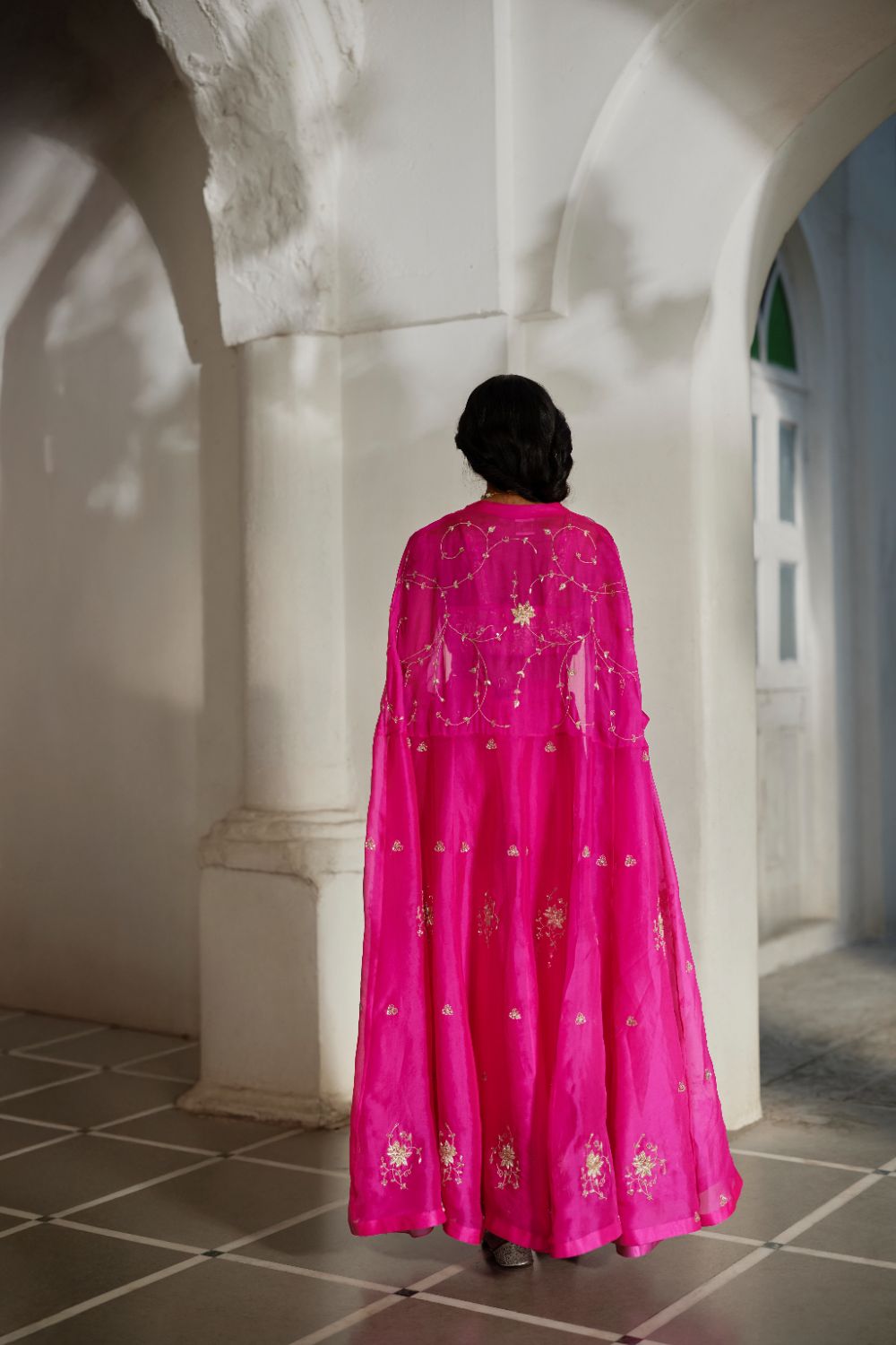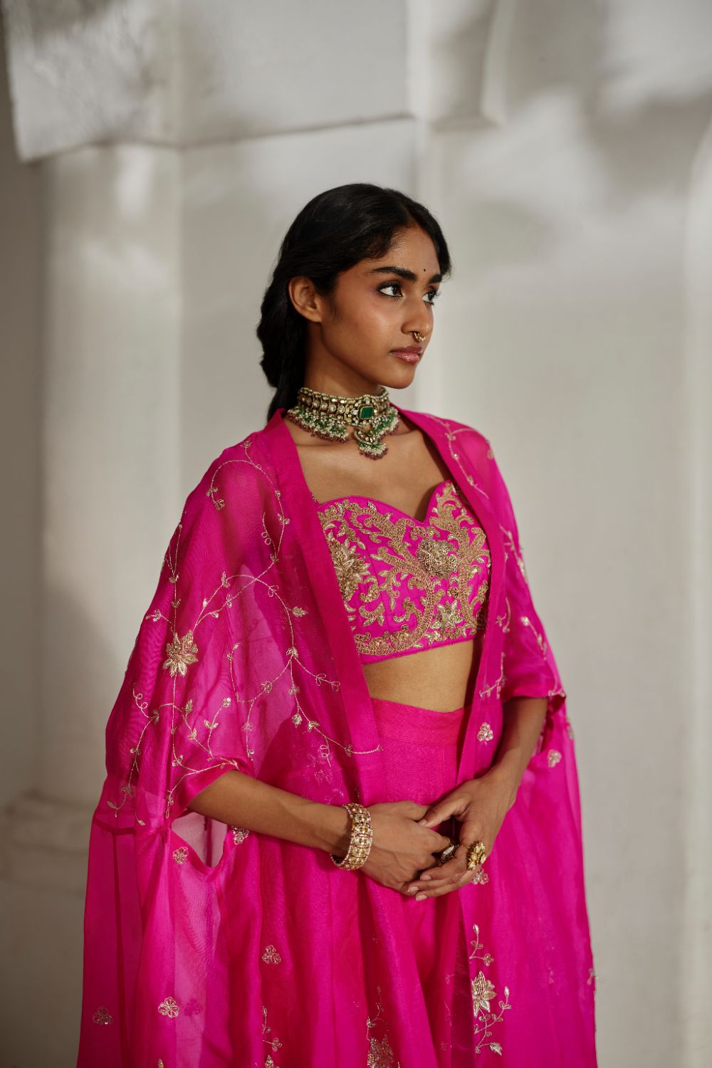 Introducing vibrant hot pink ensemble, featuring a blouse, panelled cape, and organza palazzo. The blouse and cape are meticulously hand-embroidered using aari and zardozi techniques, while the panelled cape adds a dramatic, luxurious silhouette. Ideal for weddings and festive occasions, this ensemble radiates elegance and grandeur.