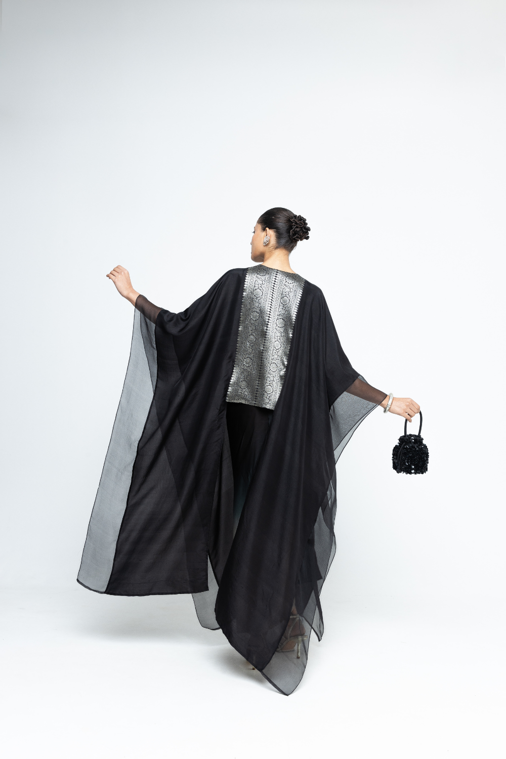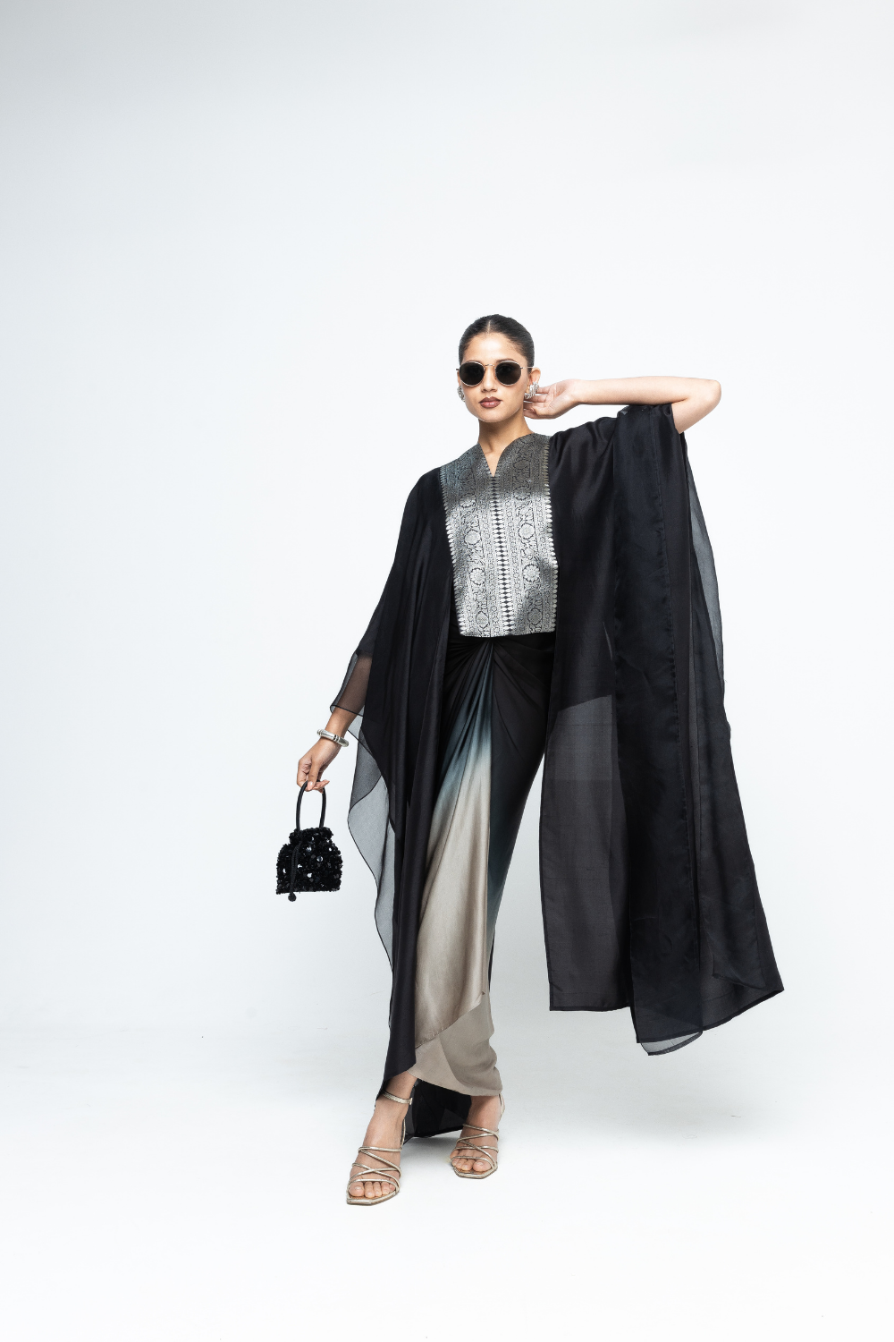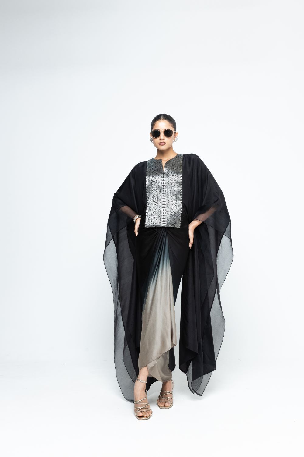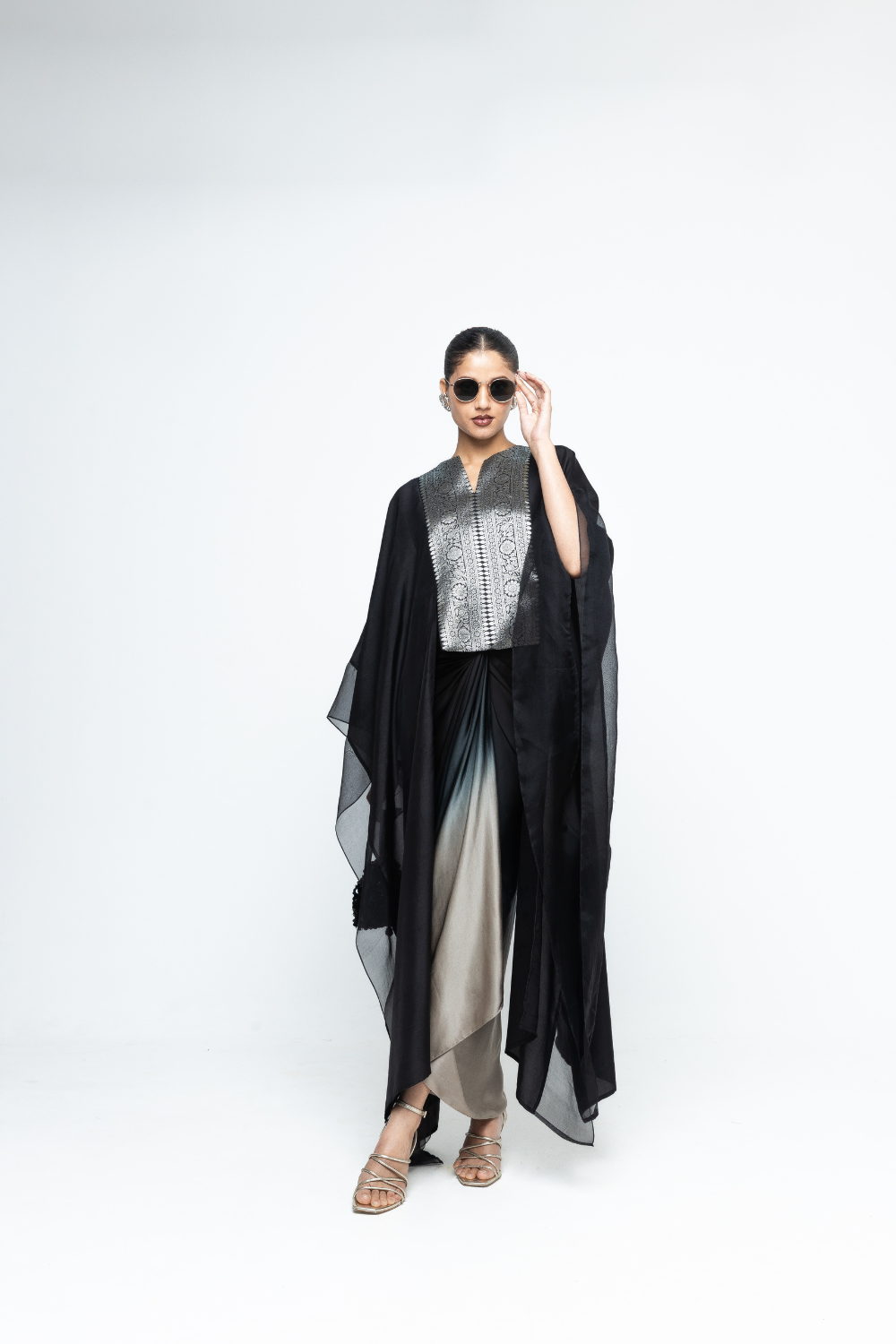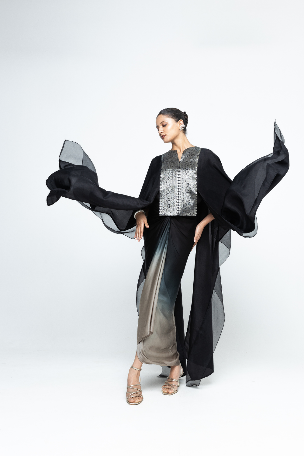 Black Flowy Silk cape with Brocade neck and back detail and organza finish paired with an Ombre Assymetrical tie detail Dress