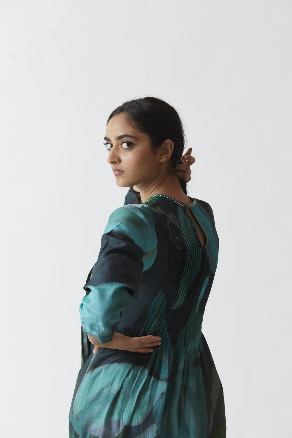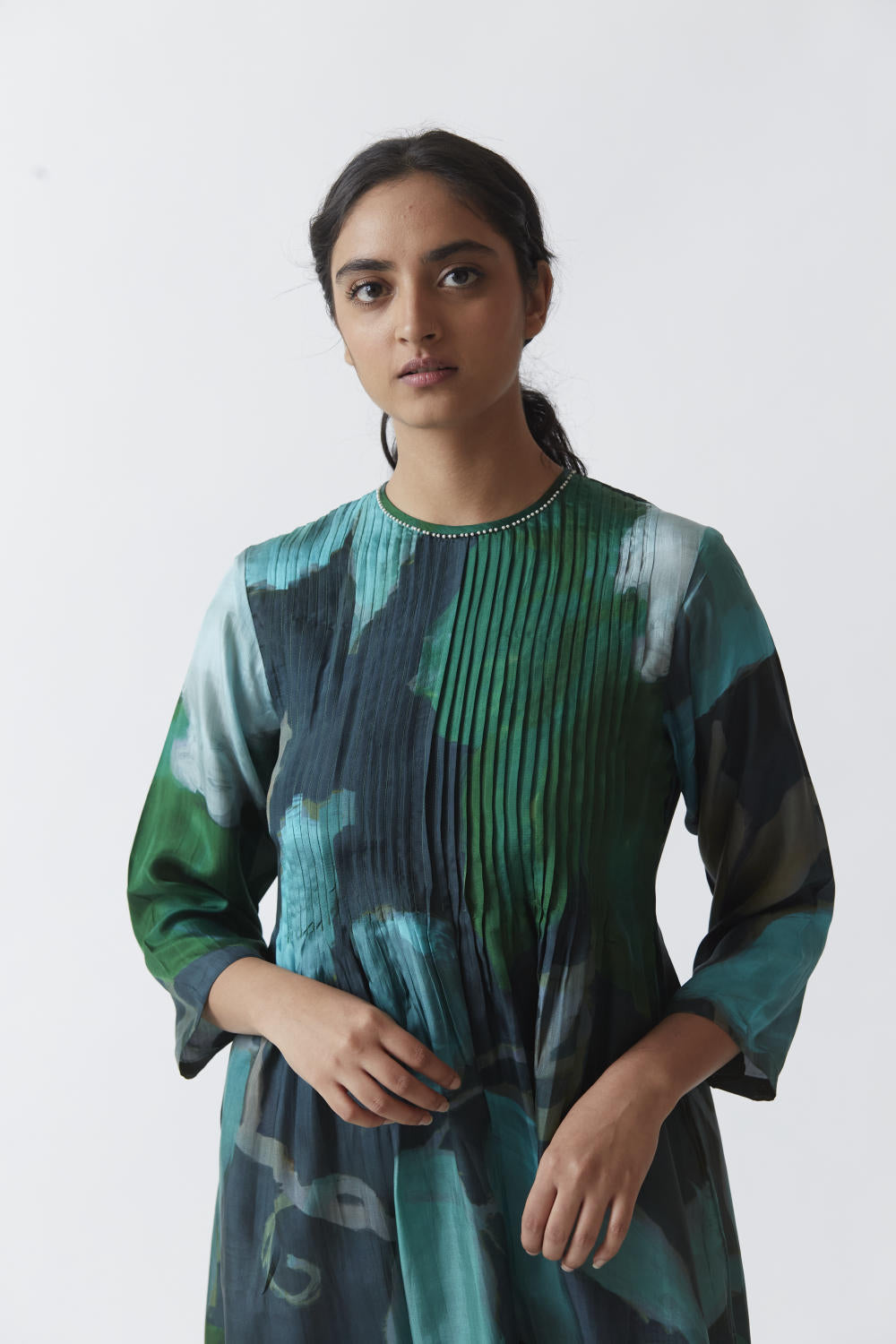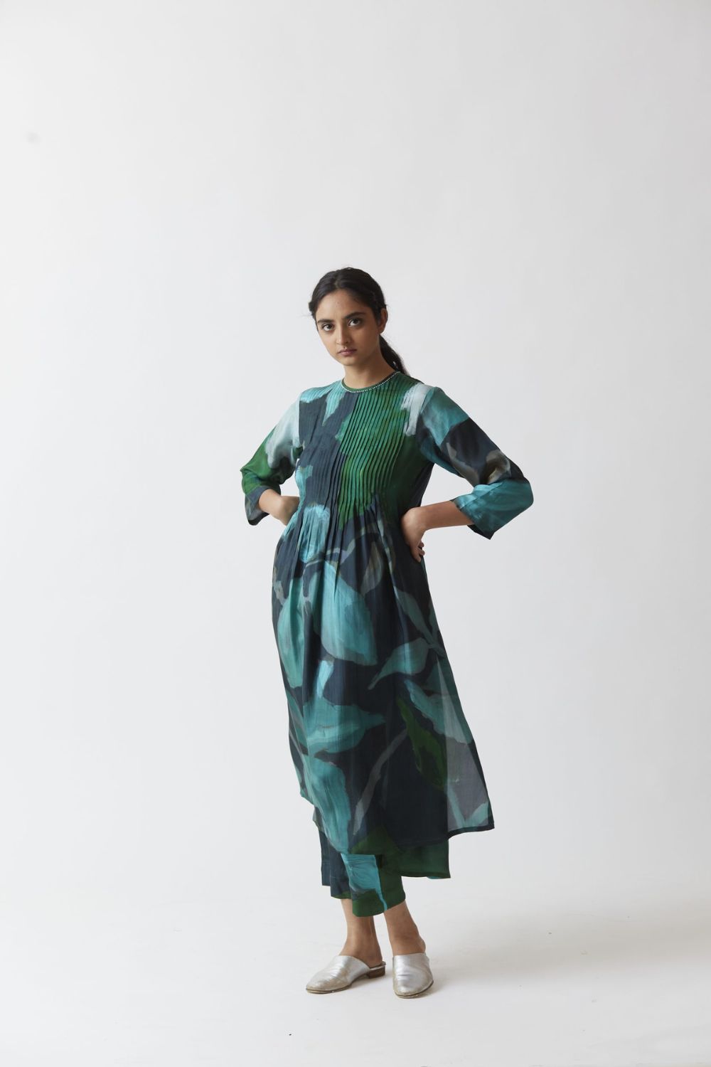 The set is crafted in the Jade print carefully printed on Pure silk featuring white pearls on the neck.