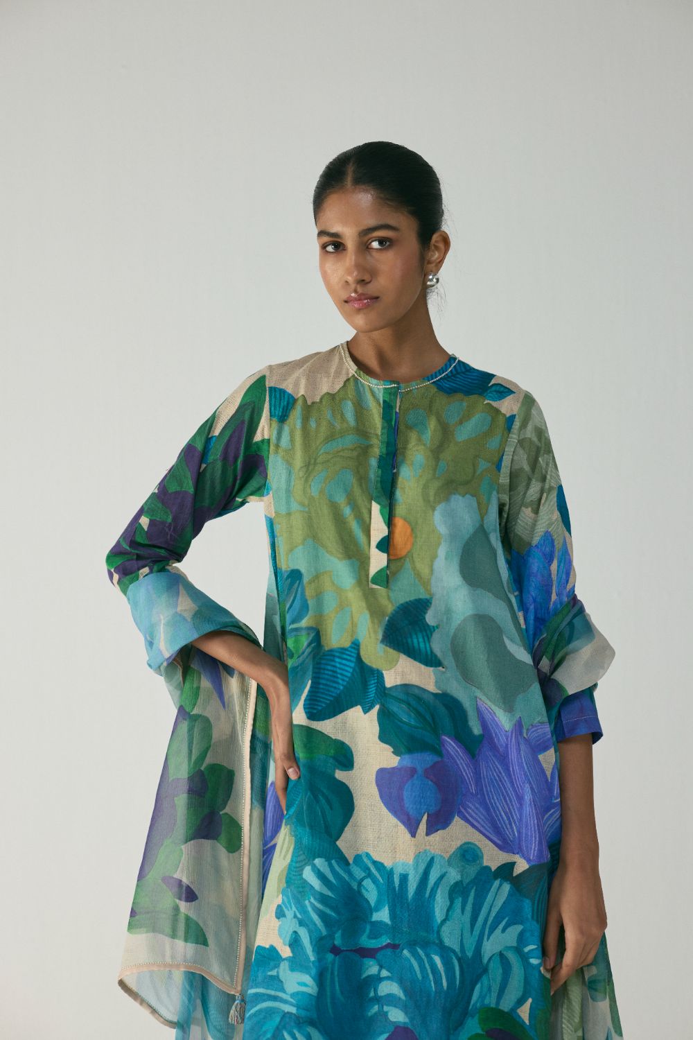 This elegant kurta set brings together effortless comfort and contemporary botanical artistry. Designed in a relaxed straight silhouette, the kurta features a clean round neckline with a front placket, full sleeves, and a fluid drape that flatters all body types. Paired with matching printed trousers and a lightweight, sheer dupatta, this ensemble creates a coordinated look with beautiful movement and sophistication. Crafted from breathable, soft fabric, it is ideal for daytime dressing, relaxed festive wear, or elevated casual outings.